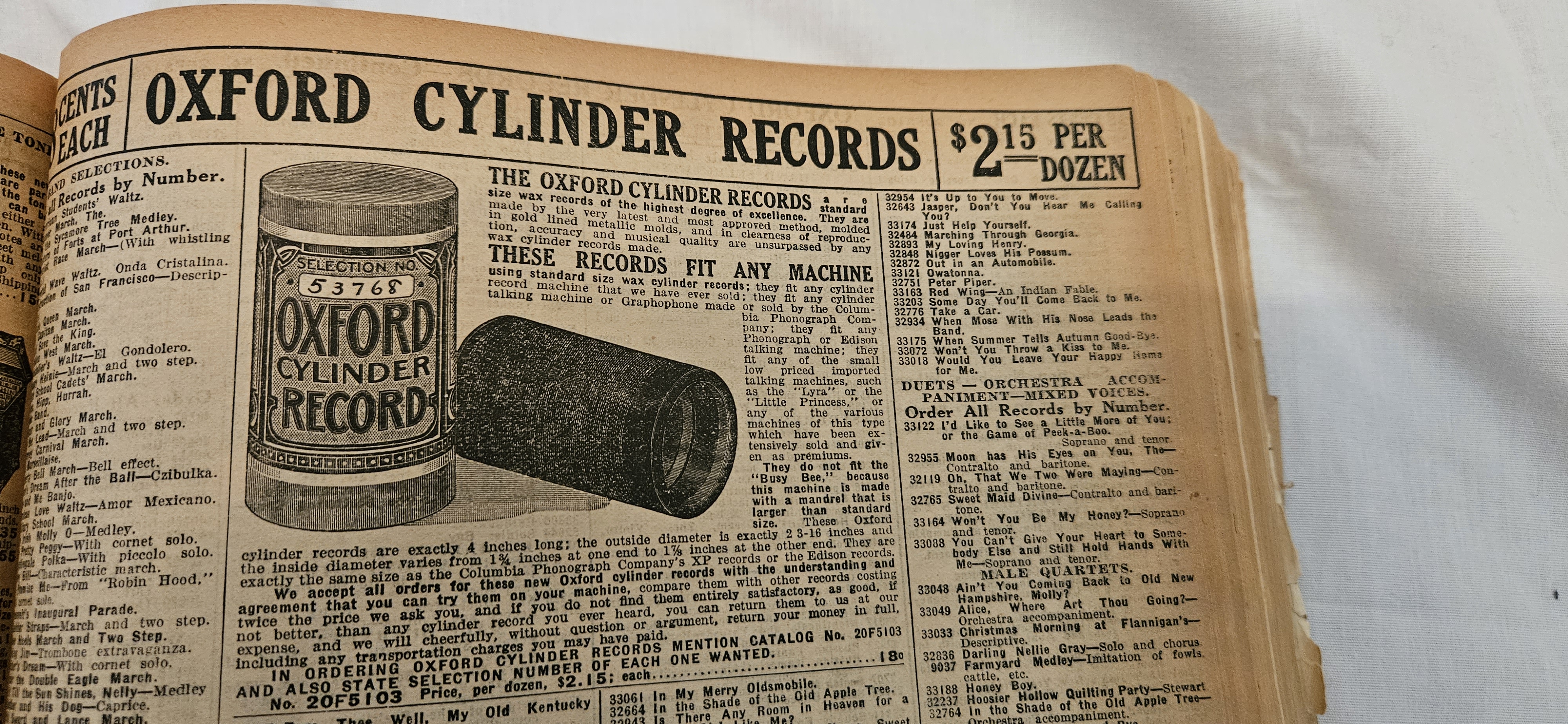 4 Sears & Roebuck 1911 Catalog - This catalog is original and in good condition. These catalogs were meant to be throw away so the fact that this one is in the condition it is, is amazing. Some great Columbia/Oxford information in this catalog with so many other technological items from the past. There is one torn page in the back, which does not affect anything phonograph related. Very scarce and hard to find. Price is $100 SOLD.