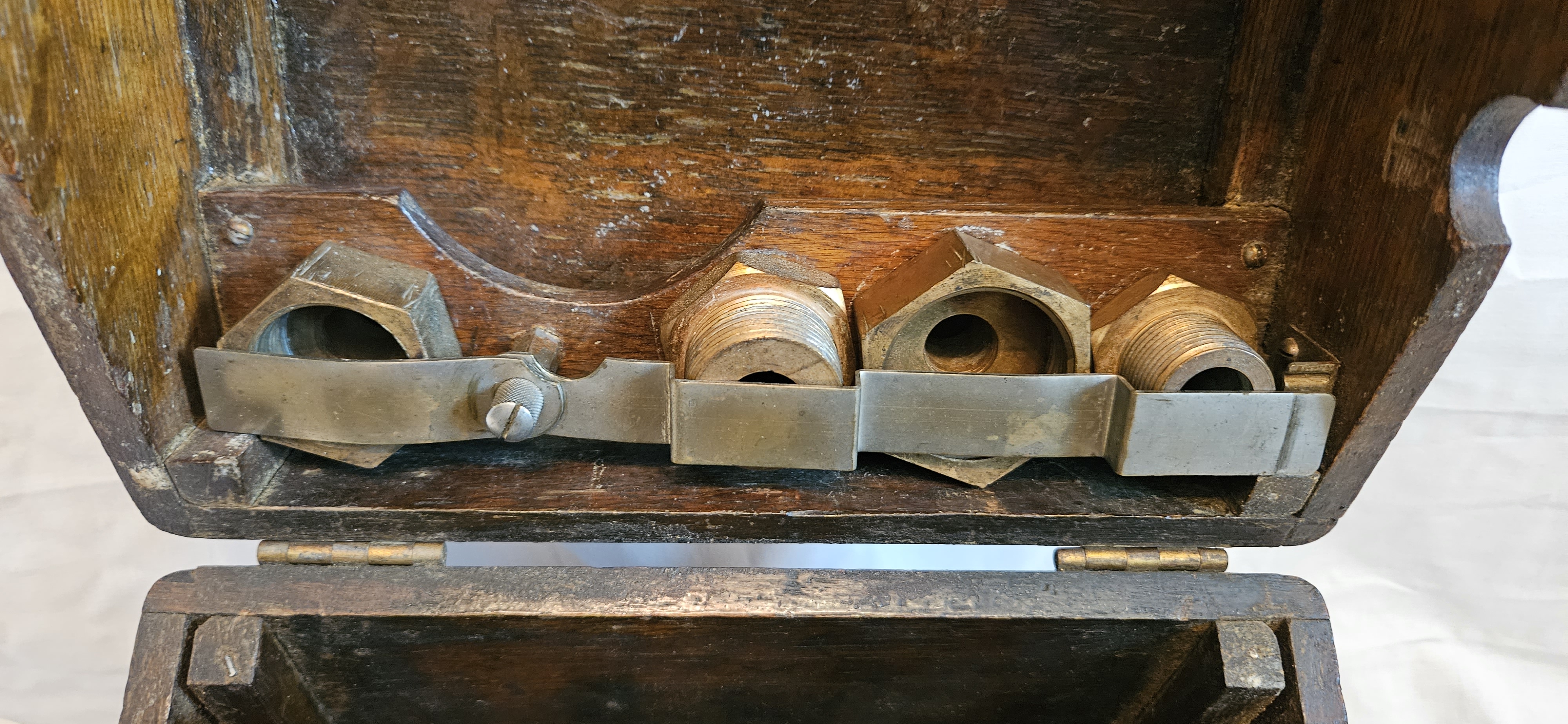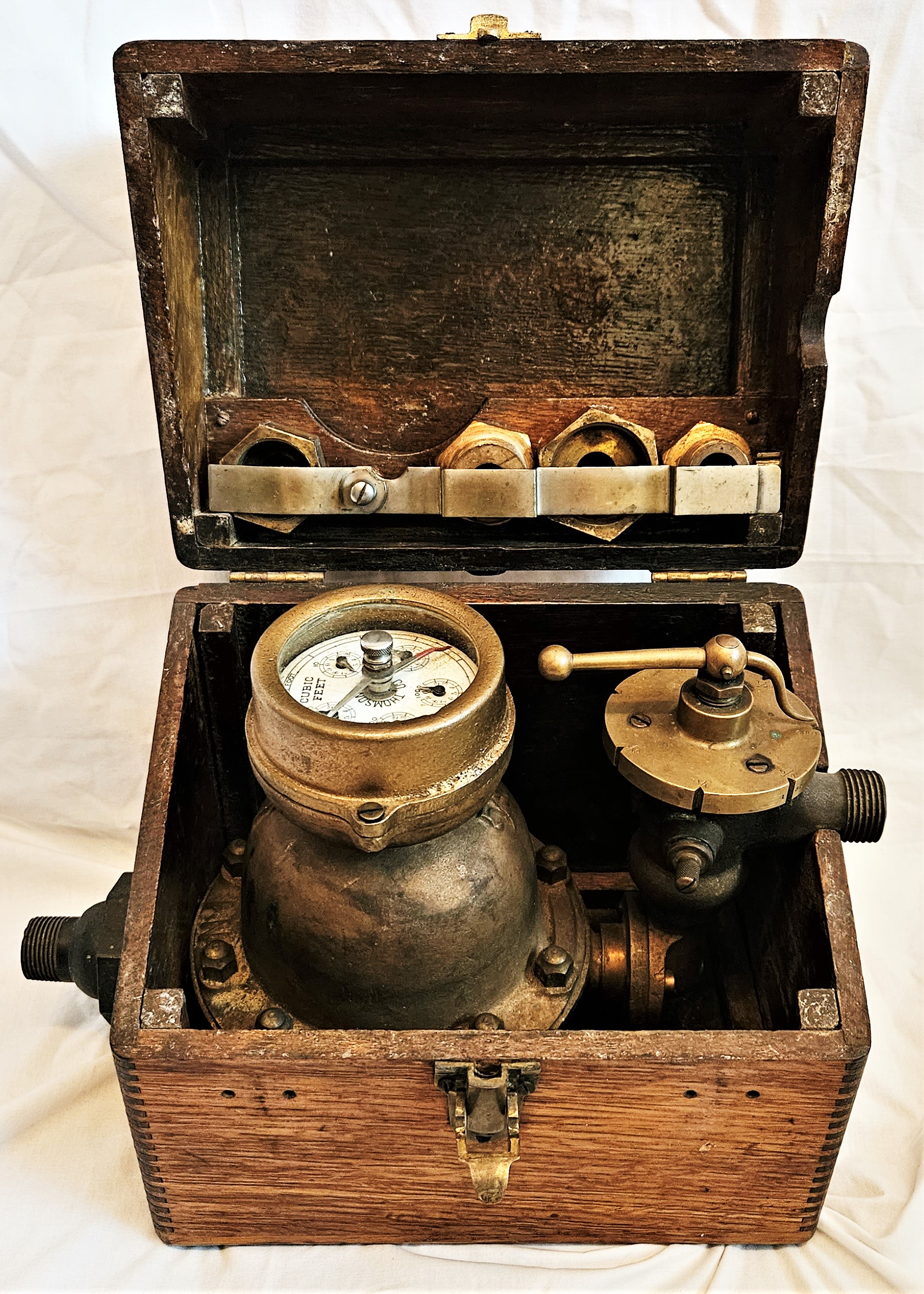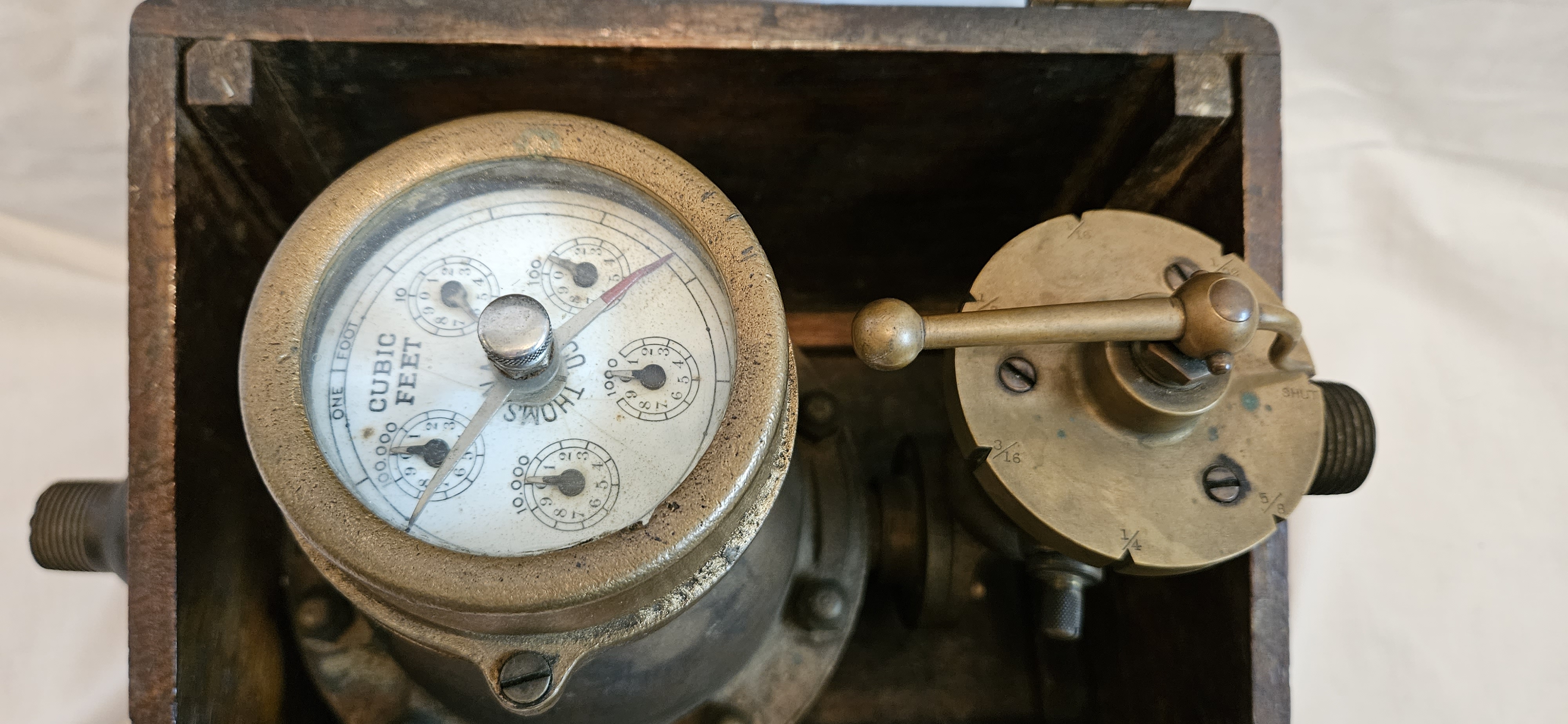 5 Frank Lambert Water Meter - The water meter was invented by Frank Lambert, the same Frank Lambert who invented a cylindrical phonograph in 1879 for a talking clock, as well as the Lambert Typewriter. Lambert Water Meters are extremely rare. This meter is circa 1900 and is complete with brass fittings. Free delivery to APS show. Price is $550