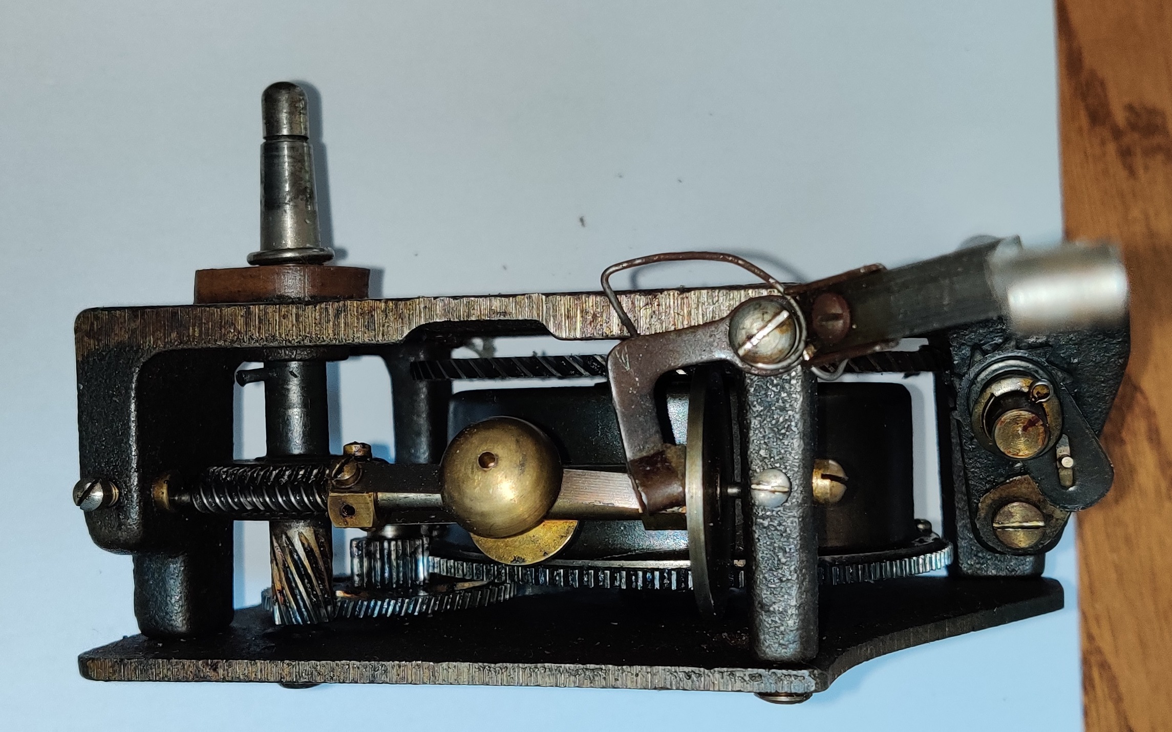A real curiosity, this! There are a few "Columbia" style fittings as found on the Japanese models, i.e, the record rack in the lid (also found on the British Columbia 112A), the auto brake, the lid closing mechanism and the "wings" on the sides of the internal horn. The trade mark is very akin to that on the British "Dulcetto" portables, though differently coloured. Hmm......