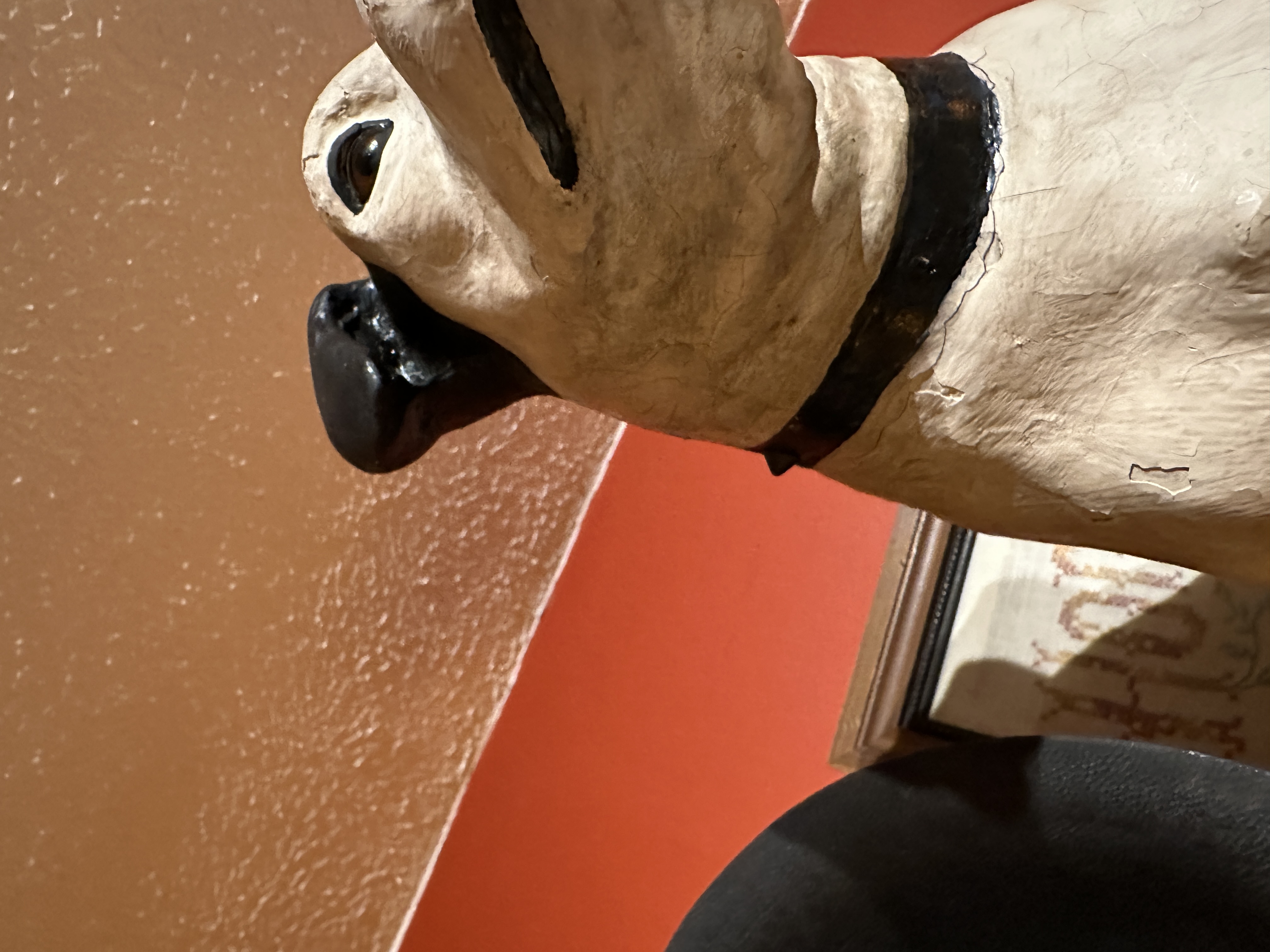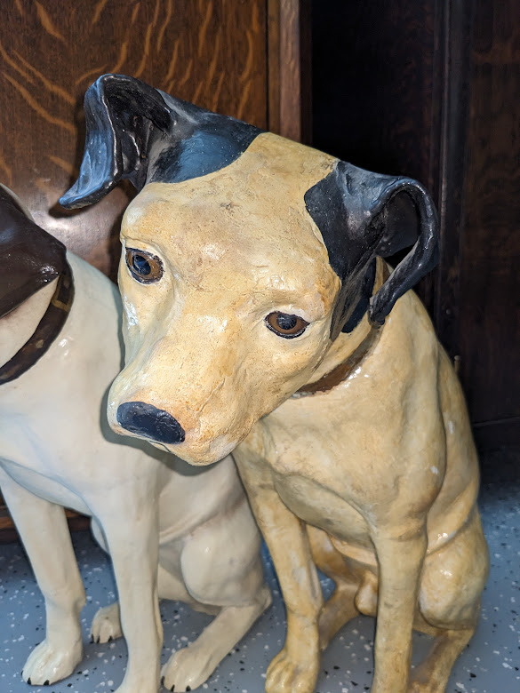 Nipper is back among the living. The collar and mouth paint are still original, the ears and right foot are new. He won’t win best of show, but he’s good enough for my display.