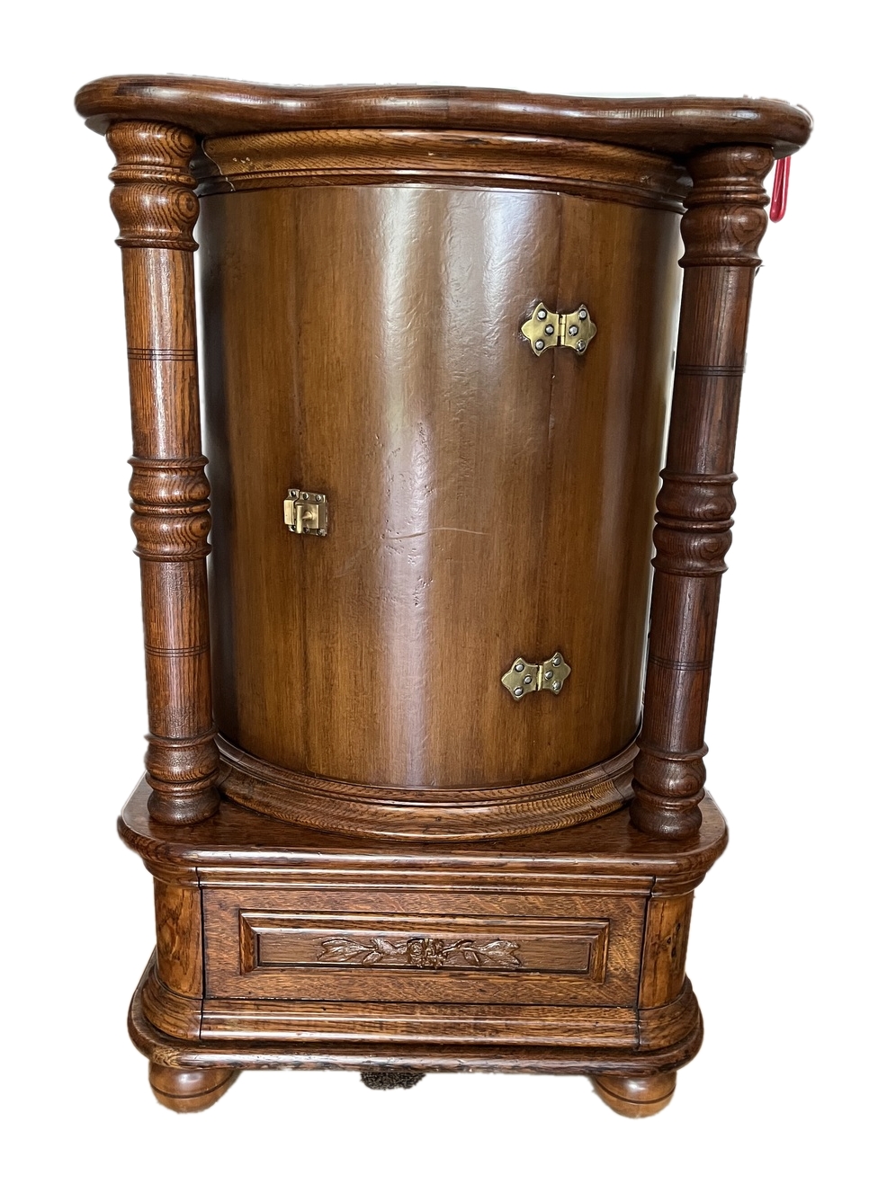 I've come across two of these cabinets in the past 20 years. Very heavy due to being solidly built of oak, with a metal drum at the center that holds a unique cylinder record "tree" that rotates 360 degrees. There is also a drawer at the bottom.
