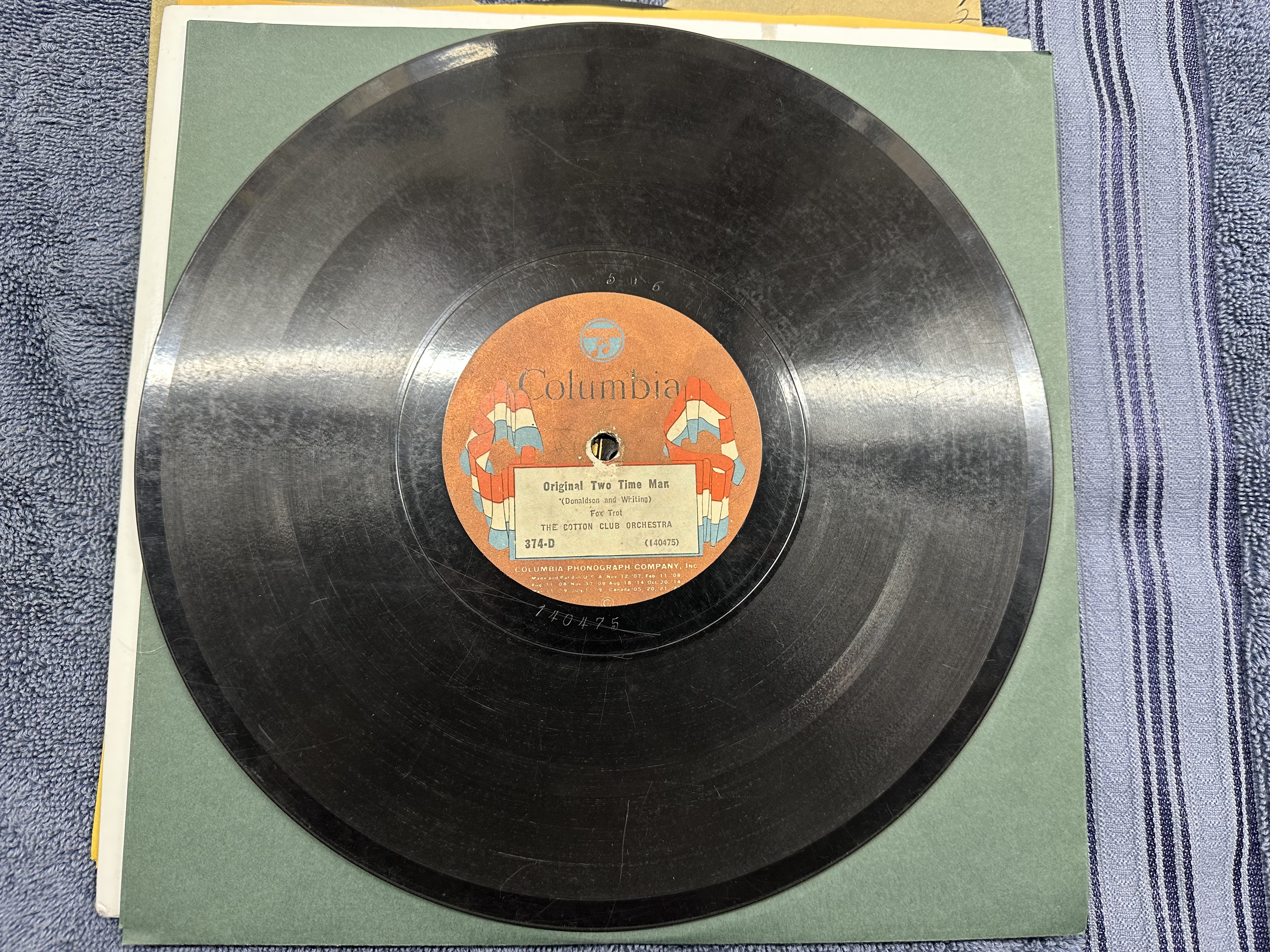 9. Columbia 374-D, Cotton Club Orch., "Original Two Time Man" / "Riverboat Shuffle" Should be electric but isn't. Visual V+ that plays E. Scarce! $20 SOLD