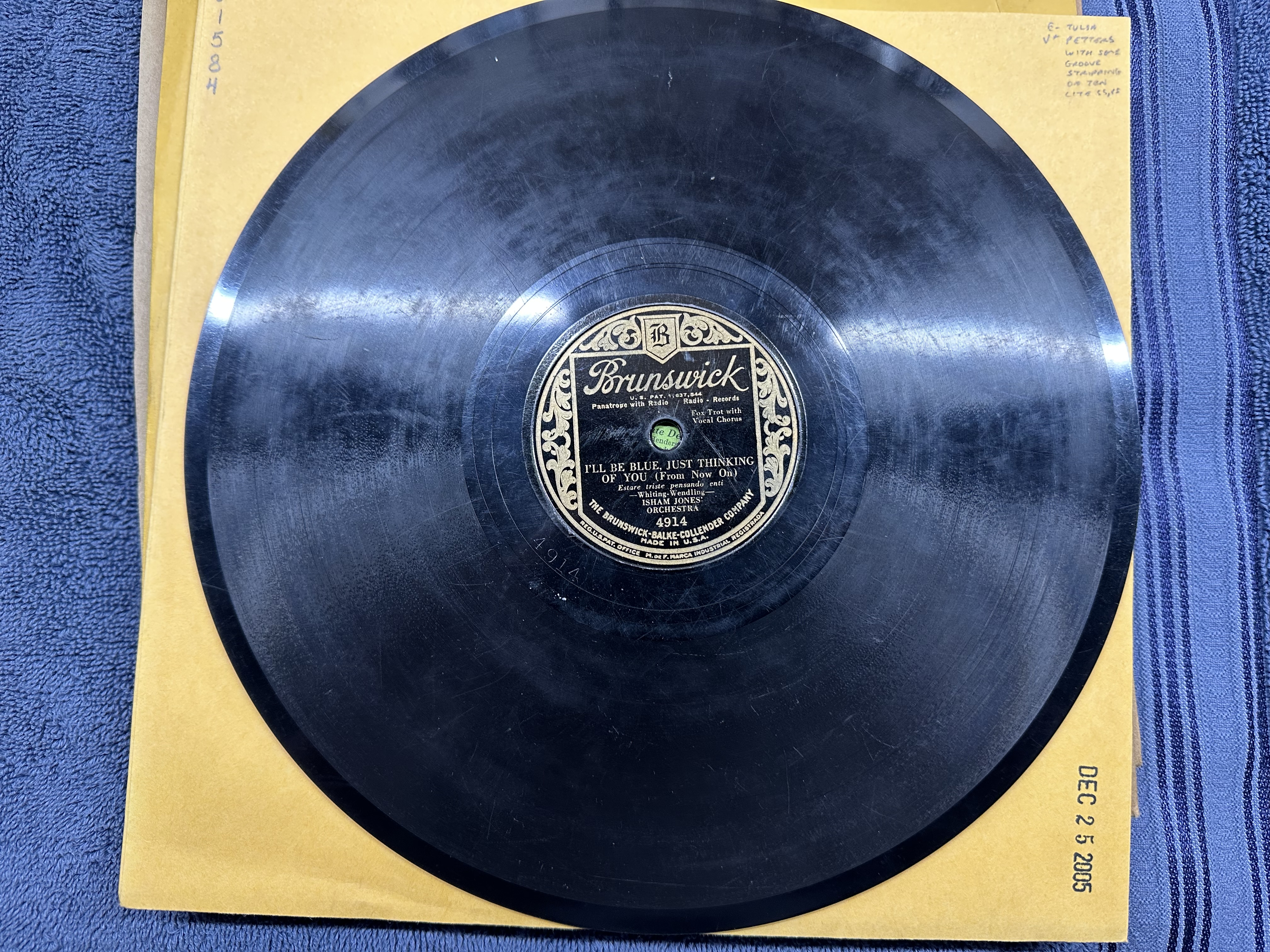 3. Brunswick 4914, Isham Jones Orch., "In My Heart It's You" / "I'll Be Blue Just Thinking Of You". Great hot arrangement B. Frank Sylvano vocals. Visual V+, plays E- to E. $15
