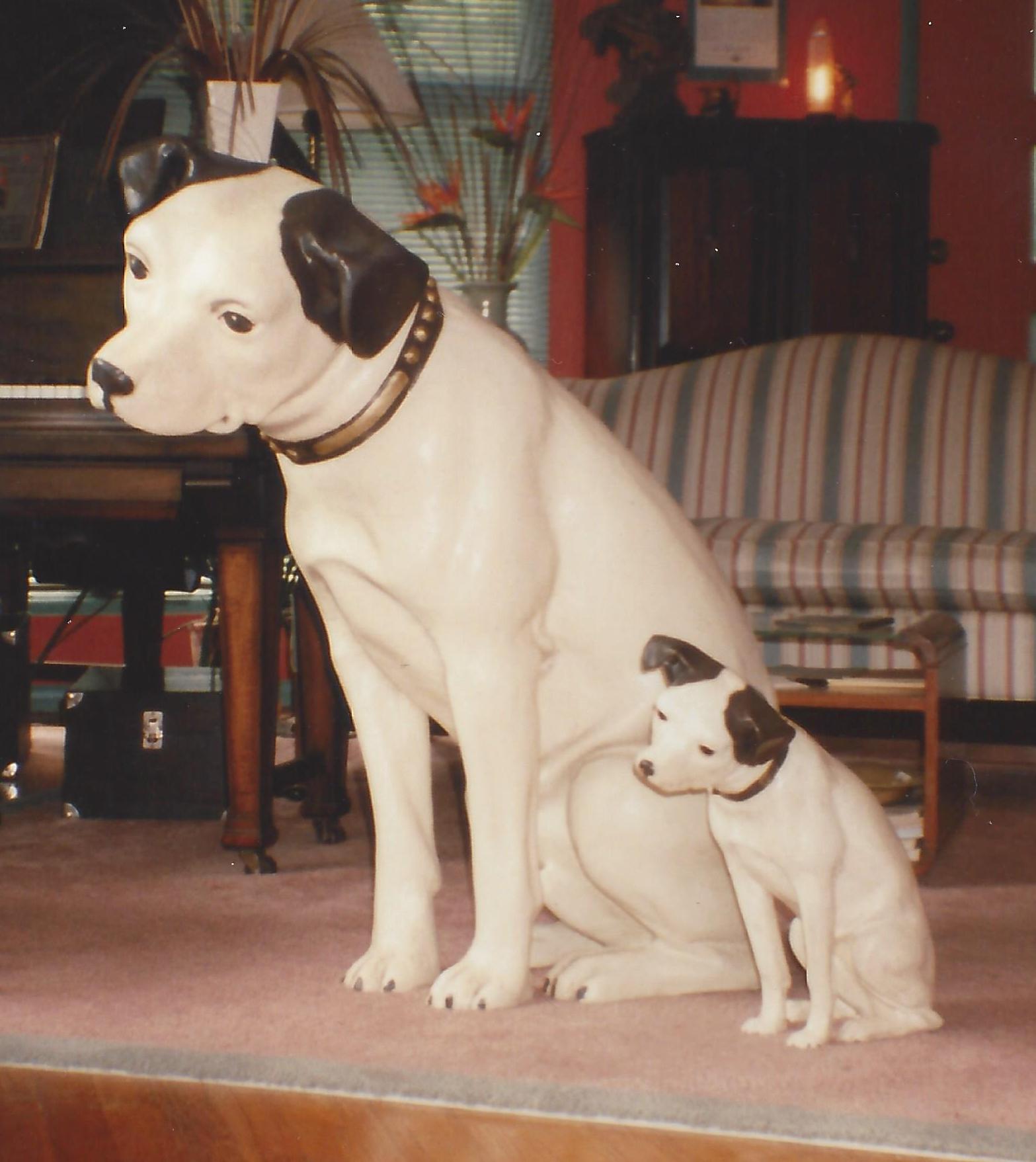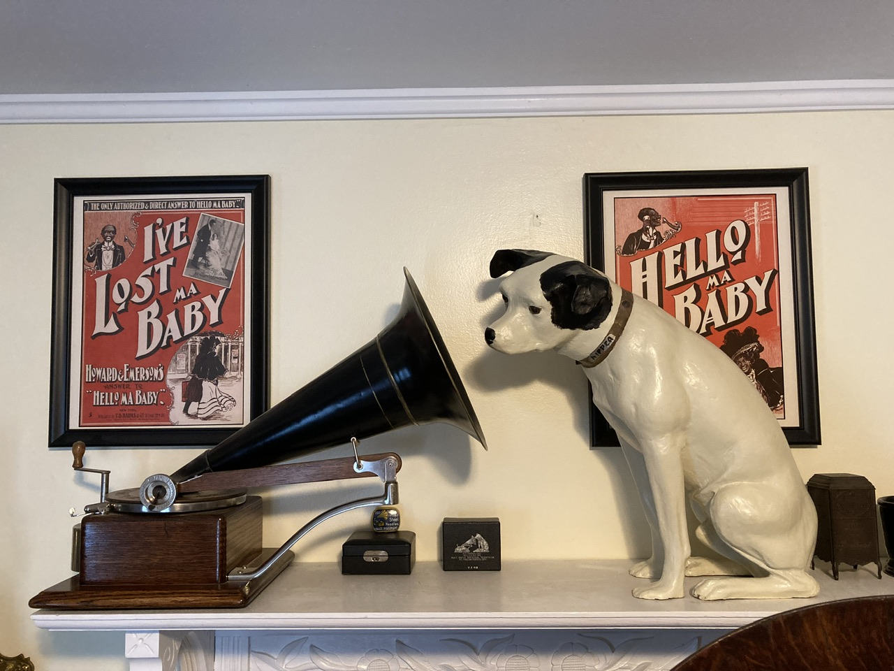 Nipper is back among the living. The collar and mouth paint are still original, the ears and right foot are new. He won’t win best of show, but he’s good enough for my display.