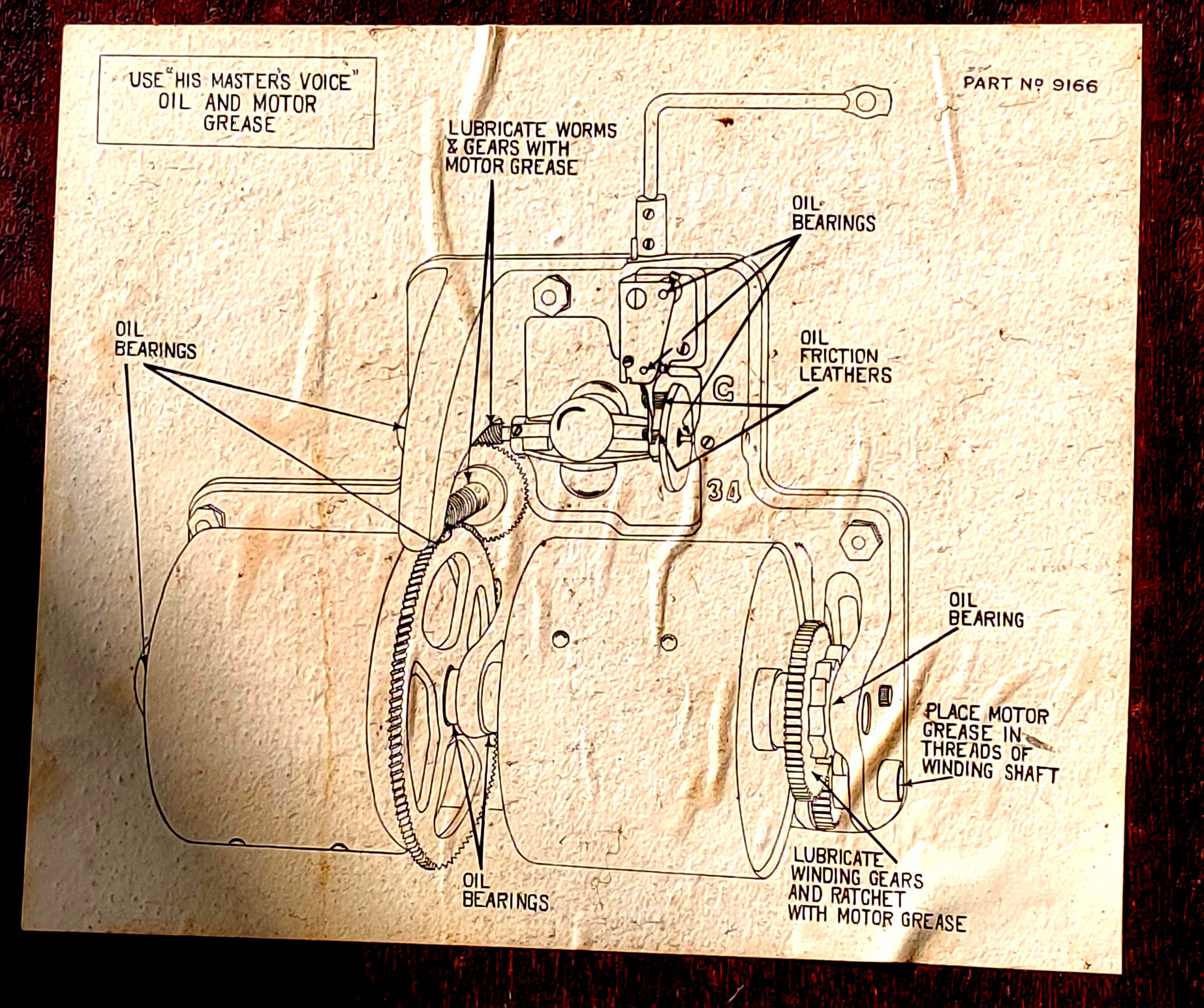 I checked the underside of the motor board on a couple of my HMV 2 spring motor machines. The sheet on my HMV 162 was worse than the OP's. The one on my HMV 163 was a bit better, so here it is.