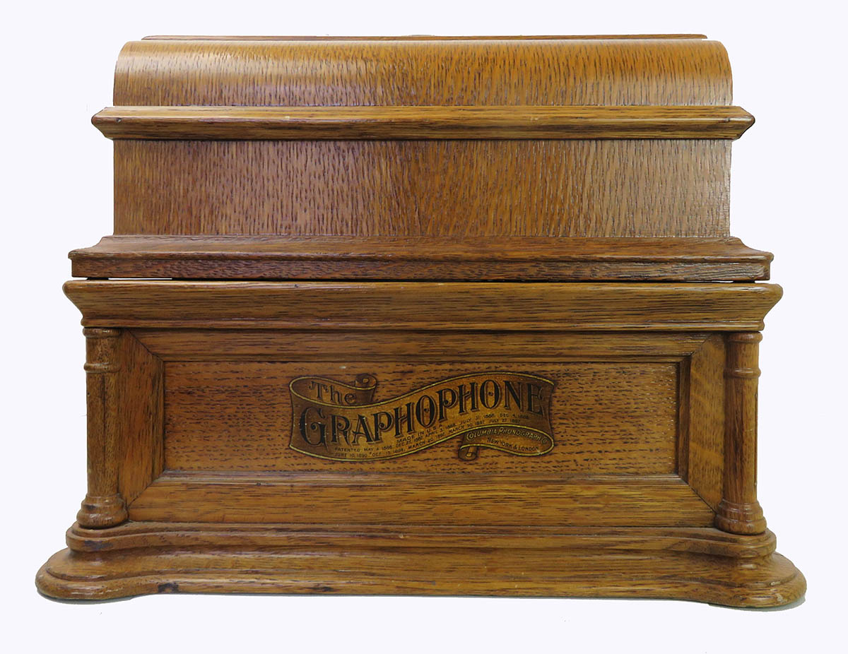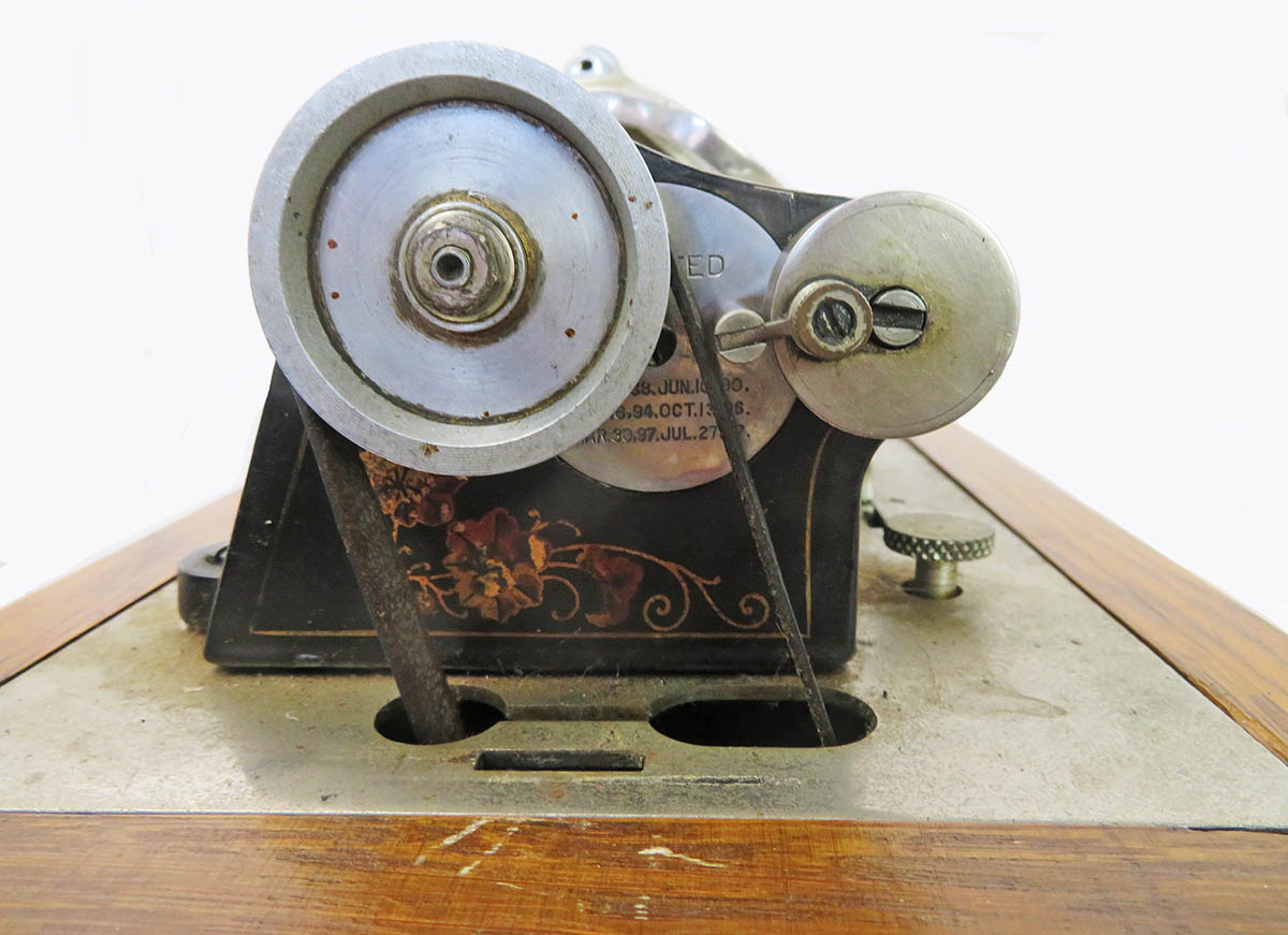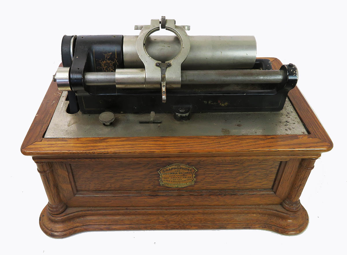 Columbia BF cylinder machine. This phonograph is in very good original condition except it needs a cleaning, lube, reproducer and crank. All parts move freely and gears are sharp. The motor runs smoothly. The machine is original and solid. This is the desirable 2-4 minute gearing model. These don’t turn up often. The case was refinished at some time and is about a nice a job I have seen including preserving the original decals.