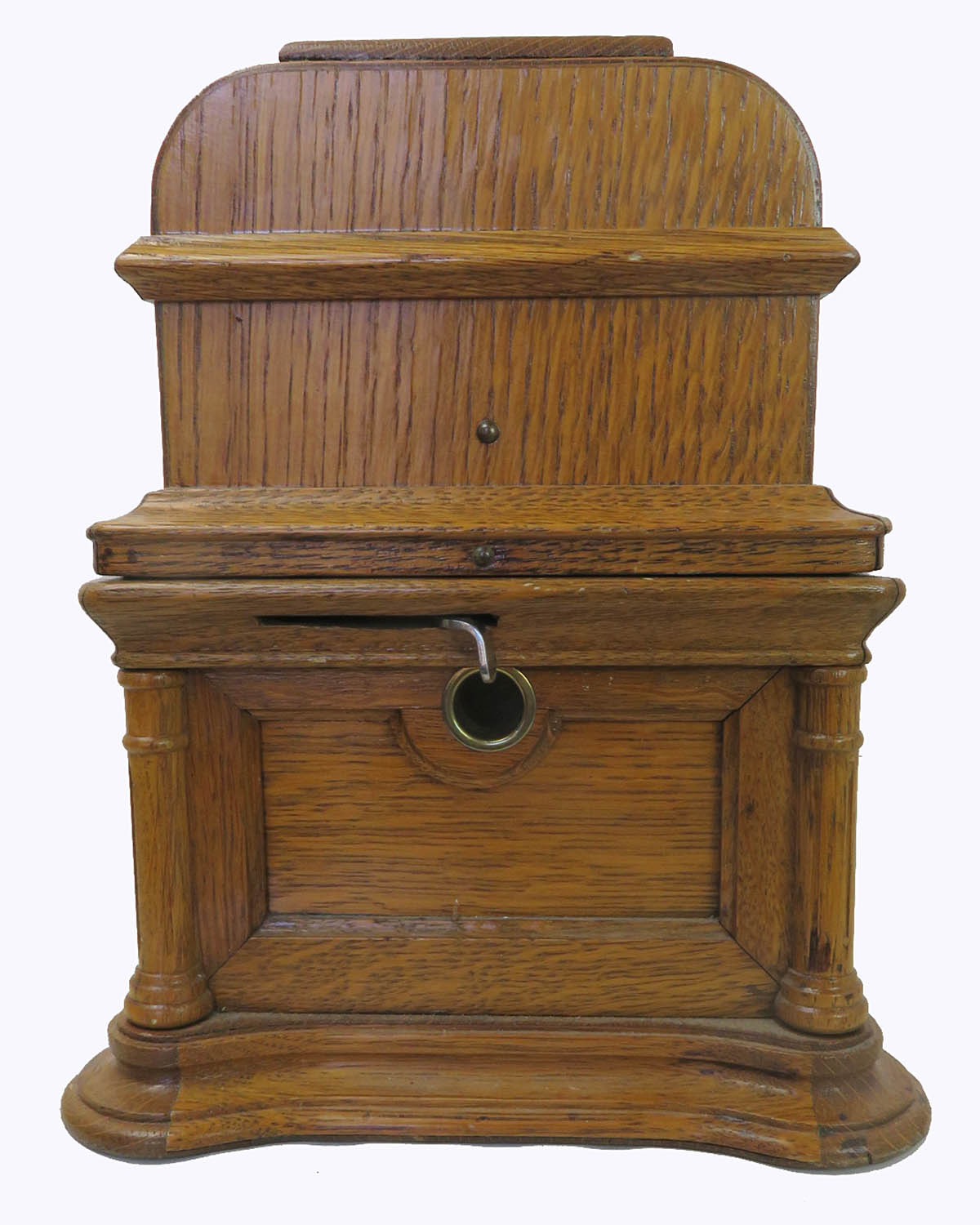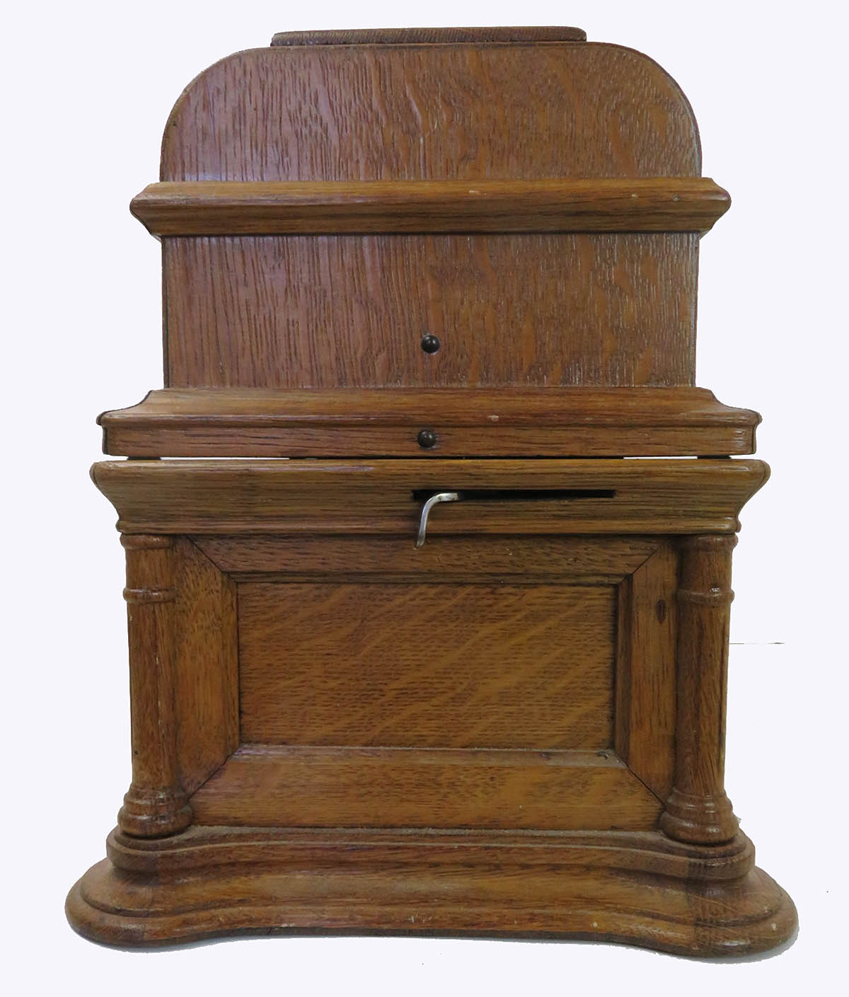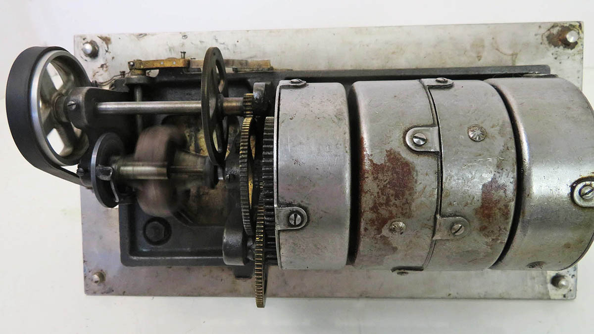 Columbia BF cylinder machine. This phonograph is in very good original condition except it needs a cleaning, lube, reproducer and crank. All parts move freely and gears are sharp. The motor runs smoothly. The machine is original and solid. This is the desirable 2-4 minute gearing model. These don’t turn up often. The case was refinished at some time and is about a nice a job I have seen including preserving the original decals.