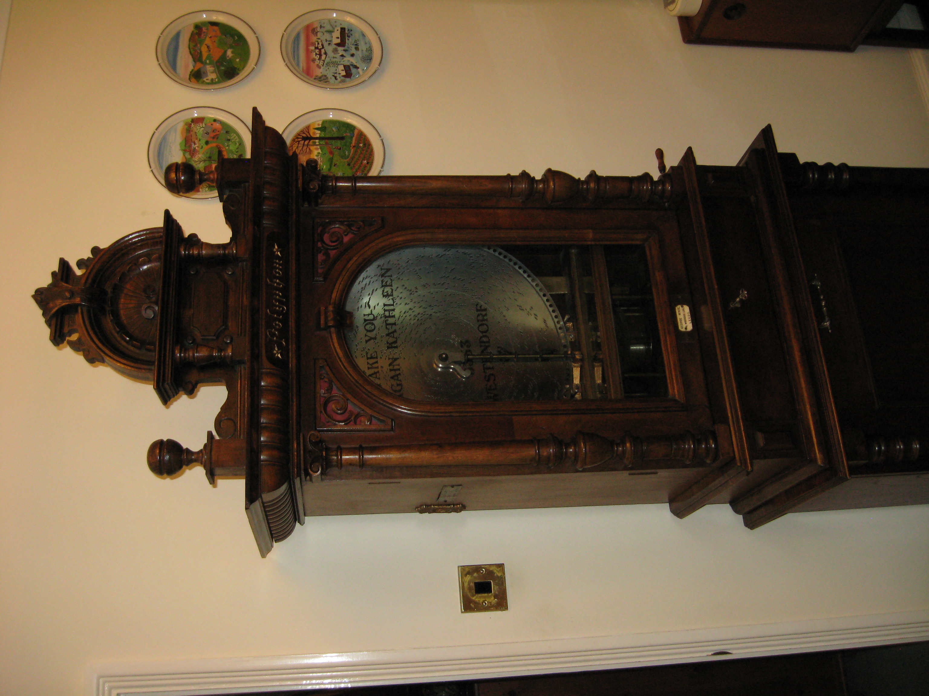 On closer examination, the motor could be of German origin. The open spring case is familiar to anyone with a Polyphon disc musical box, such as this one which sits in our dining room (but not on it's side!) :
