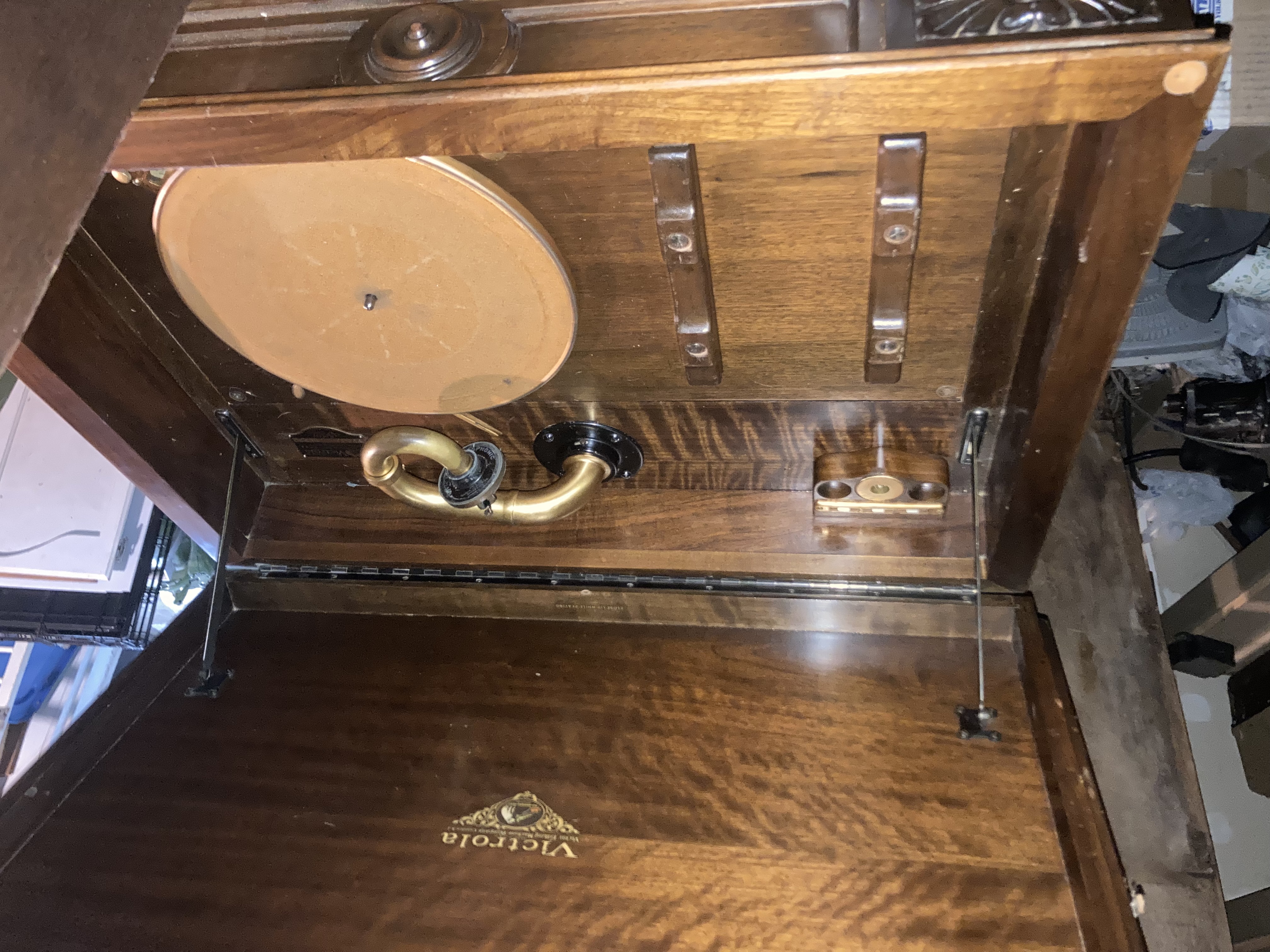 I have decided to sell my Credenza. It is in good shape expect for the lid. The veneer on the lid is delaminating and it is pretty scratched up. The rest of the cabinet is in decent shape. Grill cloth looks original. I went through the motor and cleaned & greased the springs and cleaned everything else up. I also rebuilt the lid dashpots. The reproducer is pot metal but is in good shape. The credenza is in Vancouver, WA - a short drive from Portland, OR. I am asking $100 obo - The lid is ugly and I need it out of the garage.
