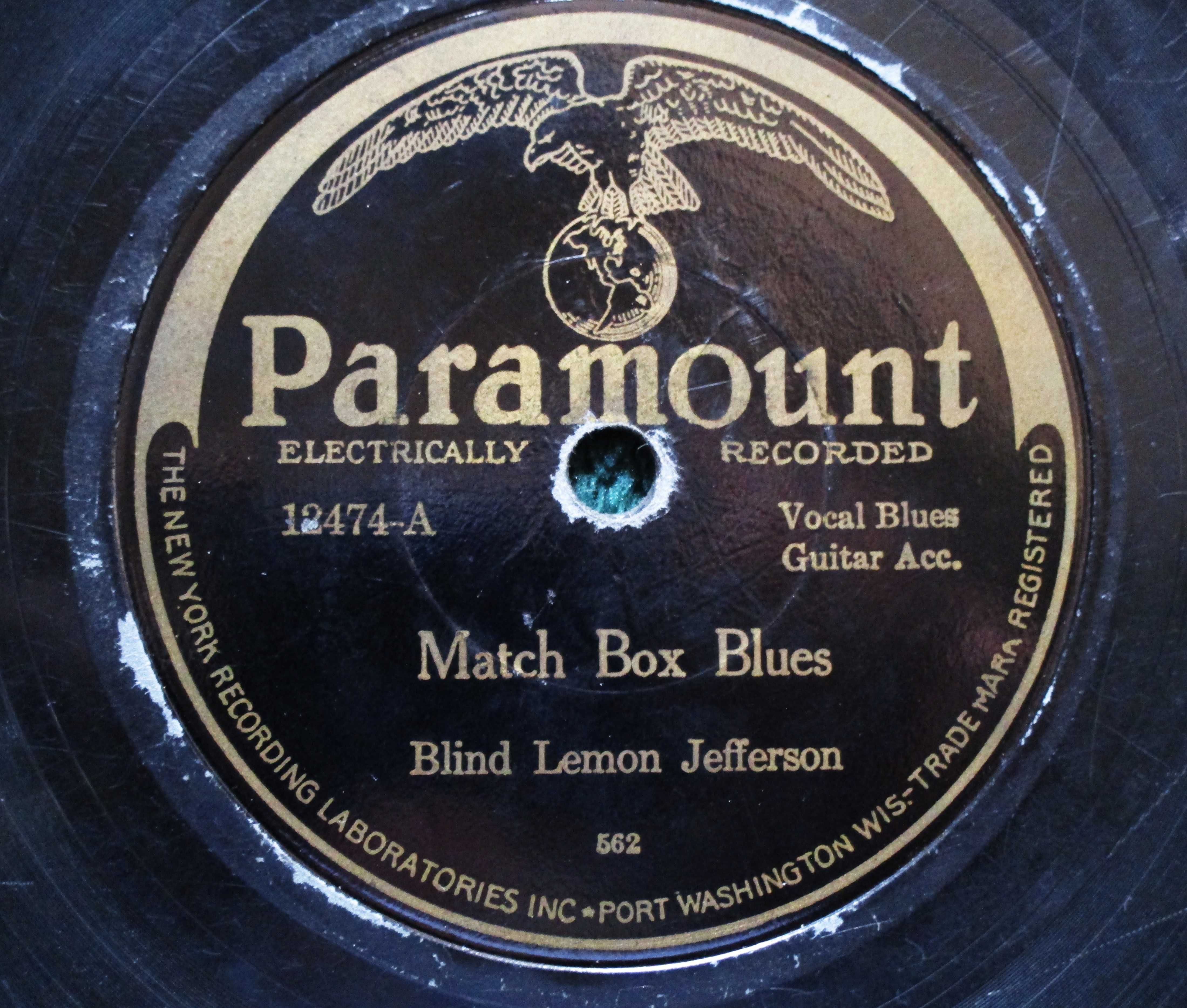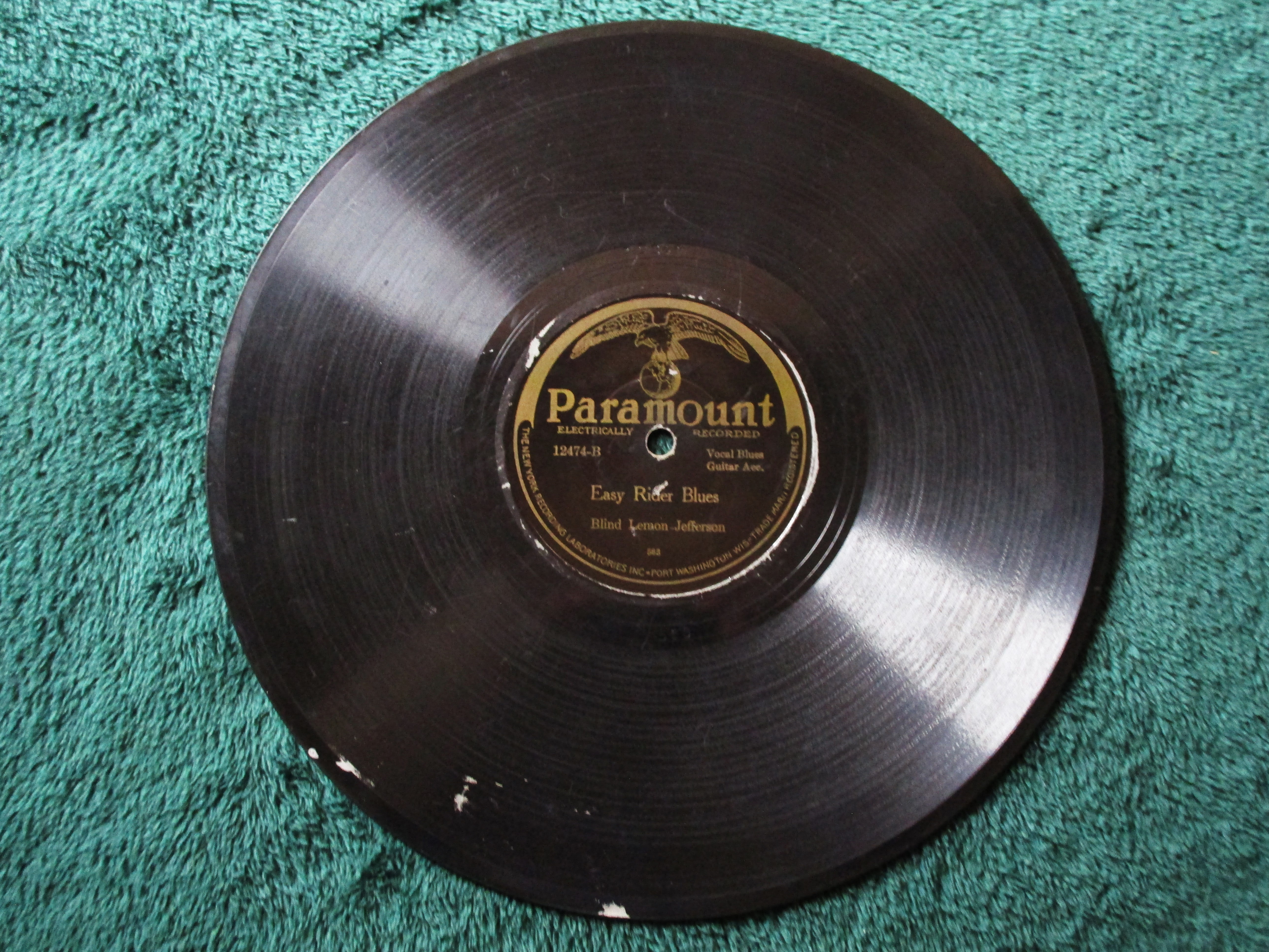 I found this record recently and would like to sell it. The price is $250 plus actual USPS shipping cost. This is Blind Lemon Jefferson on Paramount with "Match Box Blues" and "Easy Rider Blues". Shipping to USA or Canada address. The record plays well on both sides with surface noise consistent with a record that was enjoyed many times on a victrola. The record has no cracks, no warping. One tiny edge flake on Match Box side affects nothing. A few scattered white paint spots on the Easy Rider side affect nothing and are inaudible. There are numerous scratches and scuffs on both sides and both sides have noticeable play wear. As always, I pack very securely and ship within a day or two of receiving payment (PayPal friends or mailed check or money order). Please send a PM with interest and to discuss further details.