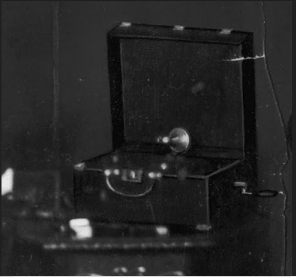 In this, one of his recent videos about the 100th annaversary of the Munich beerhall putsch, there was a section where Hitler was practicing poses for his speeches, and in one there is a very blurry picture of a gramophone, but even in this state there are a few distinct features, like the triple clasps that could lead to the make being identified.