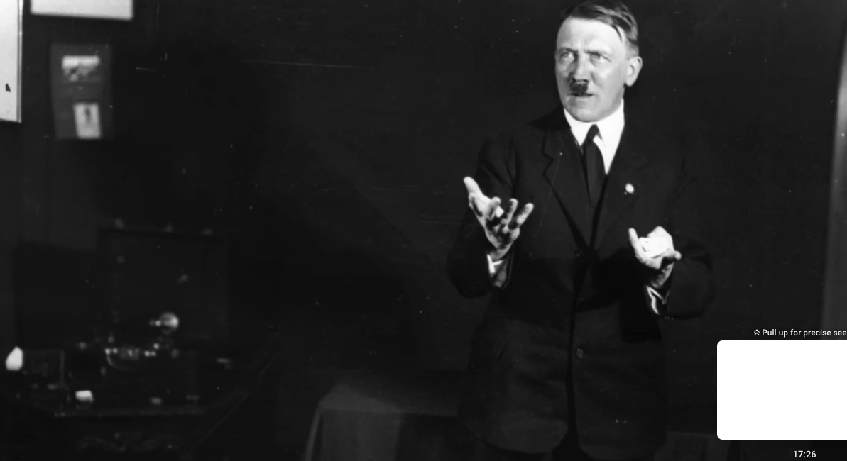 In this, one of his recent videos about the 100th annaversary of the Munich beerhall putsch, there was a section where Hitler was practicing poses for his speeches, and in one there is a very blurry picture of a gramophone, but even in this state there are a few distinct features, like the triple clasps that could lead to the make being identified.