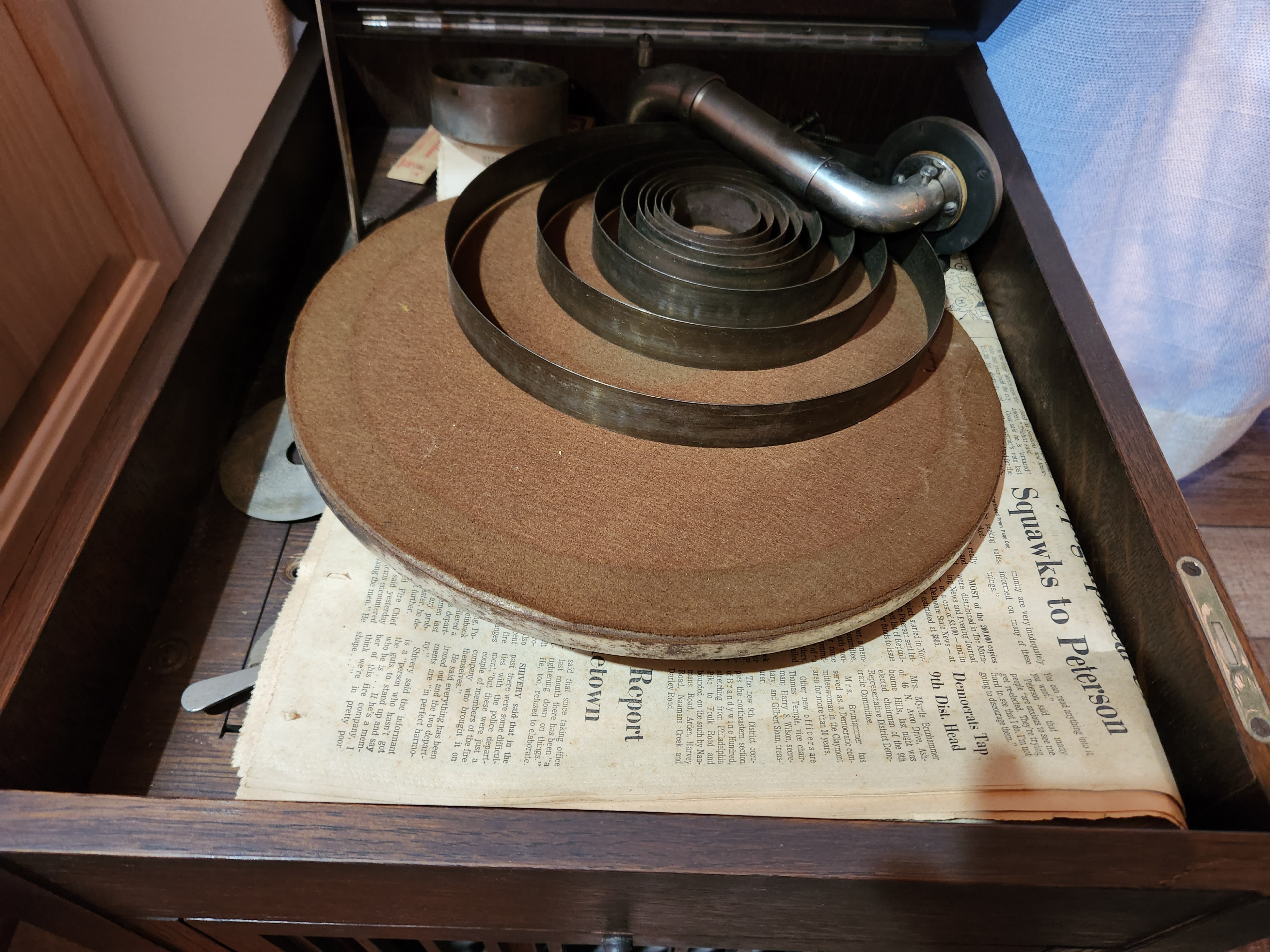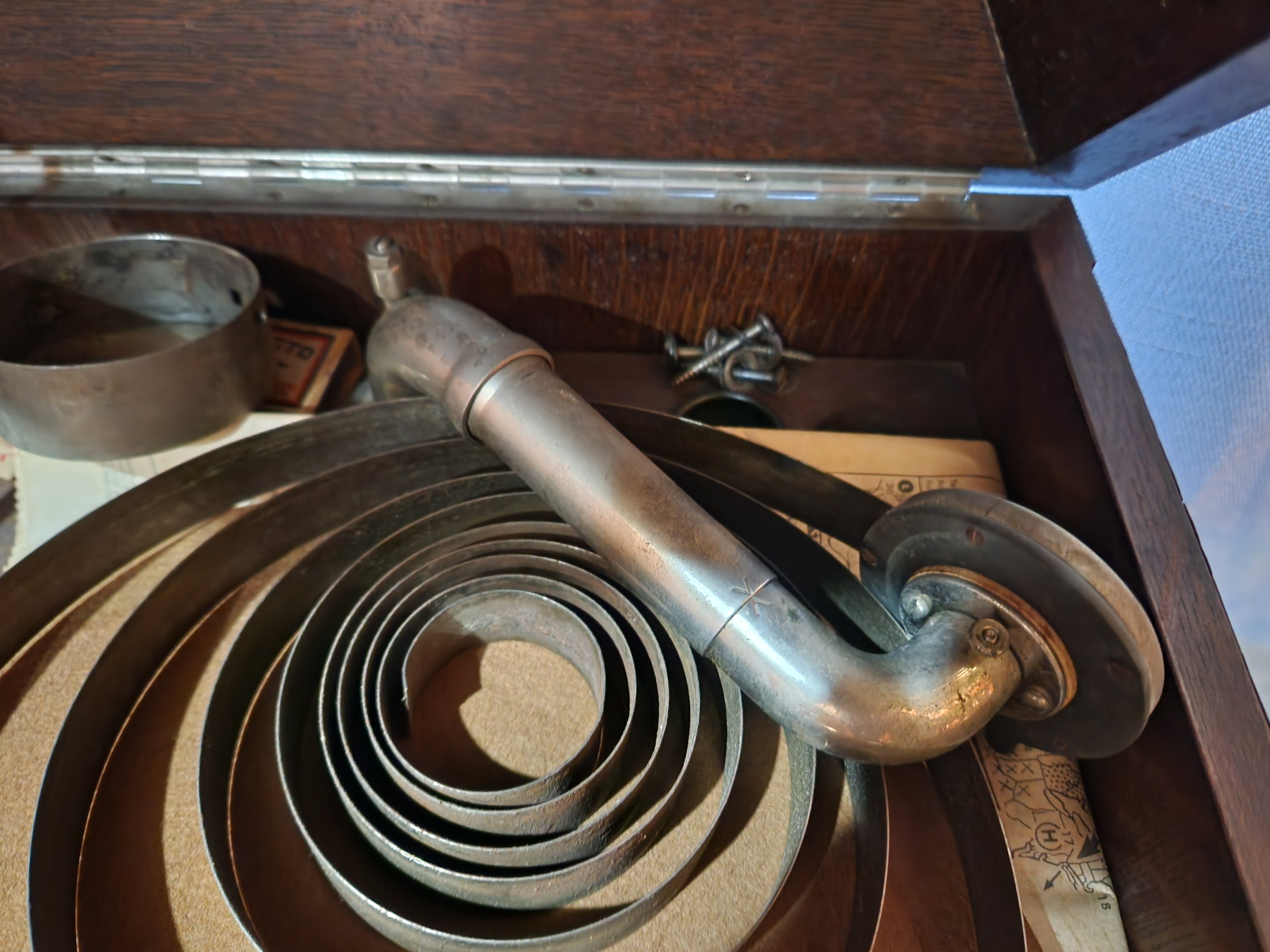 A lady contacted me about an Aeolian Vocalion Table Model (Style EE?) that she inherited and wants to give away to a your collector who is interested in repairing it. It looks like her father or grandfather tried to repair it, discovered a broken spring, and didn't know what to do. She told me that the machine had been sitting like this for a long time. On the pictures, one can see the broken spring, the spring barrel and barrel lid. I assume/hope that the rest of the motor is inside, but I have never seen the machine in person. On the positive side, tonearm and reproducer seem to be in one piece/not broken. I found a 1920 catalog page from the UK which lists it as Style EE. Not sure what it would have been called in the US?