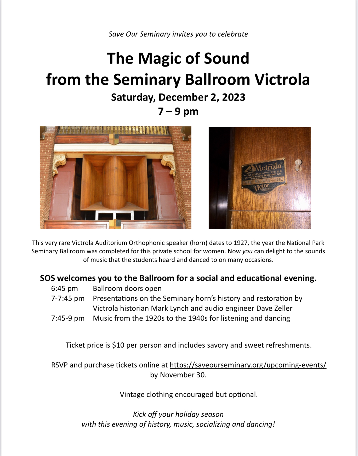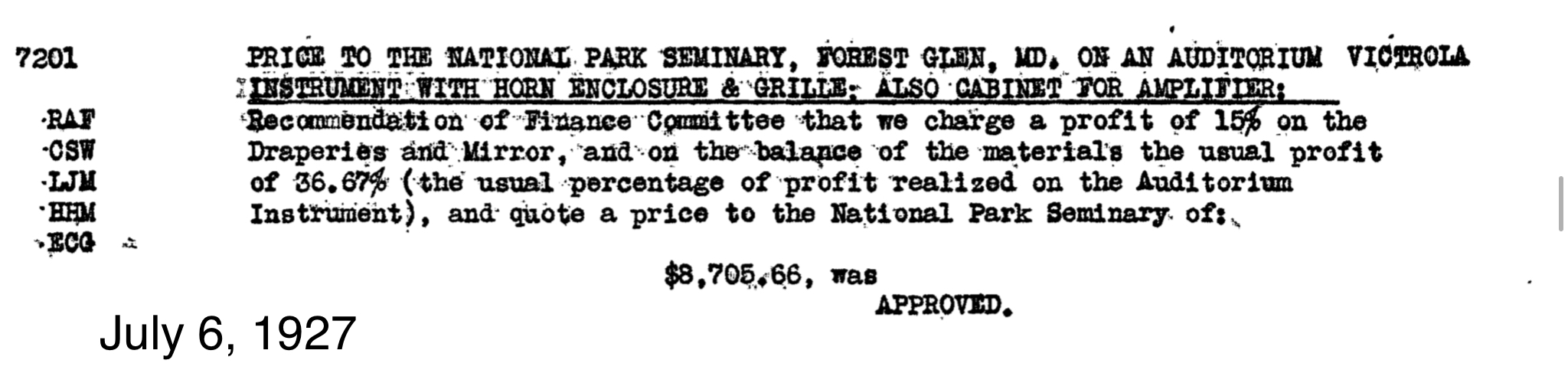 In the meantime, for those able to reach Facebook, follow this link to see the history of the National Park Seminary, where the horn was installed in 1927. It was a very exclusive and expensive girl’s finishing schools prior to being taken over by Walter Reed Army Hospital as an annex for returning WW2 veterans. The president of the school had no problem spending the $8705.66 for the installation, the equivalent of about $151,000.00 today. The amount comes from the Victor meeting notes at the Hagley Museum in Delaware (available on line). The proximity to DC and the girl’s access to naval cadets in Annapolis at arranged dances had political benefits.