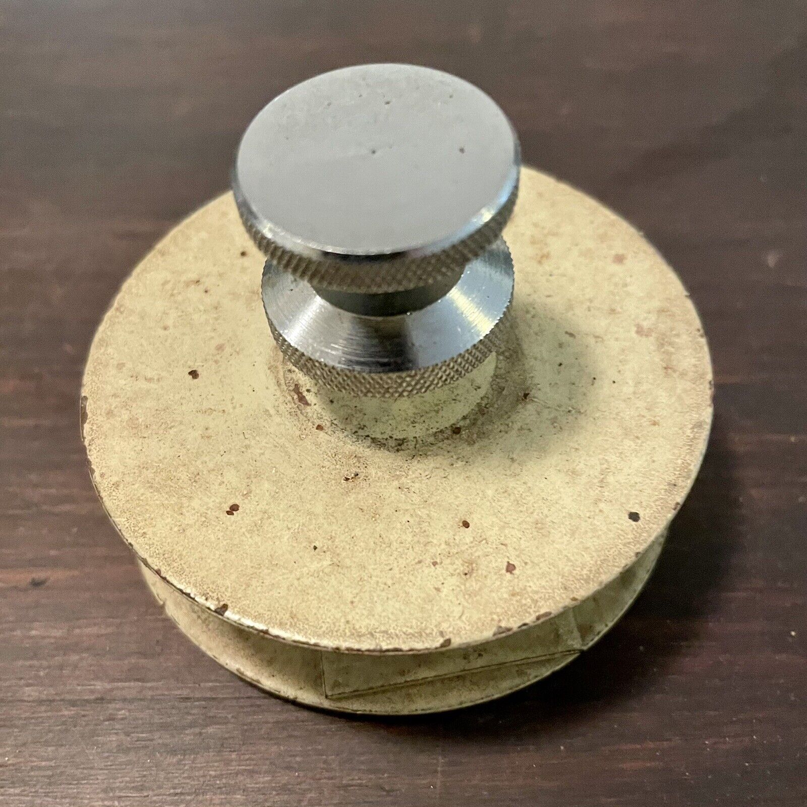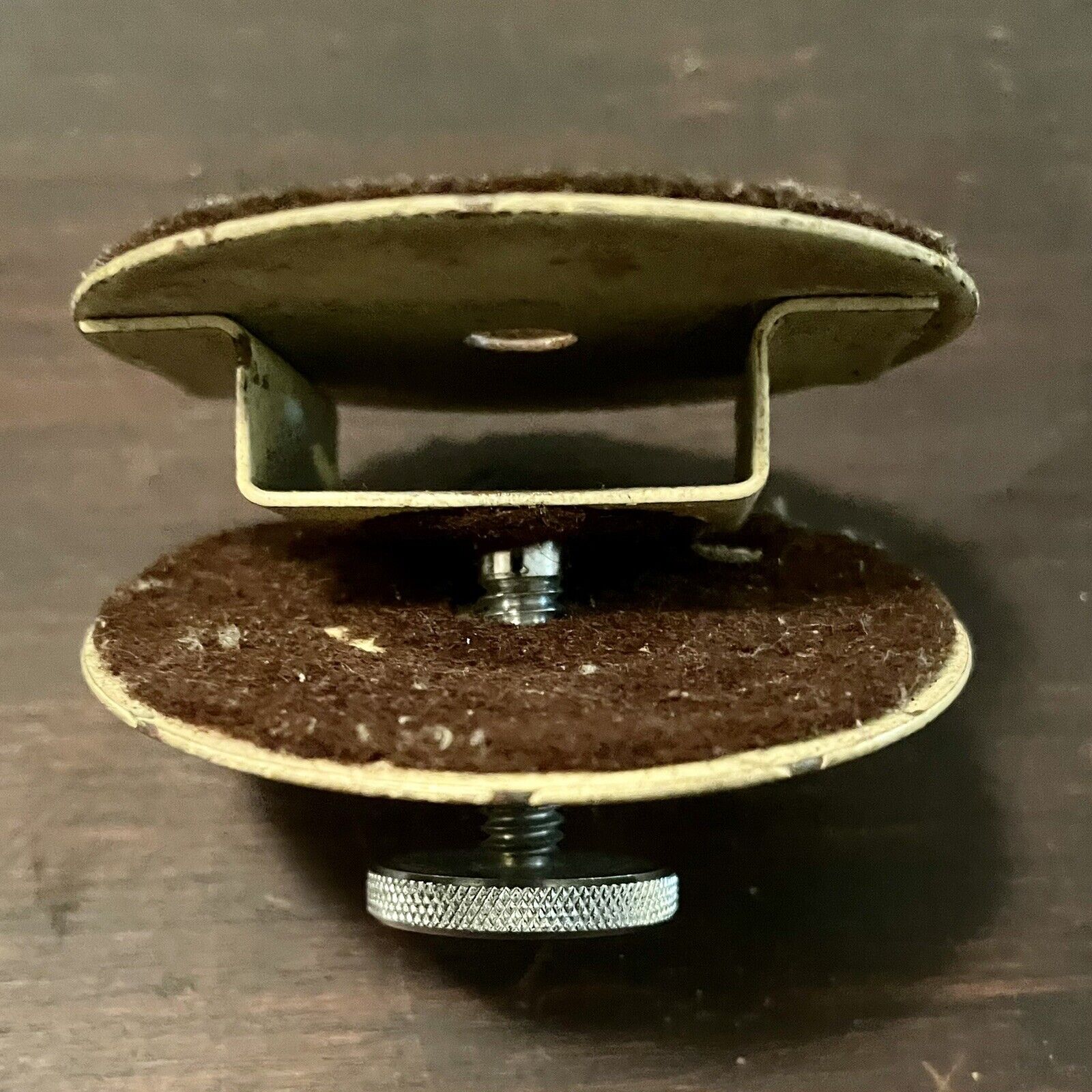 Does anyone recognize this item. It looks like a record clamp, if a record was inserted between the felt pads, the center would fit neatly onto the spindle but would raise the record about 10mm above the turntable. I can't make any sense of it. It's 62mm diameter. No markings.