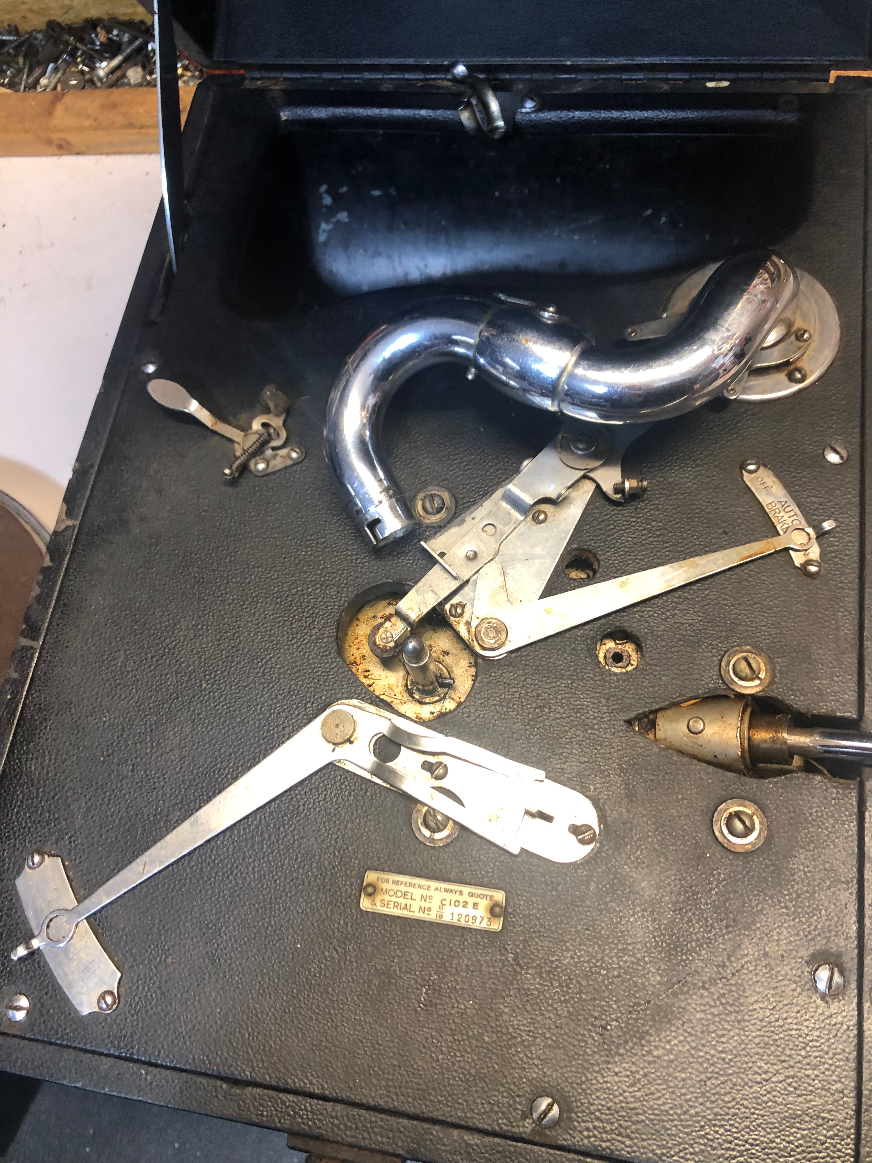 Whelp, went to pick the 102 up this afternoon but was greeted by a sad Michael who told me that there was something not quite right with the gramophone, seems that the motor has a problem with worn gears and that he would break it down for parts and would I be interested in another 102. This one has a 9 under the B, so that makes it a model from 1945