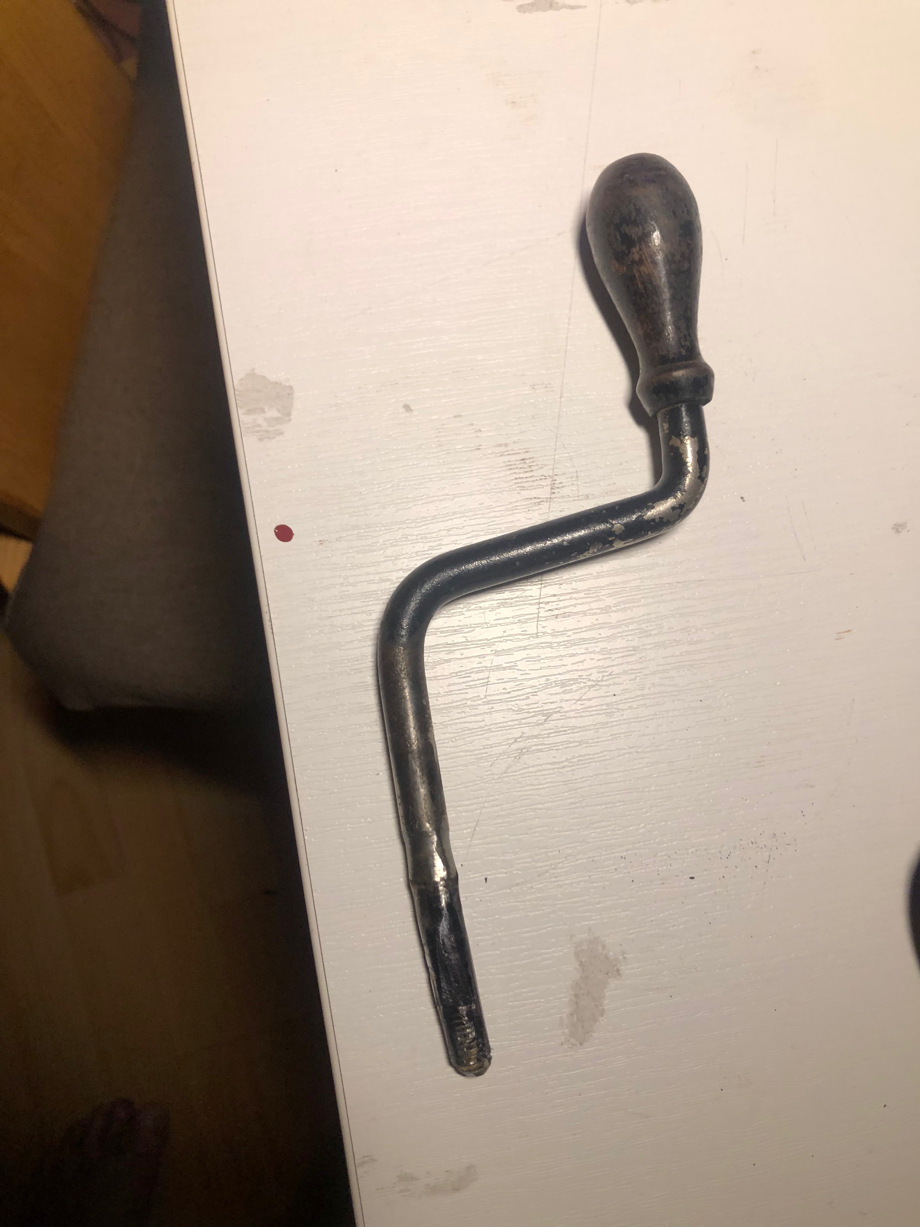 Had a look and it would seem that this is in an even better condition than the previous one, it has a few more dings and ouches than the first but nothing that can´t be done up with a bit of TLC and shoe polish. I don´t like the handle, seems to be a welded Frankencrank, so if anybody has a handle for sale I would be in the market. Some bugger has cut out the HMV from inside the lid, but Michael had a spare lid from a broken down machine so I got that with me to take out the leathercloth and paste it into my machine. And now I have a nifty little original HMV letter tray for my desk.
