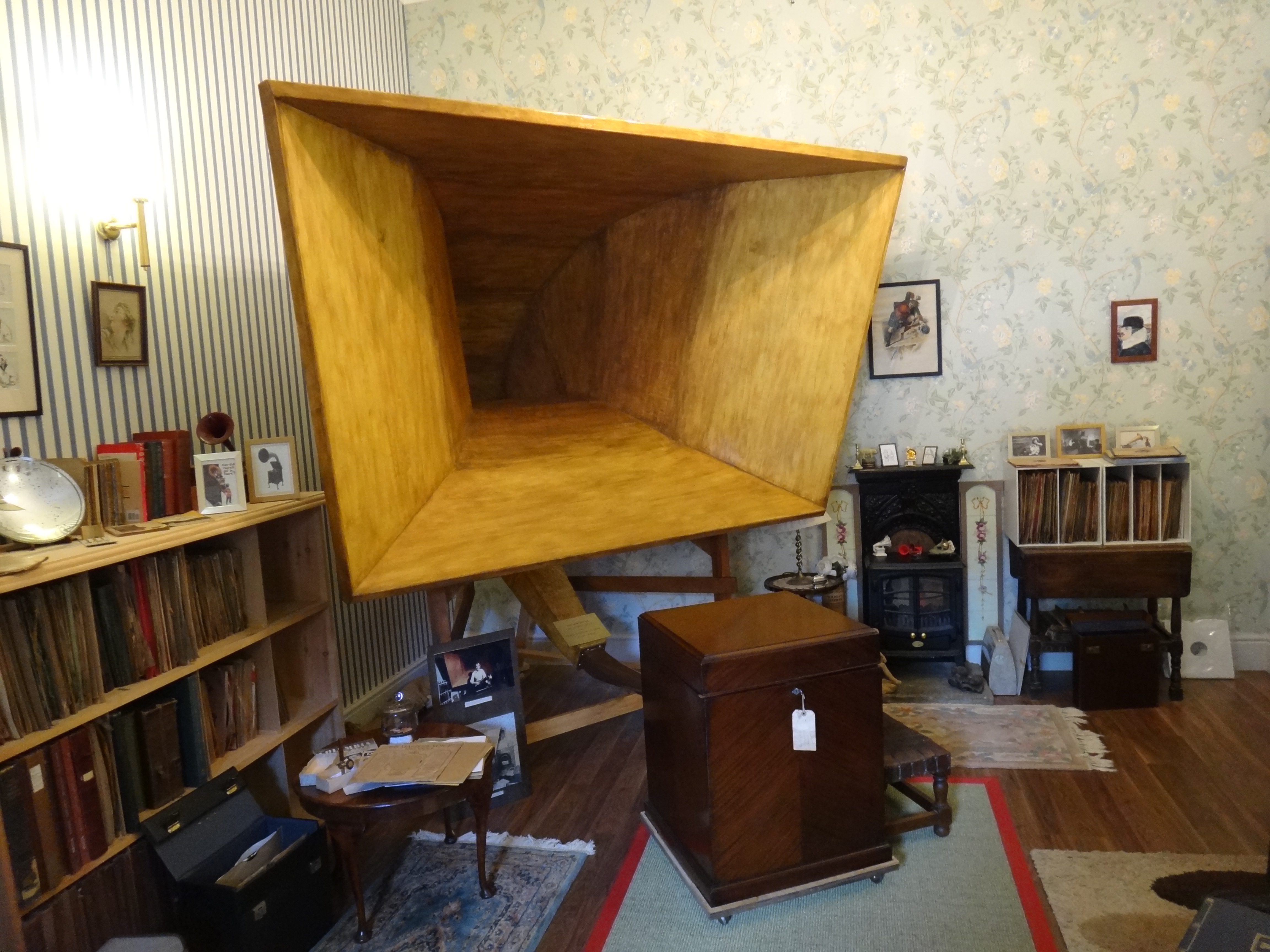 Here is a photo showing the gramophone, now fully restored, in its new quarters which are an exact copy of the room it once occupied in Sheringham Hall. Bespoke wallpaper was commissioned so that every detail was correct. The second photo shows the reason for the missing frequencies. The acoustic conduit was so long that the bats could not be seen from either end and were only found upon dismantlement.