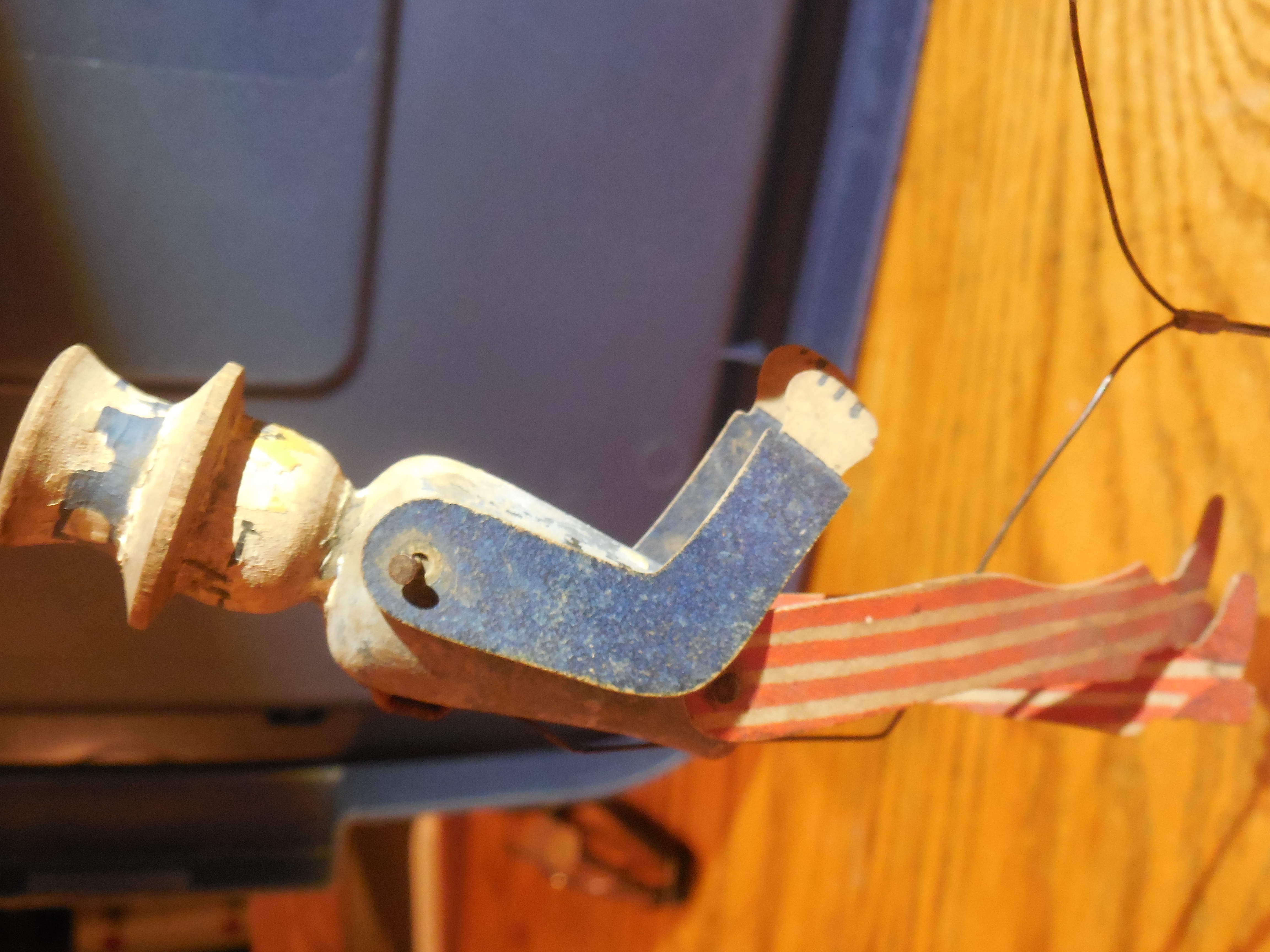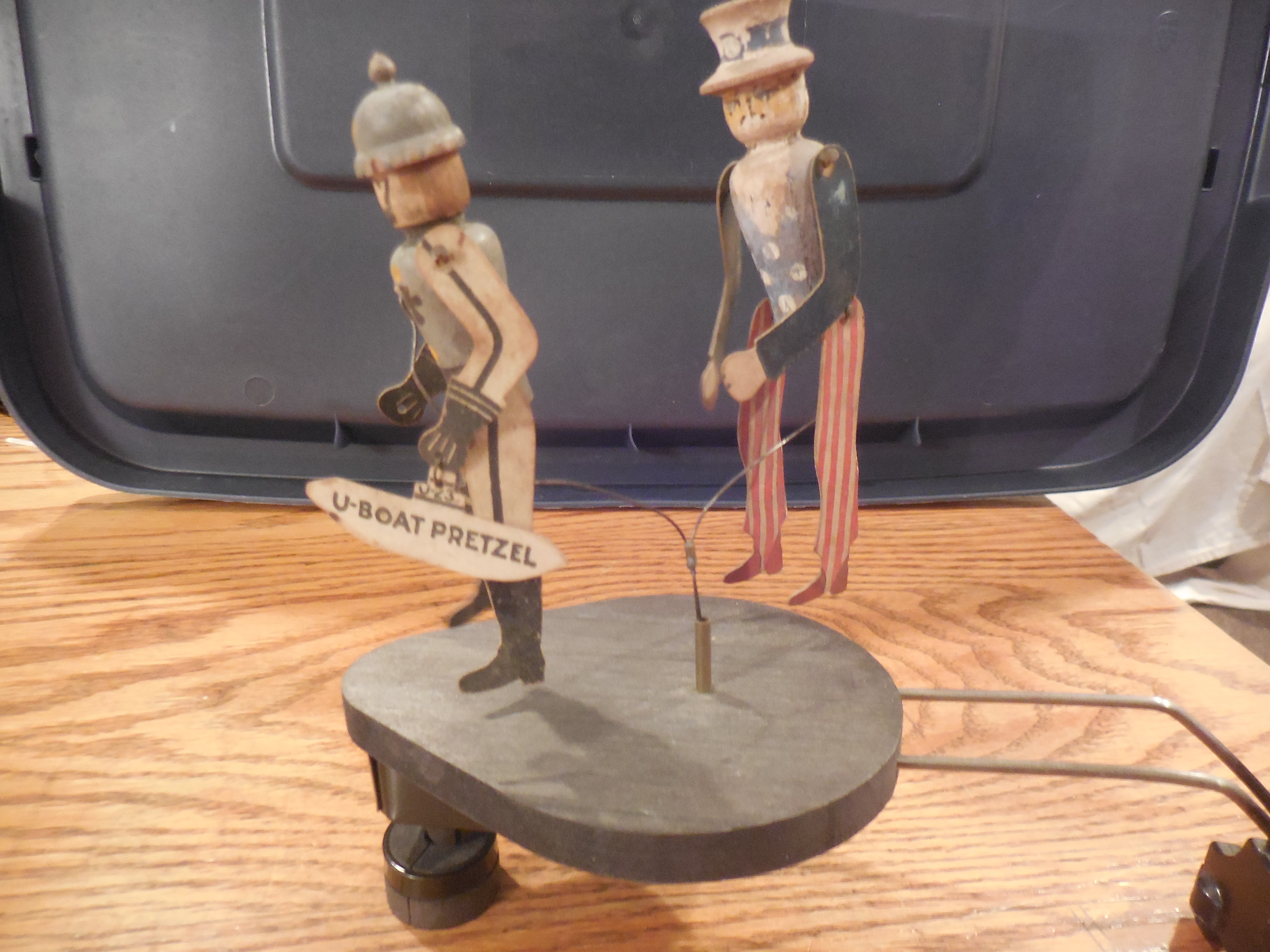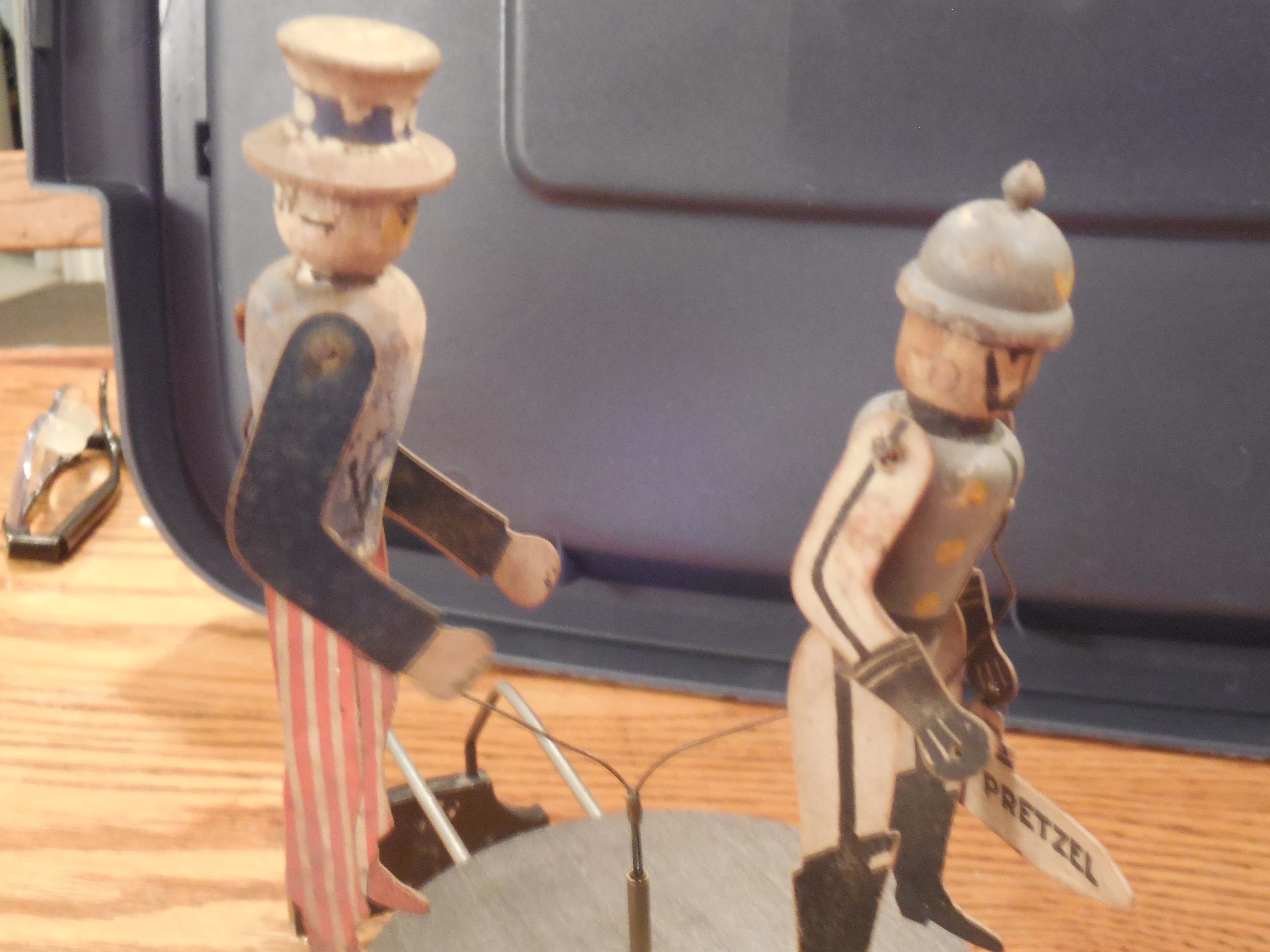 Overall in fairly nice condition.. Actually Kaiser Bill looks a bit better than Uncle Sam-- Uncle Sam has a small staple in his back holding the support wire-- should be an easy fix. I just never bothered. Also, he has a chip missing from the brim of his hat in the back.