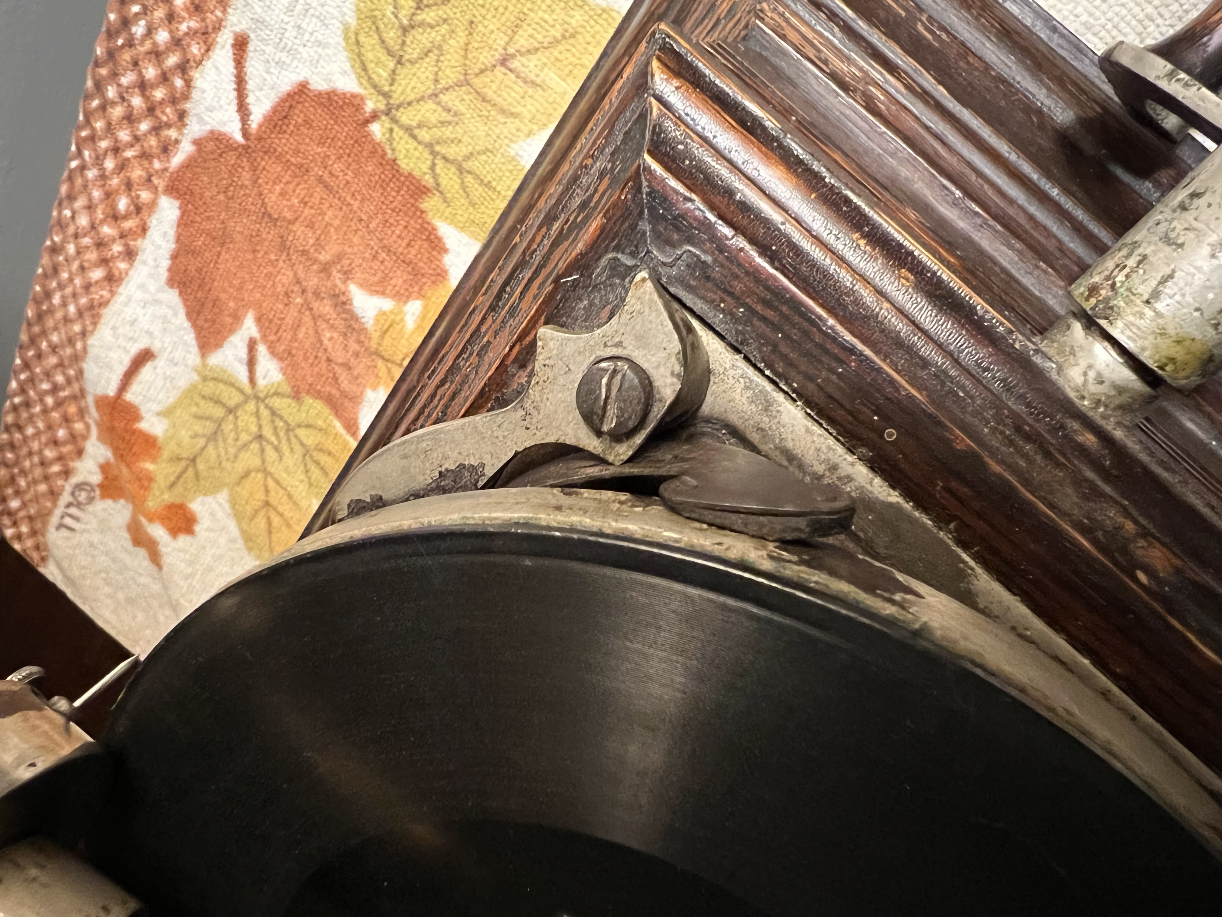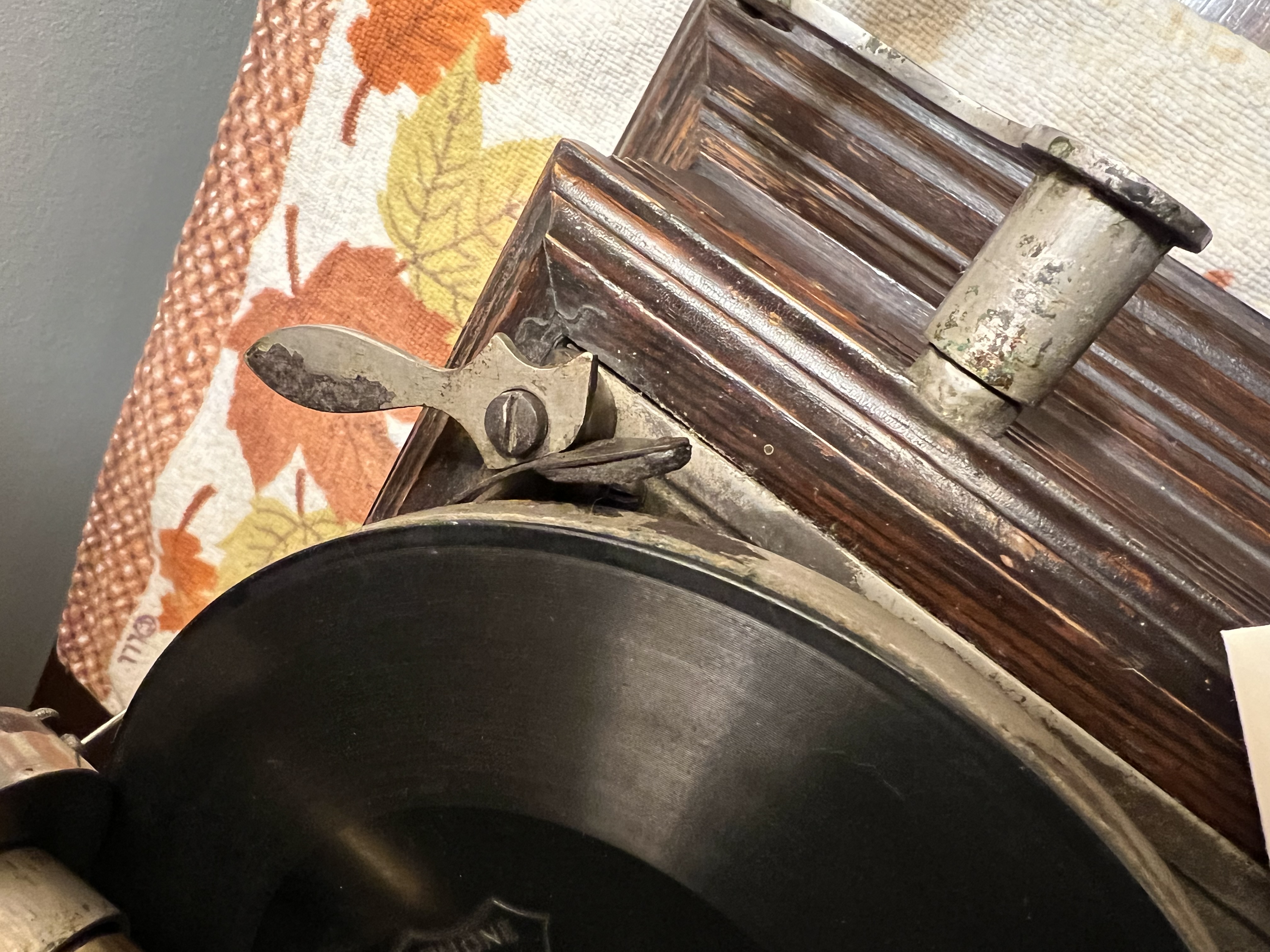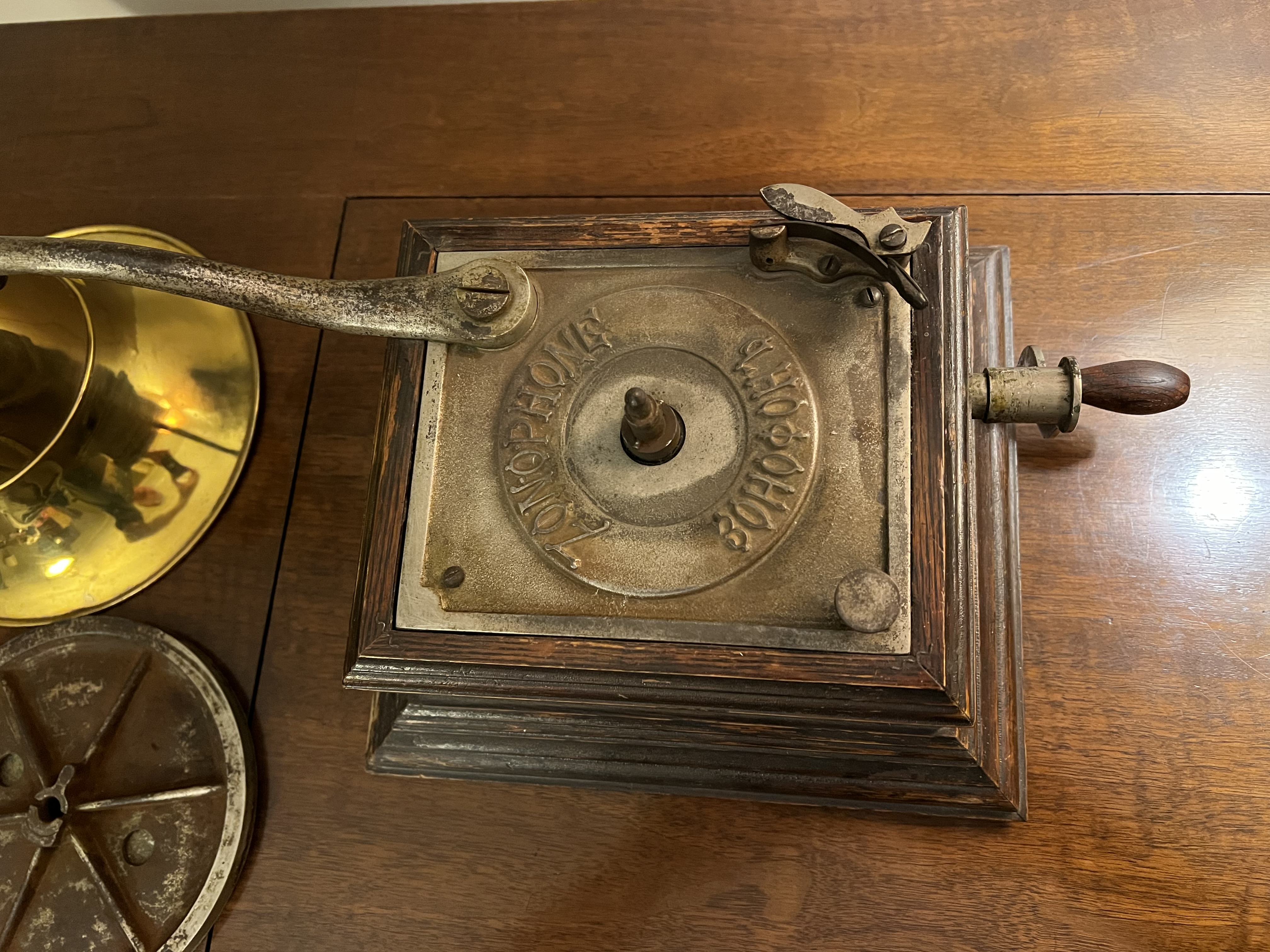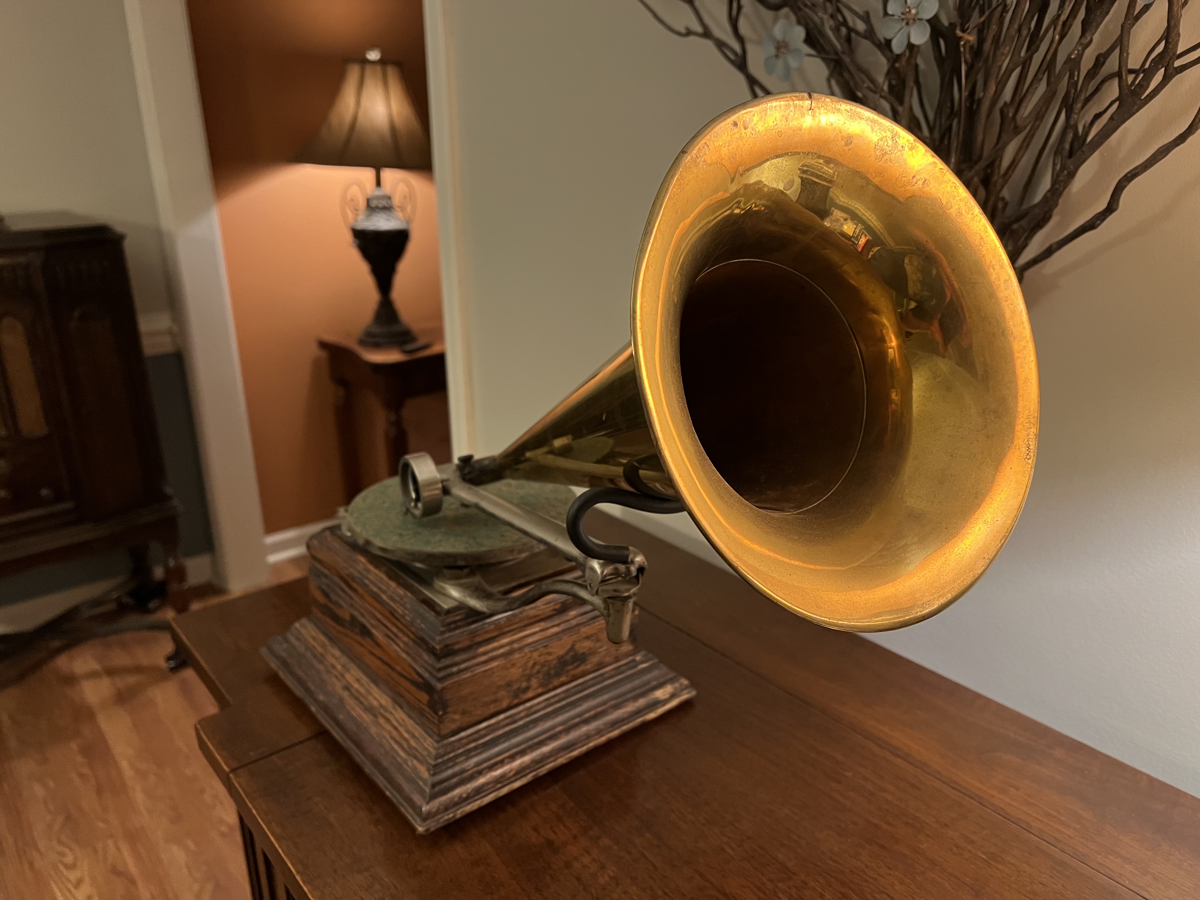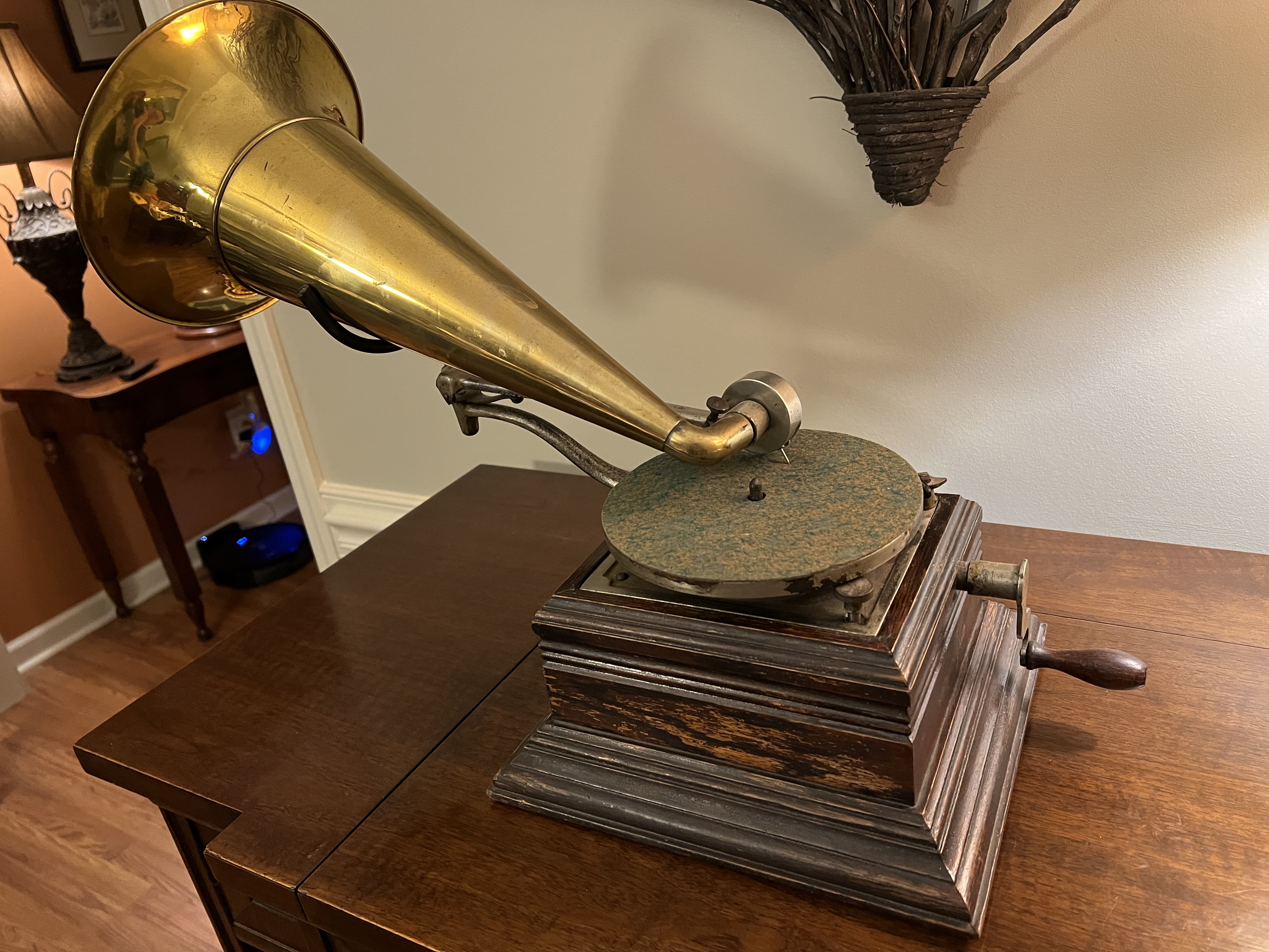 My listing for a pretty nice, mostly original Zonophone Home. Forum member straightened and polished the horn, as well as another rebuilt the concert V reproducer. Plays well and quietly. Finish and decal original as is all the phono except what is specifically mentioned in the description.