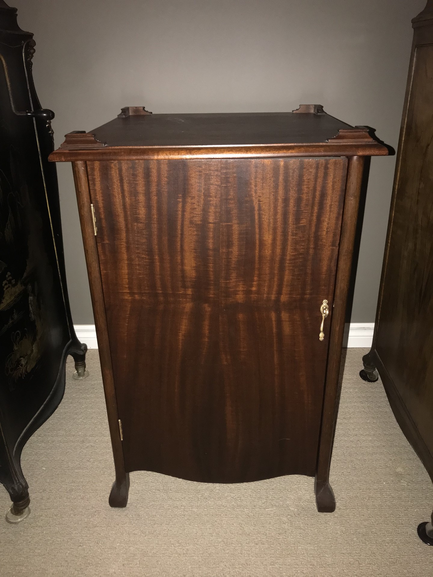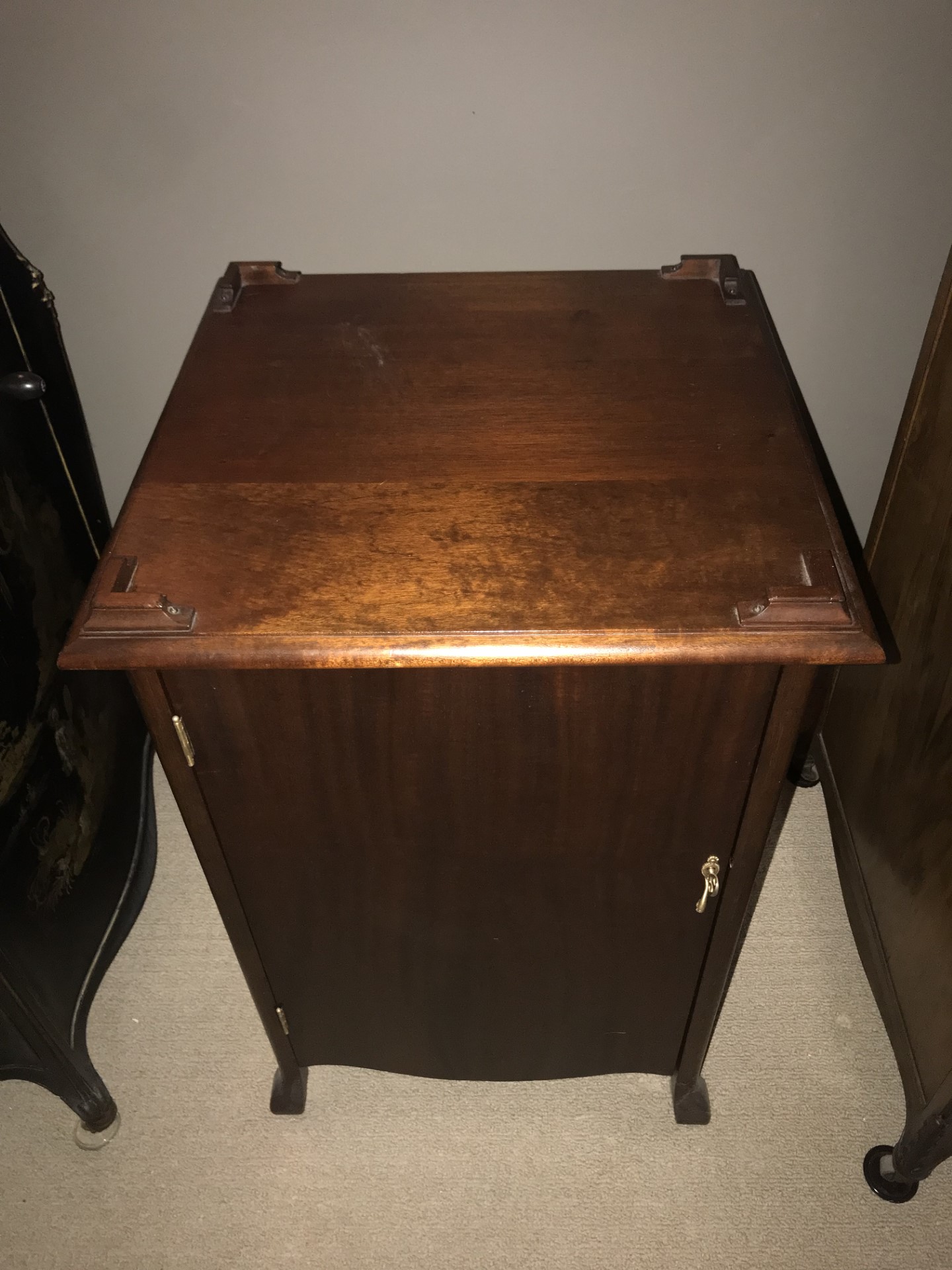 Selling this antique mahogany record cabinet. Excellent condition. Key and lock work. Size is 22" X 22" X 34" tall. The small wood blocks on the top are 18 ½" square inside measurements. The cabinet was refinished at some point in it's life before me and shows very well. Has a needle cup holder on the inside door