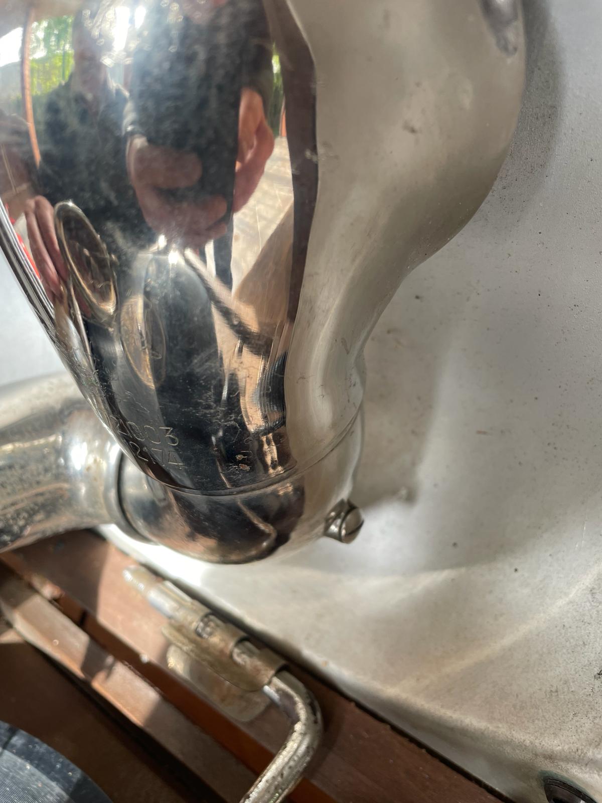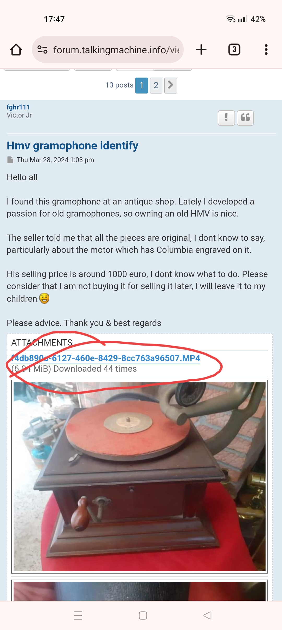 I have seen the seen the gramophone when I visited the gramophone dealer at his house. The visit was intended for me to buy other stuff and I liked that piece because of the wood horn . A few day later I asked the dealer to send me some pictures of that gramophone and the pictures I have attached are supposed to be from the same gramophone. Also the mp4 is meant to be from the same gramophone. I am not the person who made the pictures, my hometown is 350 km away from the antique dealer house