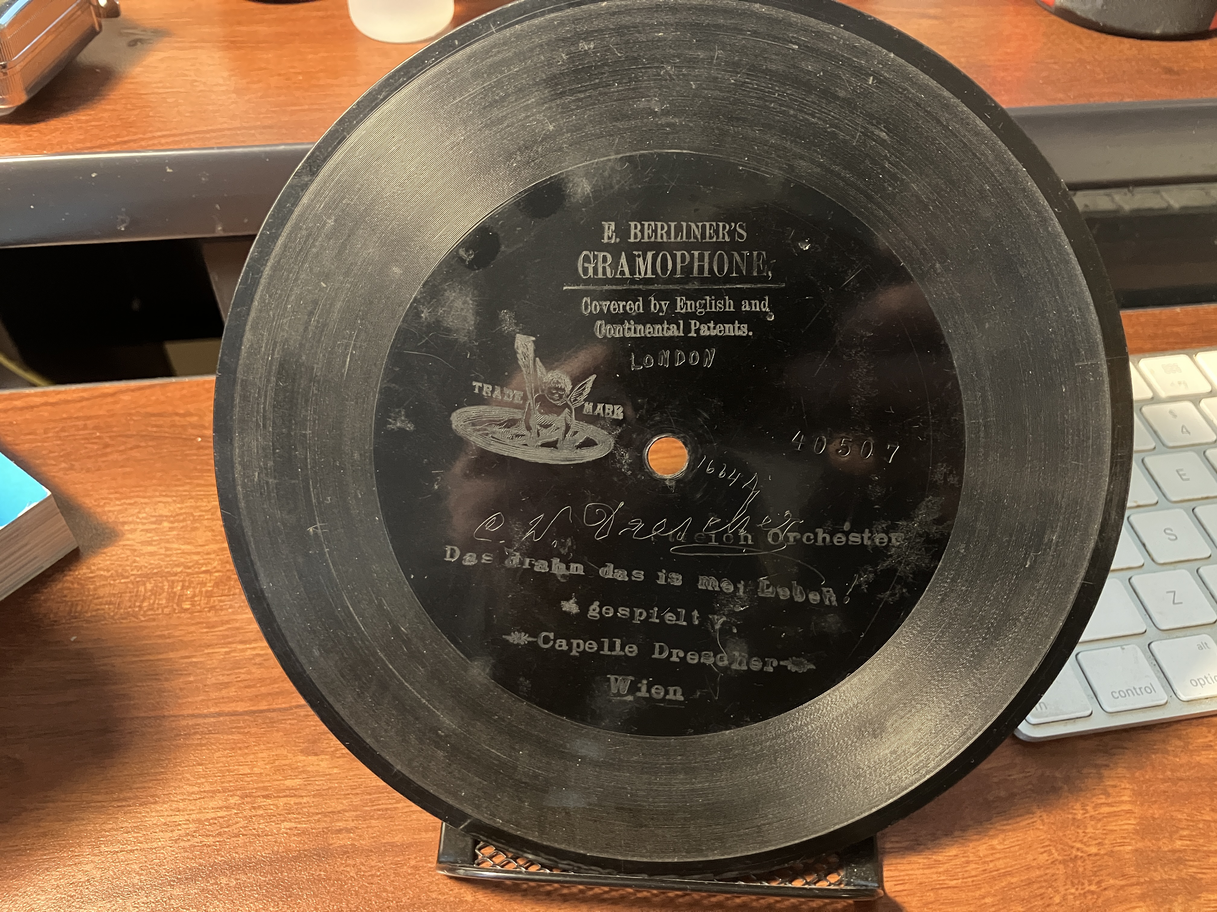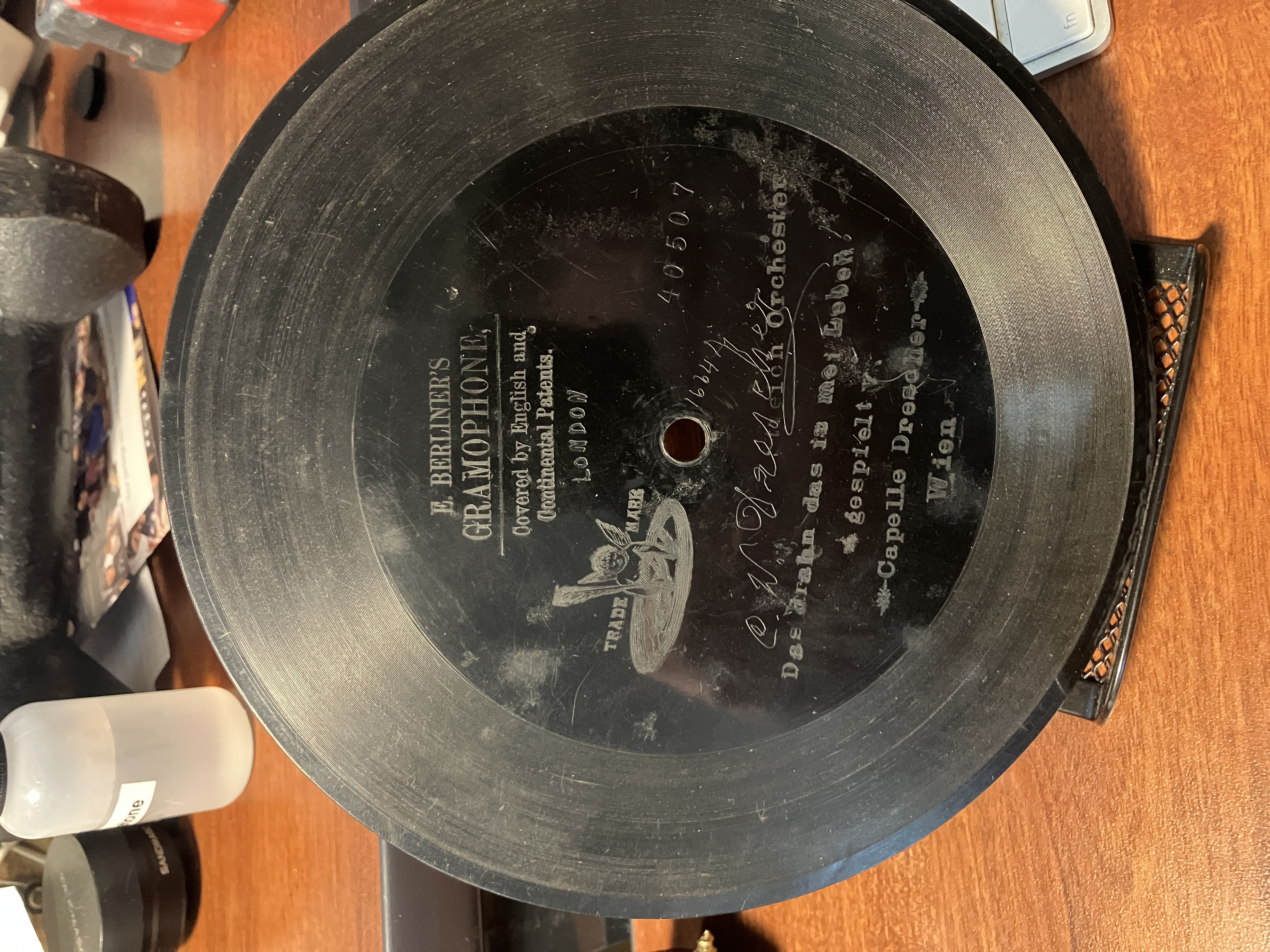 European Berliner #40507 by C.W. Drescher, "Das Drahn das is mei Leber" which I think translates to "That's My Liver", V-, even wear, plays and tracks fine with a Pickering 380 and 3.0 stylus. Sounds to me like a German drinking song. Likely pressed around 1898.