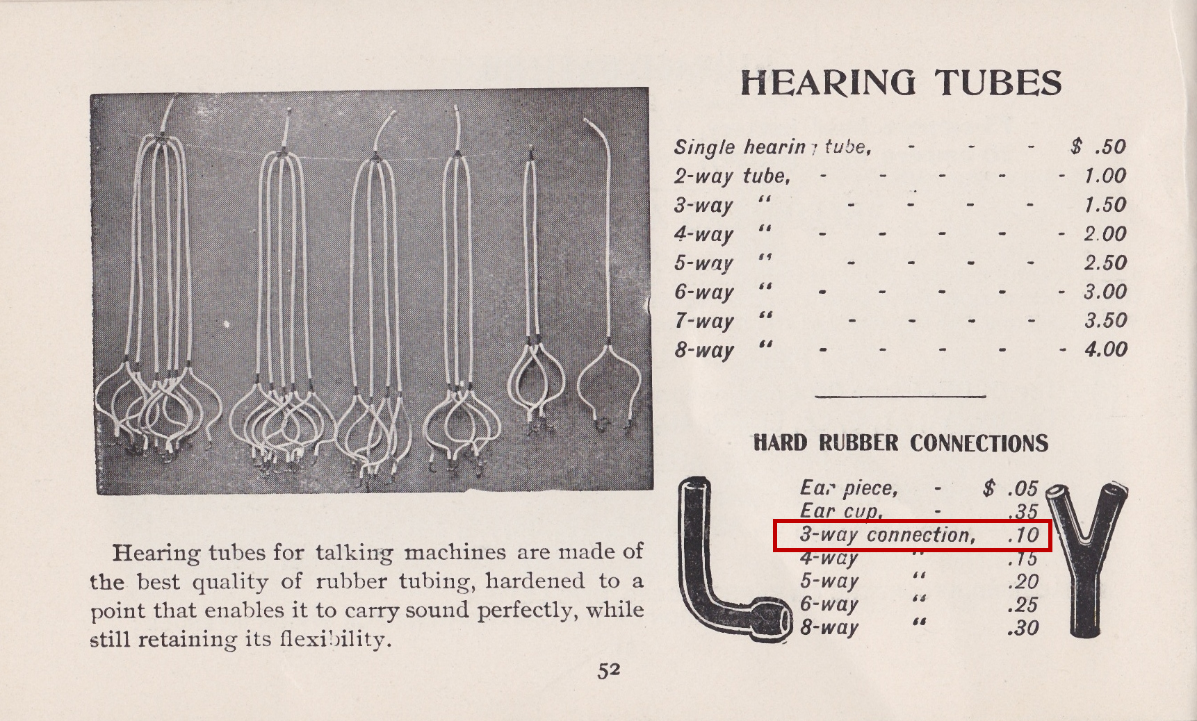Shown in a 1901 catalog page (for reference only) and for sale in this ad is a Three-way connector for listening tubes. This connector would allow three different people to listen to the same record, at the same time.