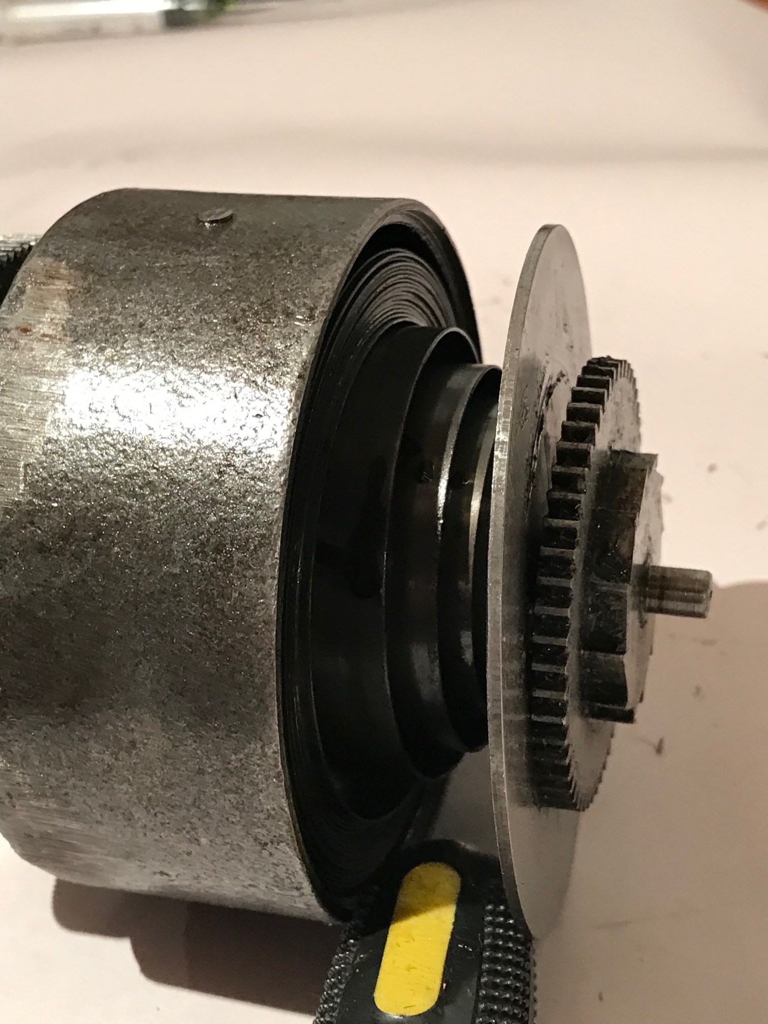 I have my friend's Edison Home cylinder player for rehab and reached the point now to remove the mainspring from its barrel. This is a job I've done for many Columbias and Victors but not for the Edison. In principle it should be the same, but I'd like to ask how to proceed. I've attached three pictures.