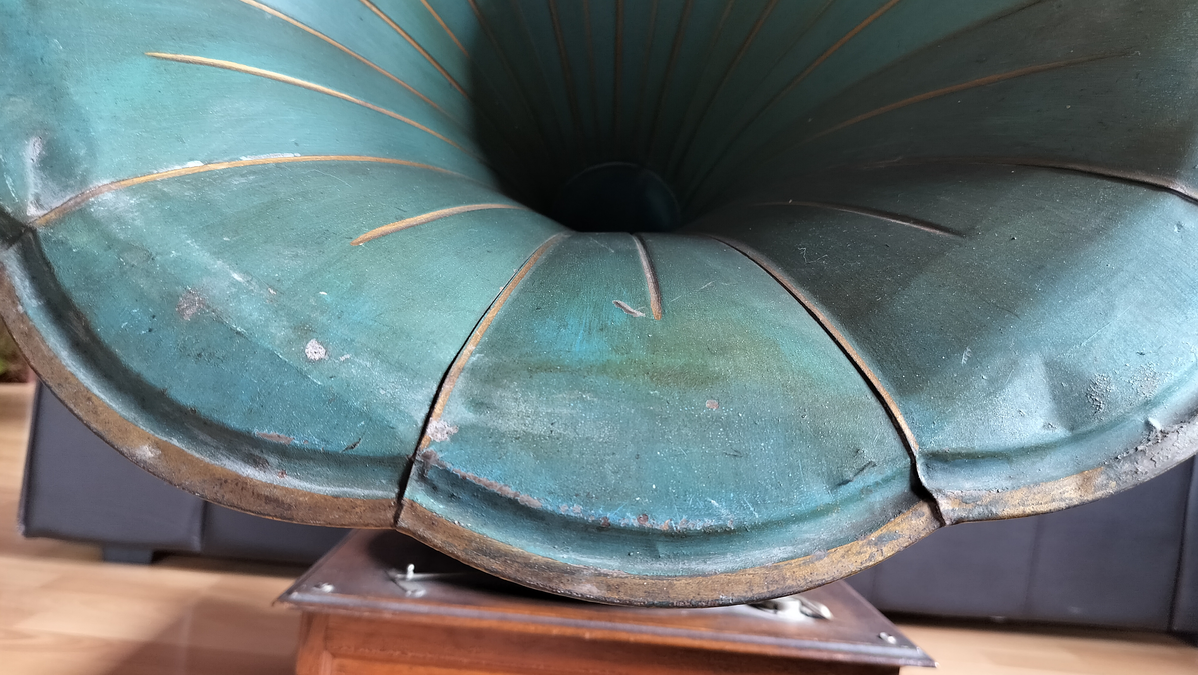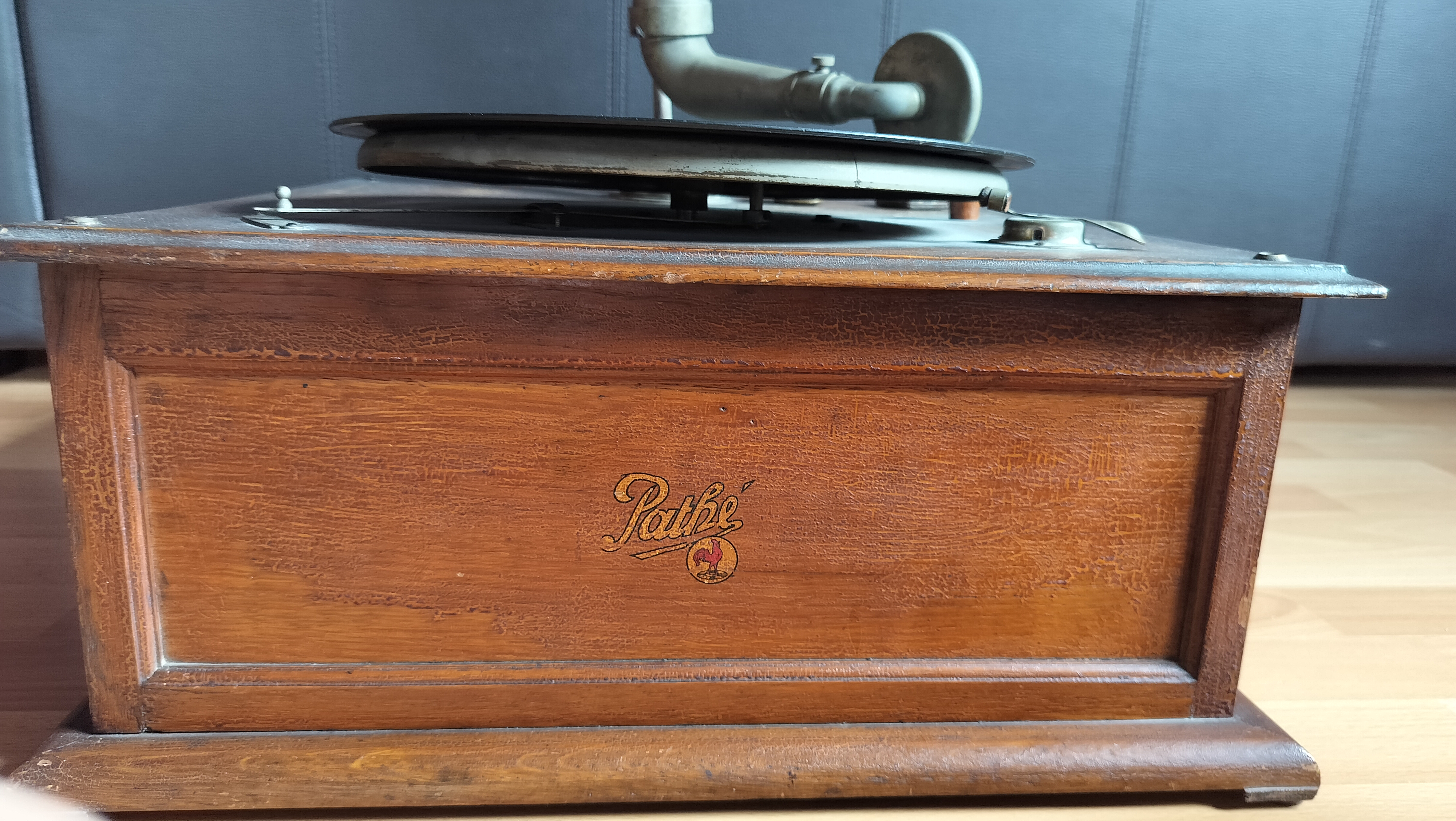 2. as to the wooden casing : it has de pathé logo on the front. It shows some blackness and cracks which I think is old varnish. I'd like some advise as how to best remove it (I will steer clear from the logo as I can in no way reproduce that)