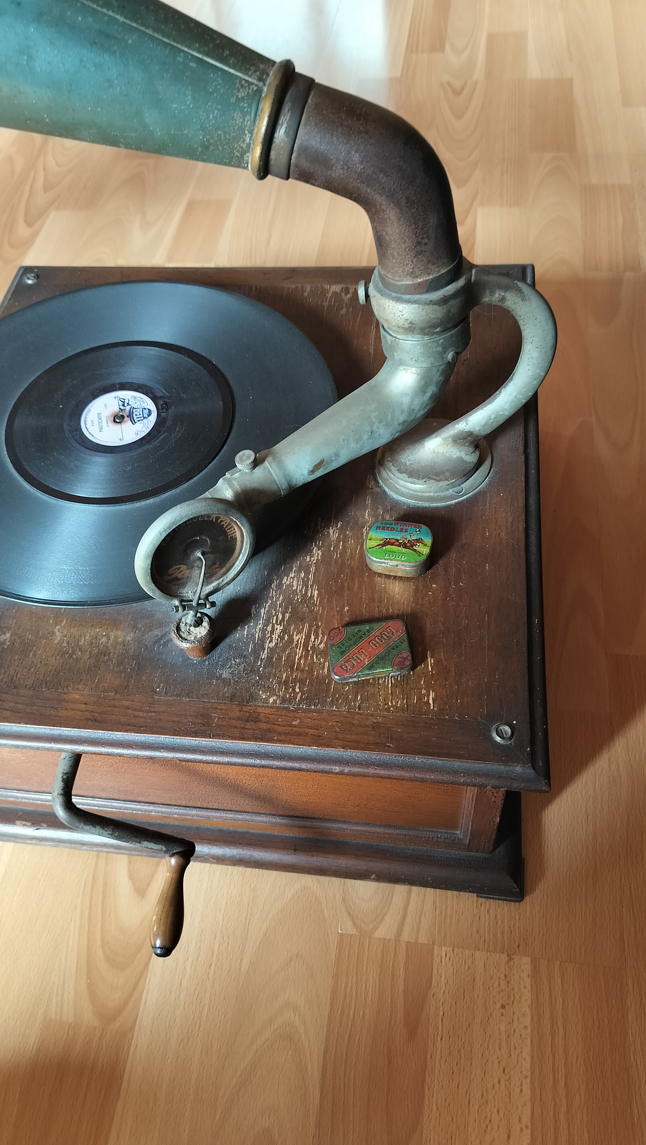 We have been given a Pathé phonograph on which we have some questions and like some advice as to the preservation/restauration of it. It works fine, there are no weird noises when the crank is turned and I have the impression that the spring is still in good condition. It plays loud and clear (using a steel needle) on the pathé records that went along with it