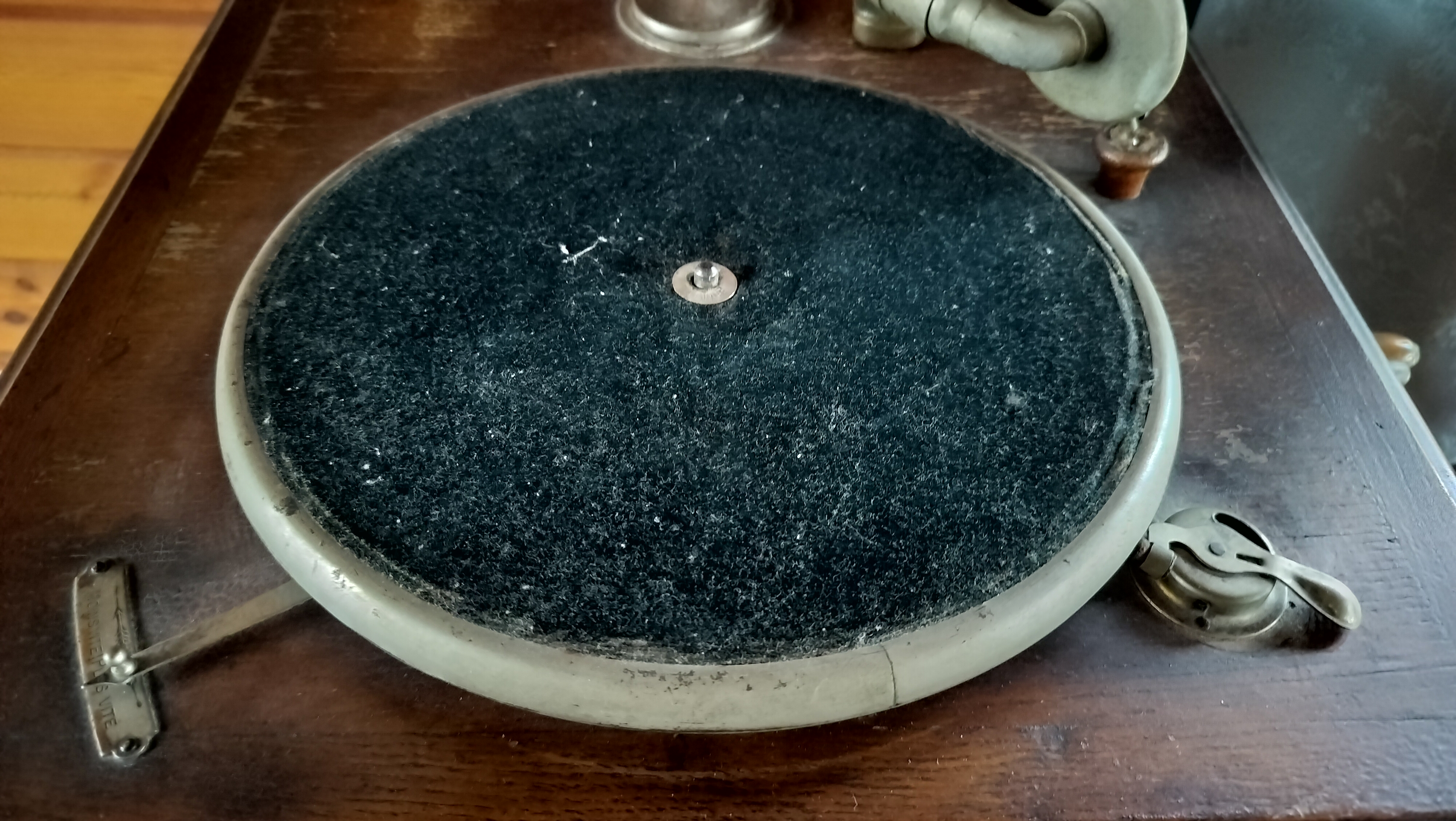 1. I'd like an indication of the year of build as I cannot find information (no serial nr or date) on the wooden casing (not front or back or under) . I have not opened it so maybe there is something inside. I've found several pictures of Pathé players but none with the horn support on top.