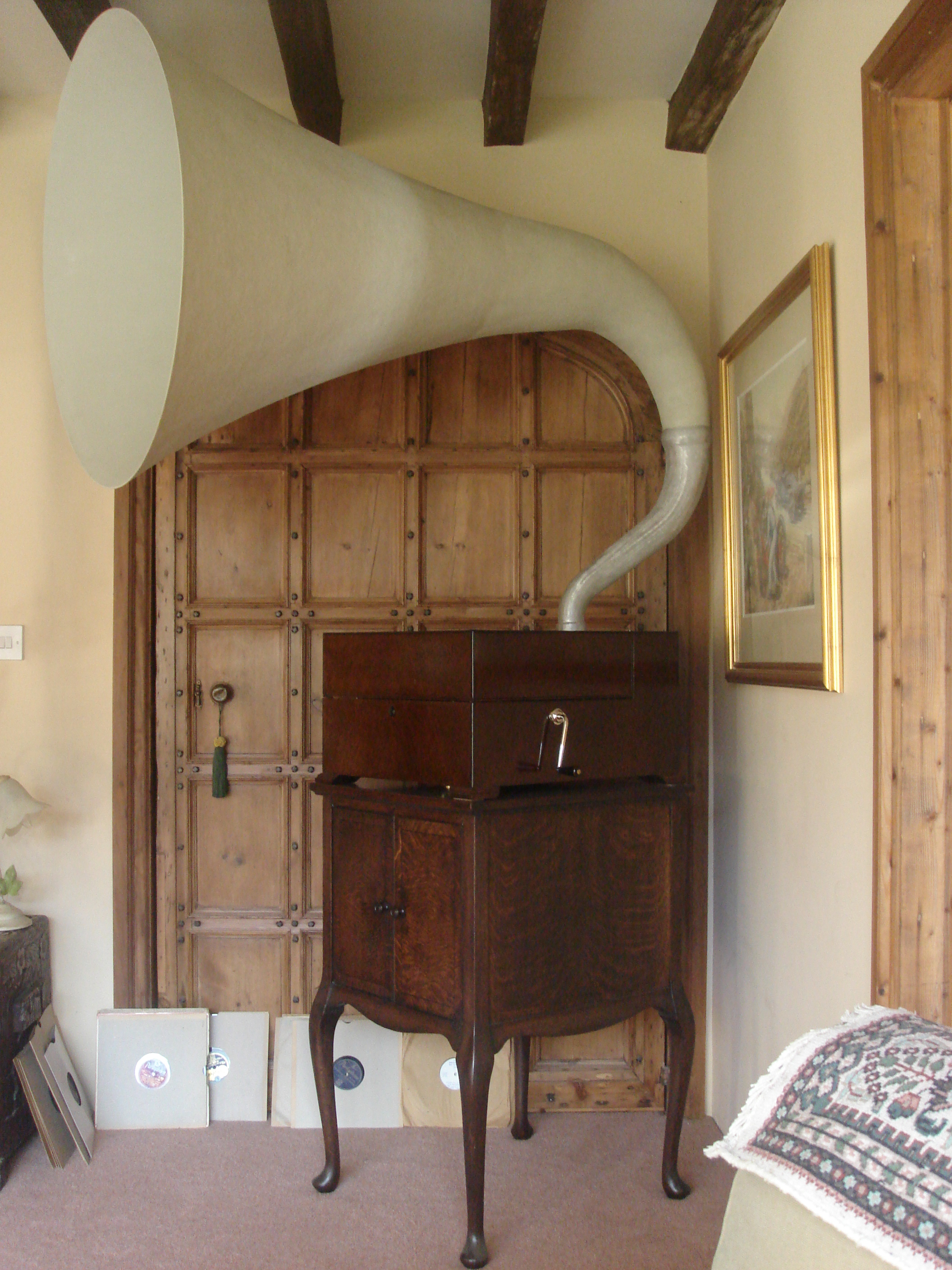 Another variation can be seen here : https://www.youtube.com/watch?v=8jSOzteh8qA I think the beautiful cabinet was built by a furniture maker with a small internal wooden horn. This allowed demonstration of old and new technology with the use of two tonearms---each playing out of a different horn. By using the two together it was also possible to produce a kind of reverb' or simulated "stereo" sound, the extent of which was controlled according to the timing of needle placement. Lots of fun !