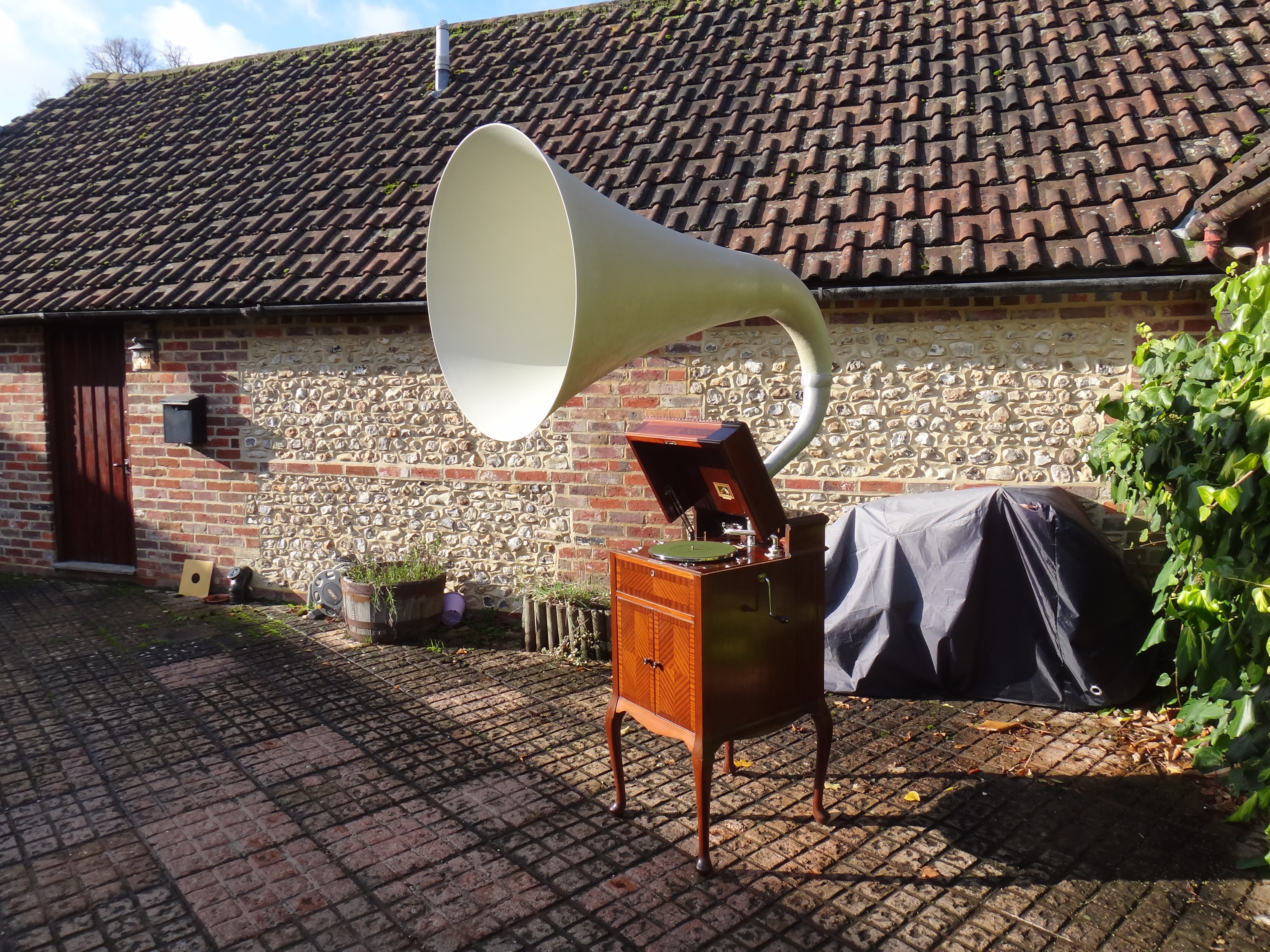 Another variation can be seen here : https://www.youtube.com/watch?v=8jSOzteh8qA I think the beautiful cabinet was built by a furniture maker with a small internal wooden horn. This allowed demonstration of old and new technology with the use of two tonearms---each playing out of a different horn. By using the two together it was also possible to produce a kind of reverb' or simulated "stereo" sound, the extent of which was controlled according to the timing of needle placement. Lots of fun !