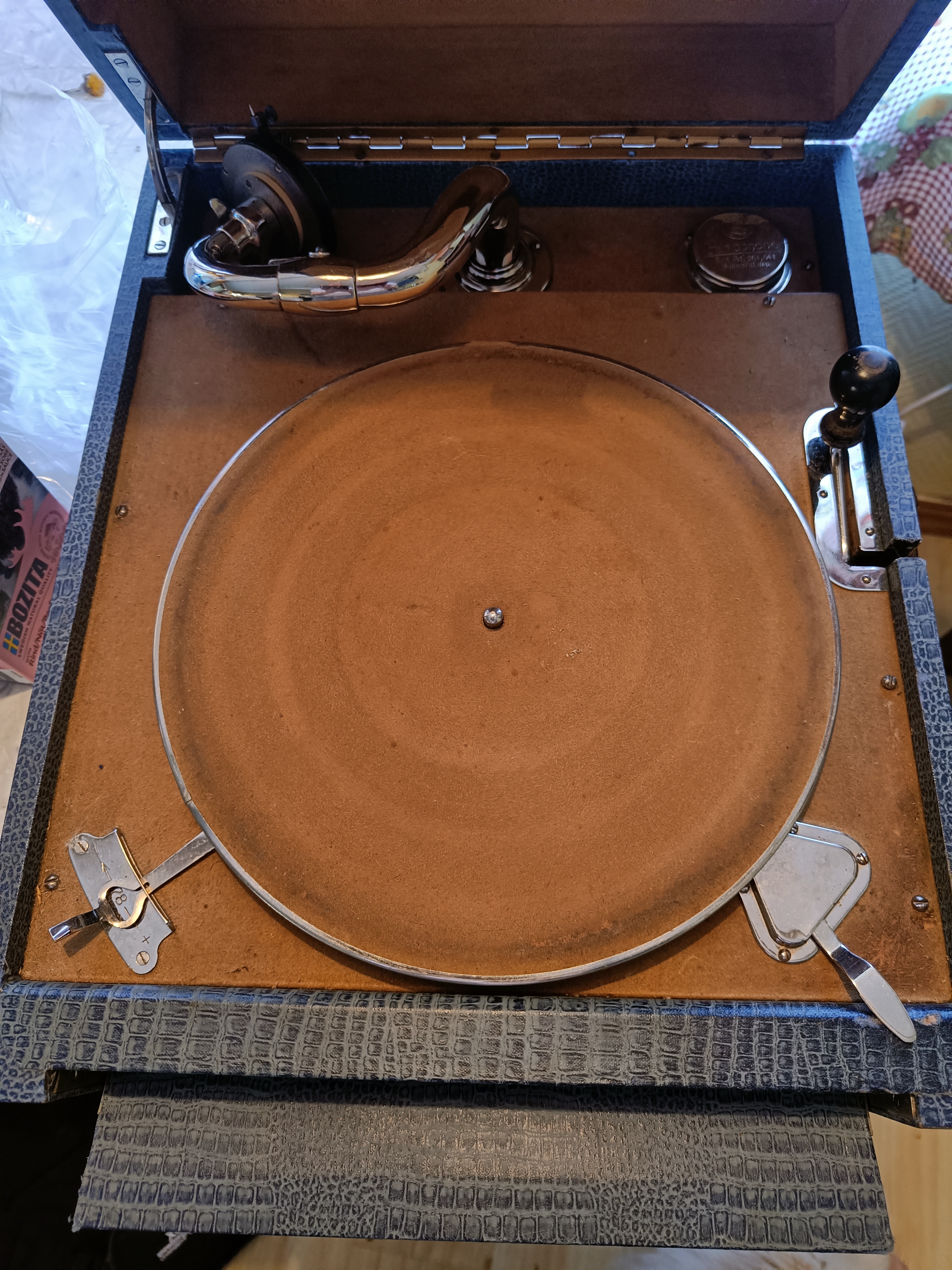 I share some photos for rererence of a Parlophone Primax portable that came my way yesterday. I really have tried to stop buying more portables, but I wanted two records that came along with it, and the seller wanted to get rid of the portable..so well, then it ended (again) in my car. I have not yet checked the motor, if it is a single or double spring, it however runs and plays well...