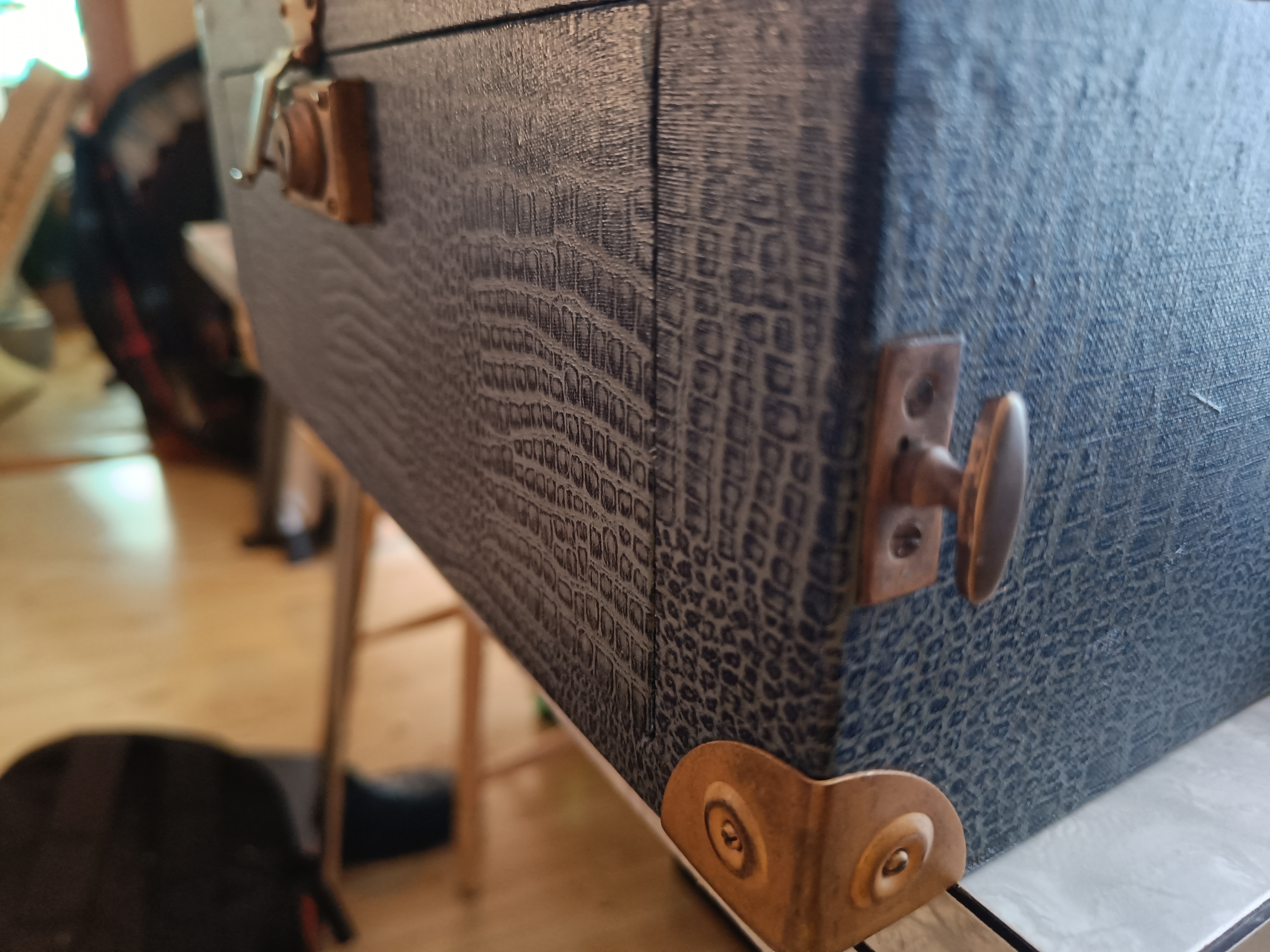 But then...I had a closer look at it, and my eye fell on the "camel skin", the gilted corners and sound box, and I realized this probably was a de luxe version, also taking into consideration the blue cover.