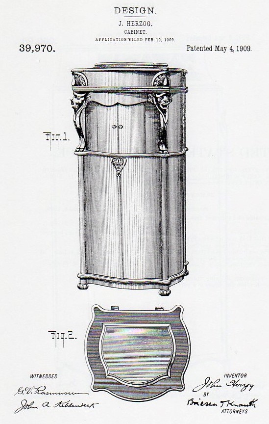 May 4, 1909: John Herzog was granted U.S. Design Patent No.39,970 for the cabinet that was marketed as the Columbia Grafonola “Deluxe.”