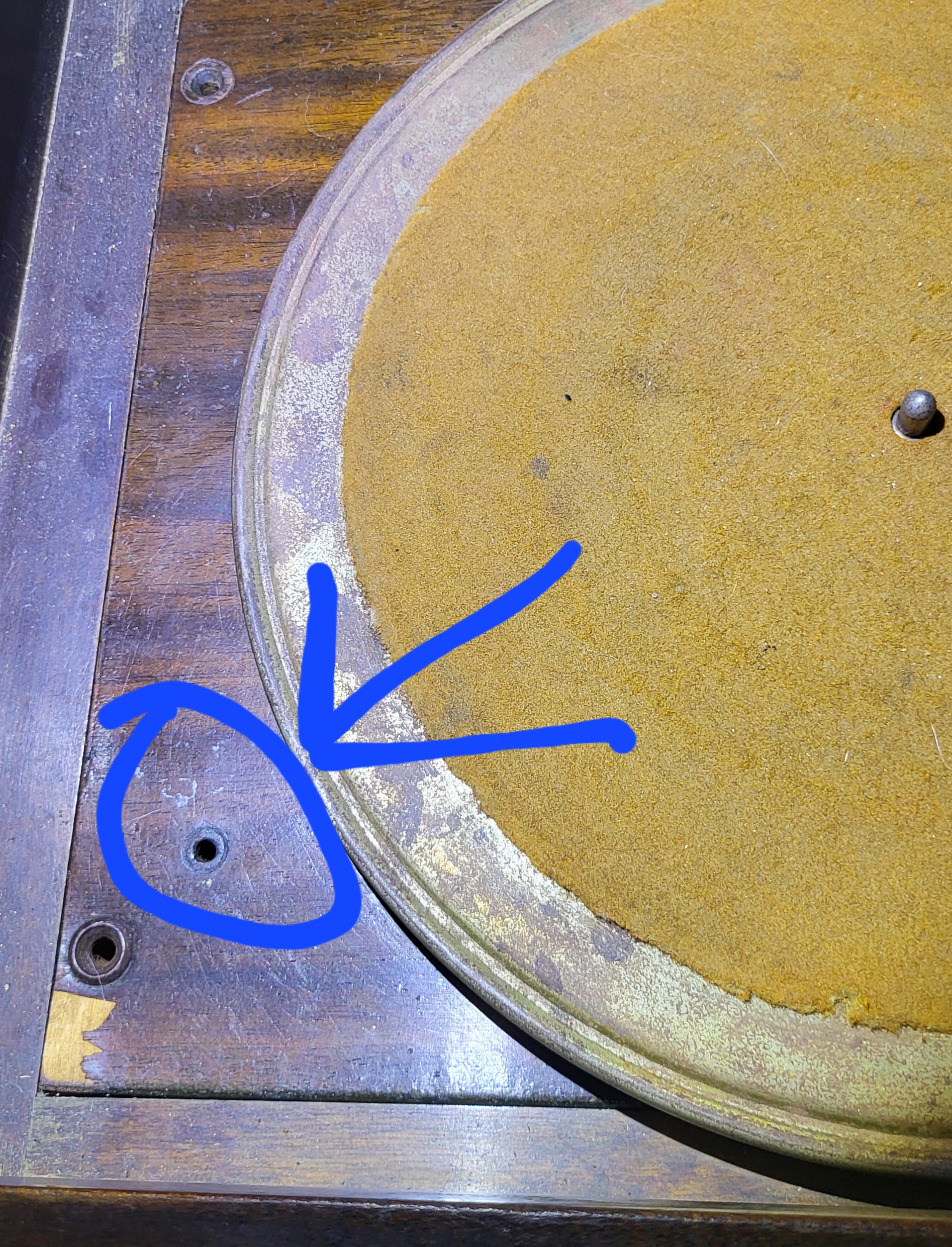 Hello all. I've recently acquired this vv 4-3 that I am attempting to restore. I pulled the motor apart and cleaned the 100 year old grease out. Repacked the mainspring and got the motor running smooth as glass. I noticed this hole to the left of the turntable. It had a person appropriate bolt in the hole. But was not holding anything to it. I was wondering if anyone here could tell me what this might be for? Am I missing more parts? Thank you again for all your help.