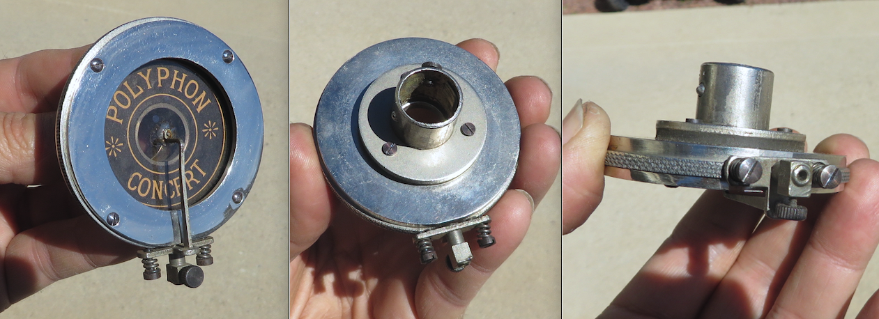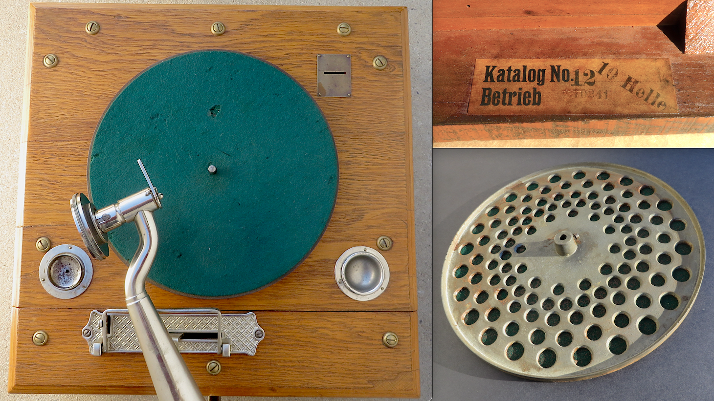 This German made Polyphon-Automat 12 was likely made just prior to WWI. One of the photos shows how it looked in the 1910 catalog. Note that the design of the tonearm rest has been simplified from the 1910 version.