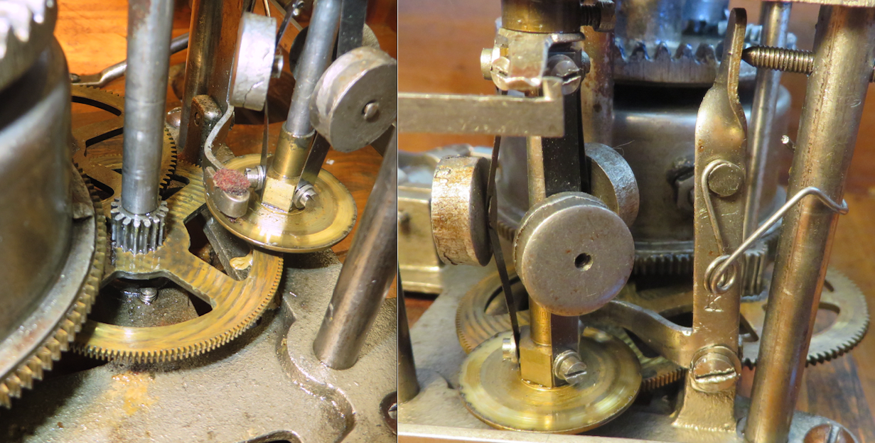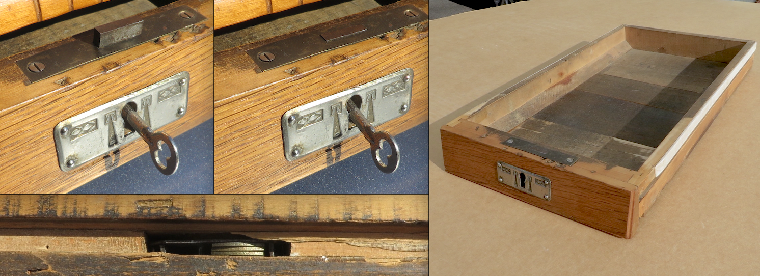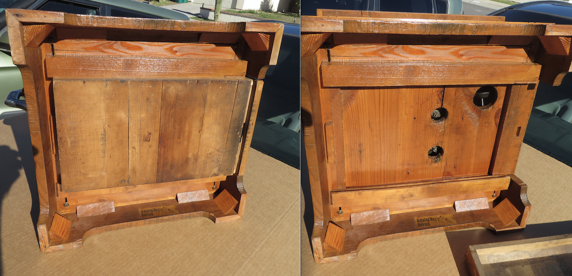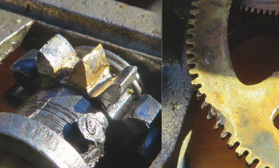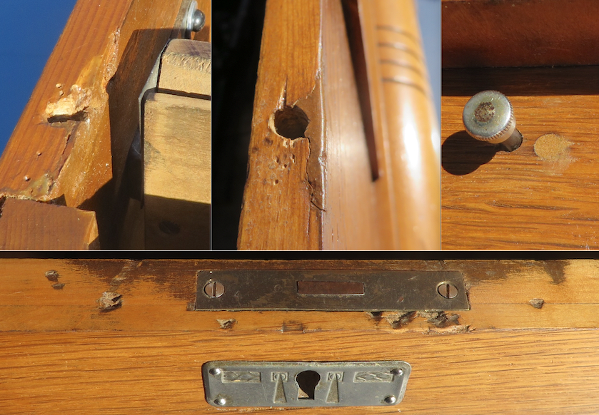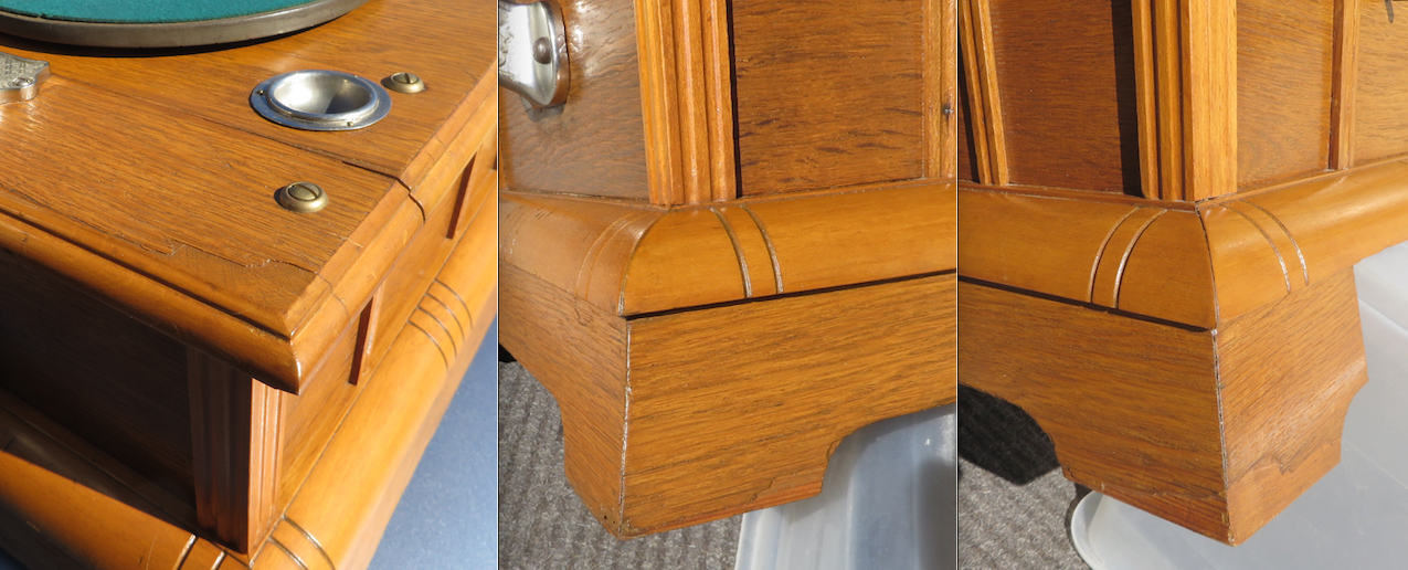 I have pictured an old repair, a replaced a tooth in its winding gear. Also pictured is the gear that drives the governor, it shows several damaged teeth. Both of these operate as they should. When winding, you can feel a difference in the winding gear’s fit. Due to shrinkage in the drawer, thin extensions have been added to the sides, they now rest on the corresponding rails without binding. The used needle cup is made with a hole in it for disposal of the needle. There is no evidence of a receptacle under it and a small screw top jar was affixed to contain them. The veneer is thin and there are several inconspicuous sections missing. The horn was made from new and old materials to resemble a European styled horn.