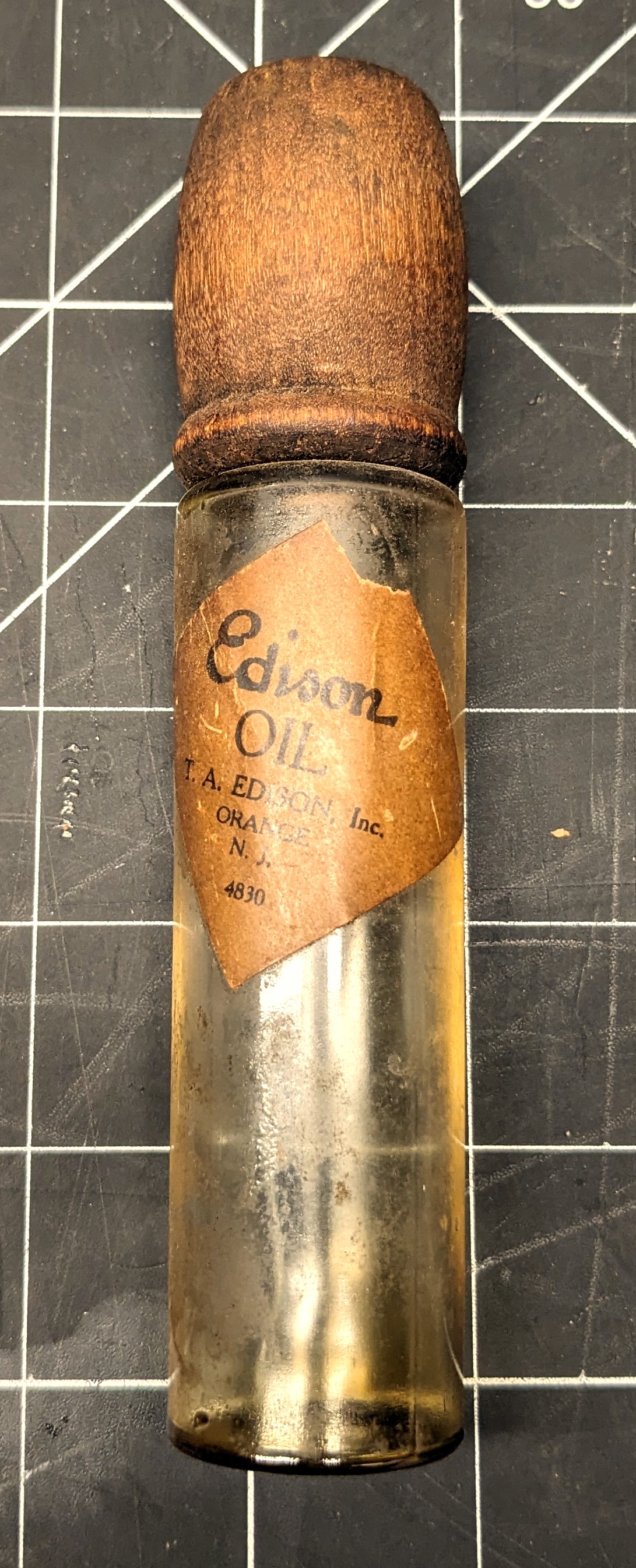 Here is a great original Edison oil bottle with the original paper label and wooden top. Stunning display piece for your phonograph. And all Edison phonographs require oil, right???