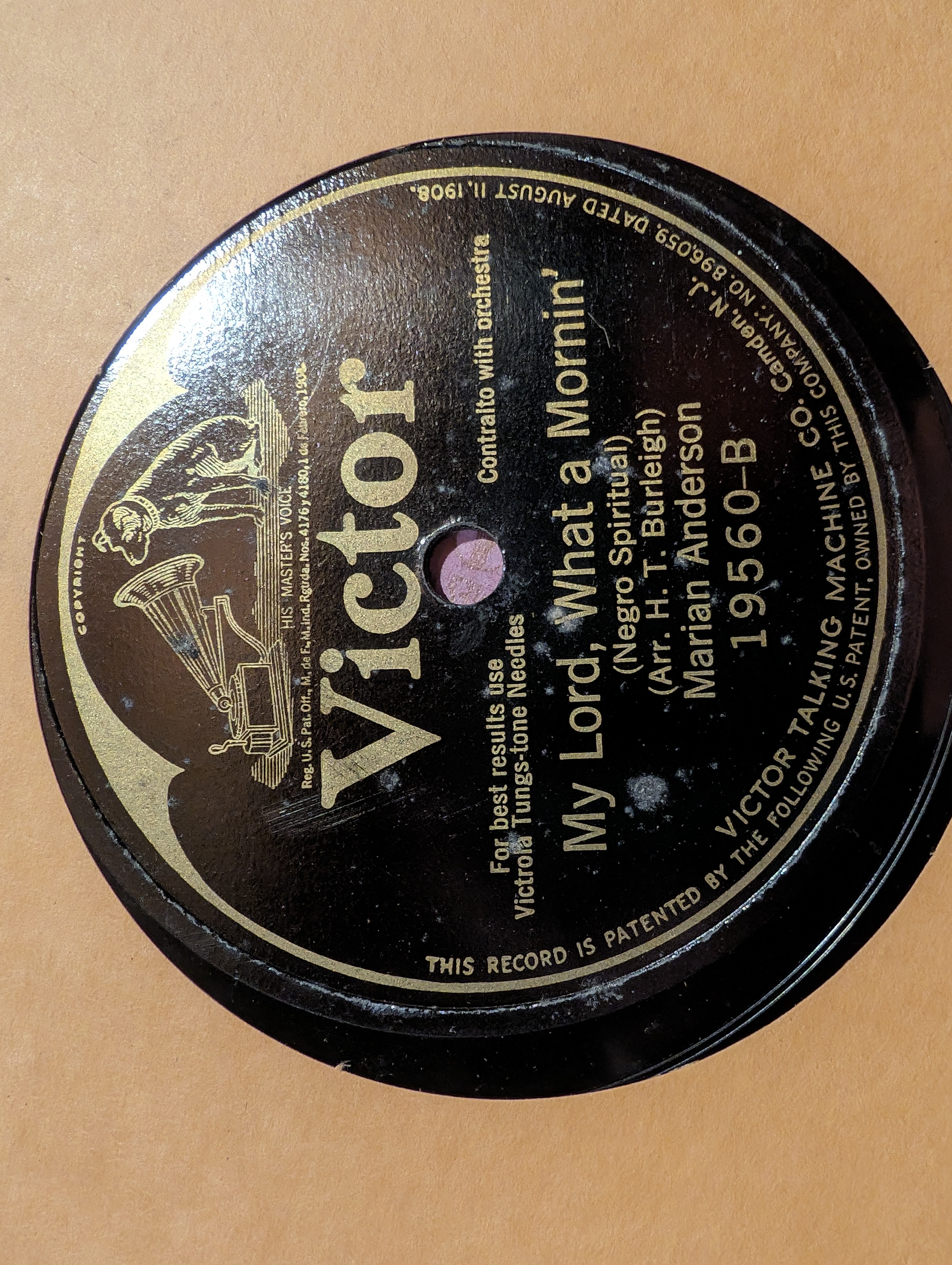 While sorting through a batch of records I've had for many years, I came across this one, and found it particularly intriguing; I've never known of a pre-electric recording of Marian Anderson. Actually, I've never known of a recording of her from before the late 1930's. (Judging by the catalogue number, it seems this one dates from 1925.) I imagine this must have been very early in her career. Does anyone know of other records of hers from this era?