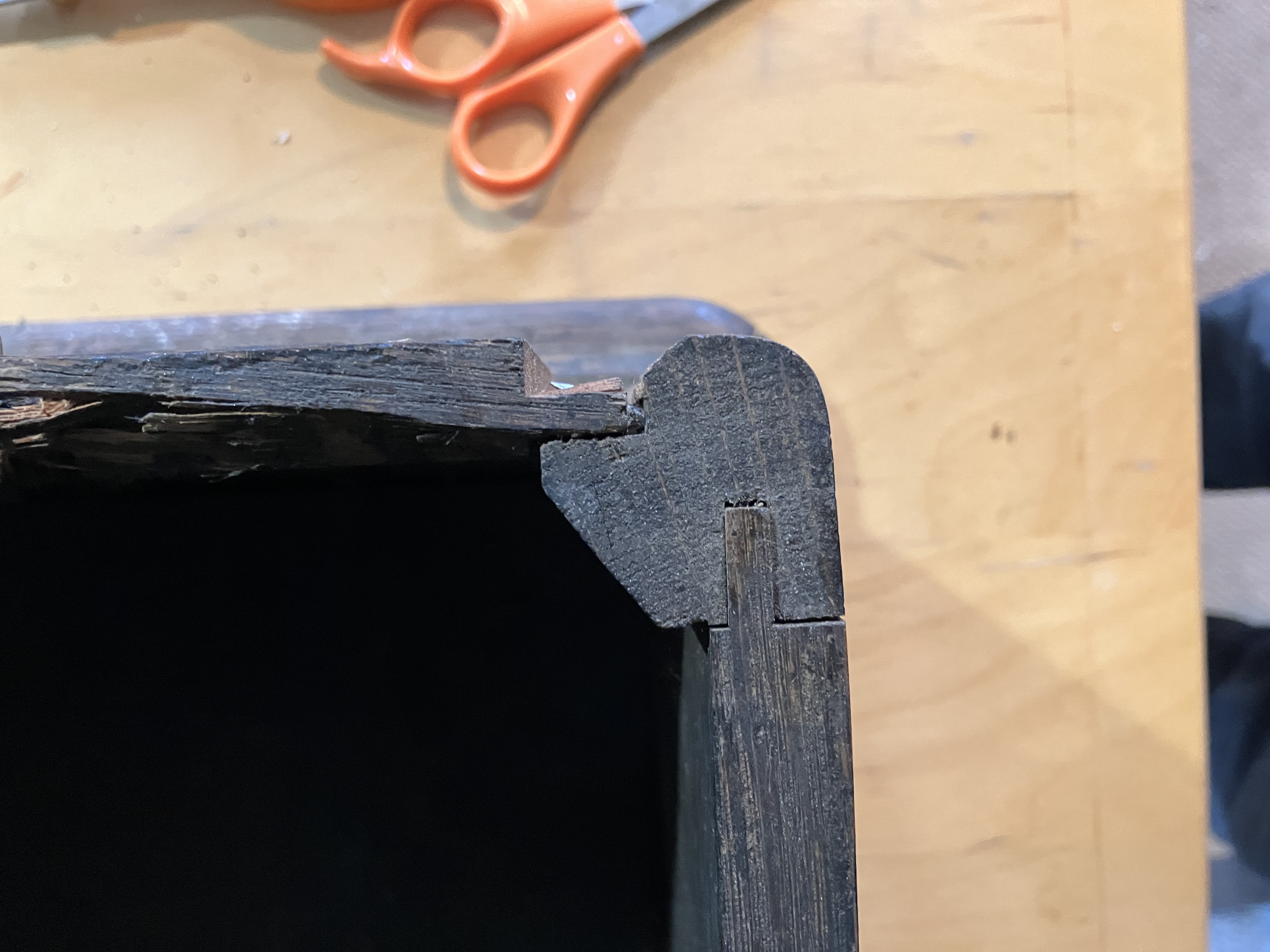 On the other hand, if someone just happened to have the remains of an old Triumph case, and it had three corners.... I think all corners are identical, some just turned upside down. One on the left has been screwed into, so that makes three damaged or with wood missing.