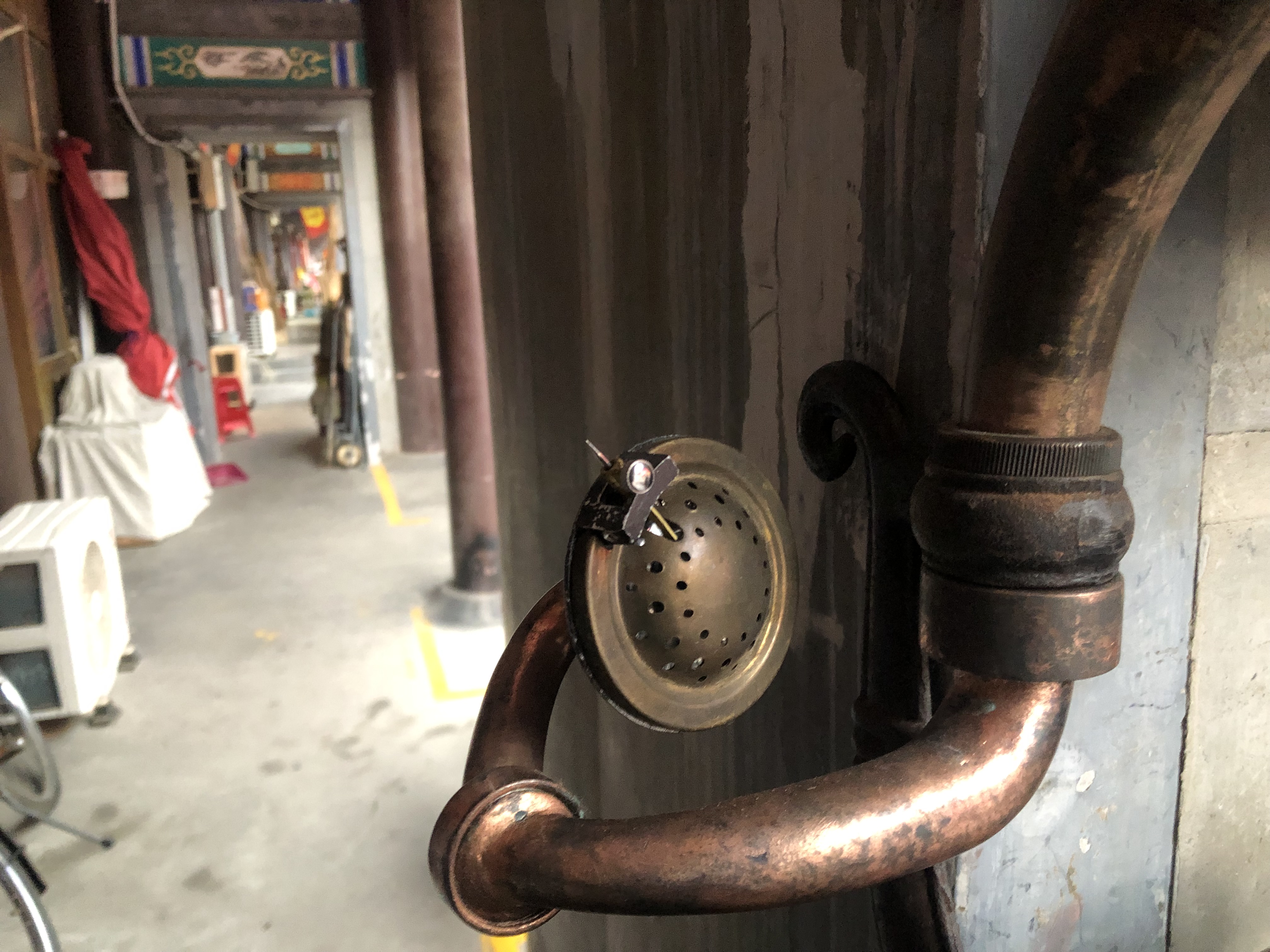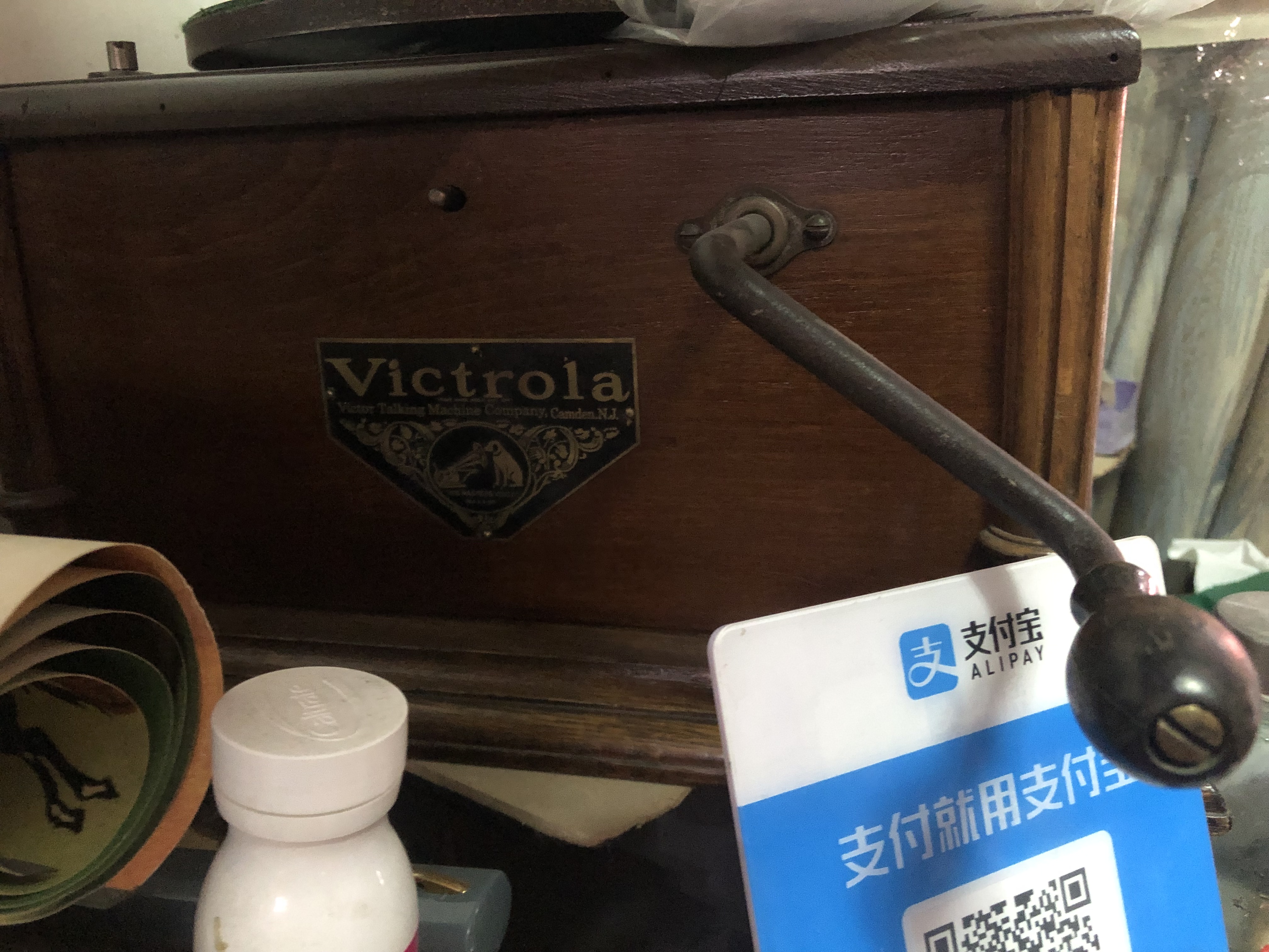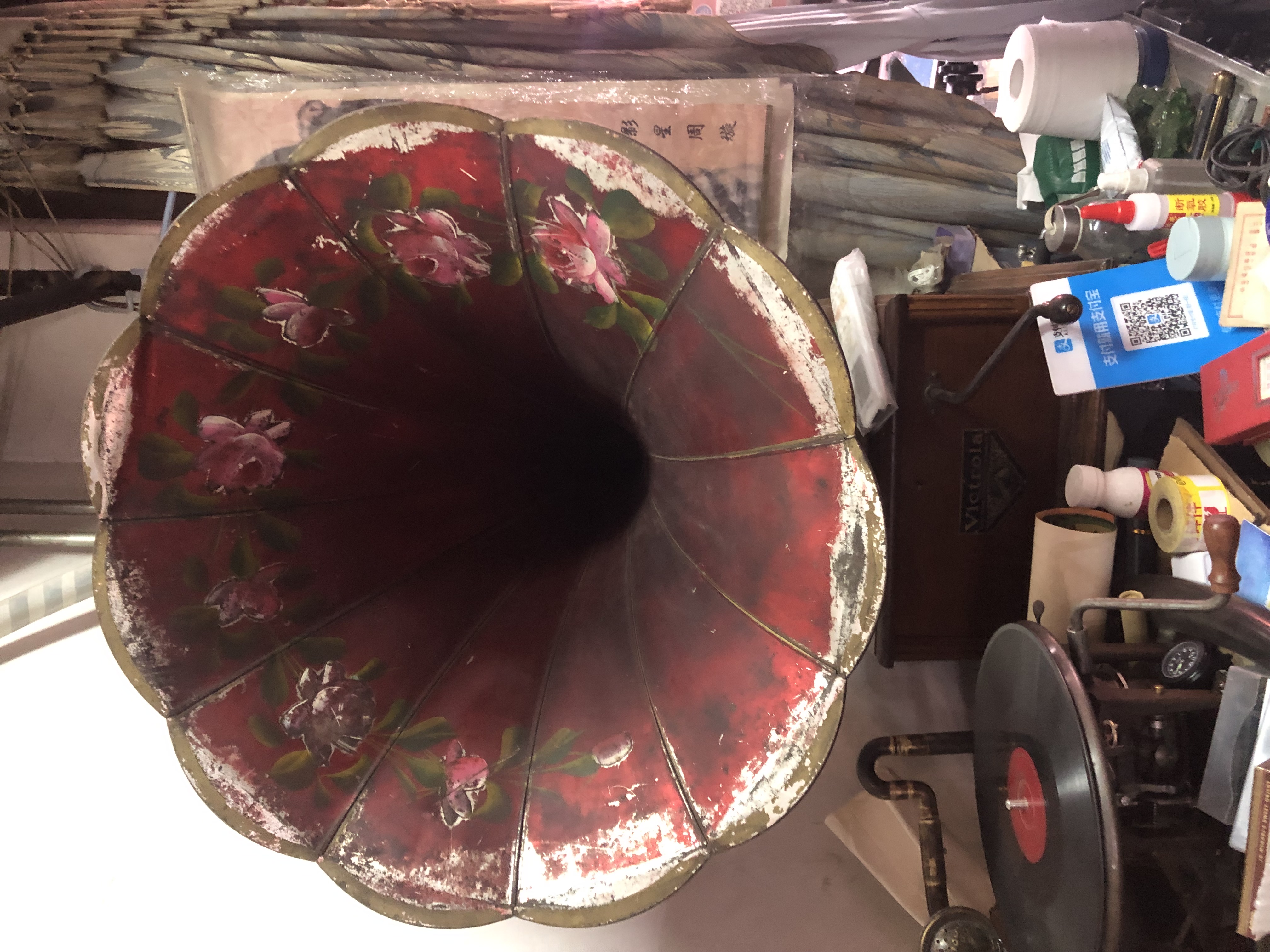 Yesterday I spotted two Horn gramophones with Victrola metal plates in Beijing. Both were of a similar design except that one had a heavy horn made of copper and the other had a tin horn painted in red. The wooden boxes, back brackets and tone arms of the two gramophones were of very fine quality. Certainly they were not of crapophone class. And I judged them as of Frankenphone category.