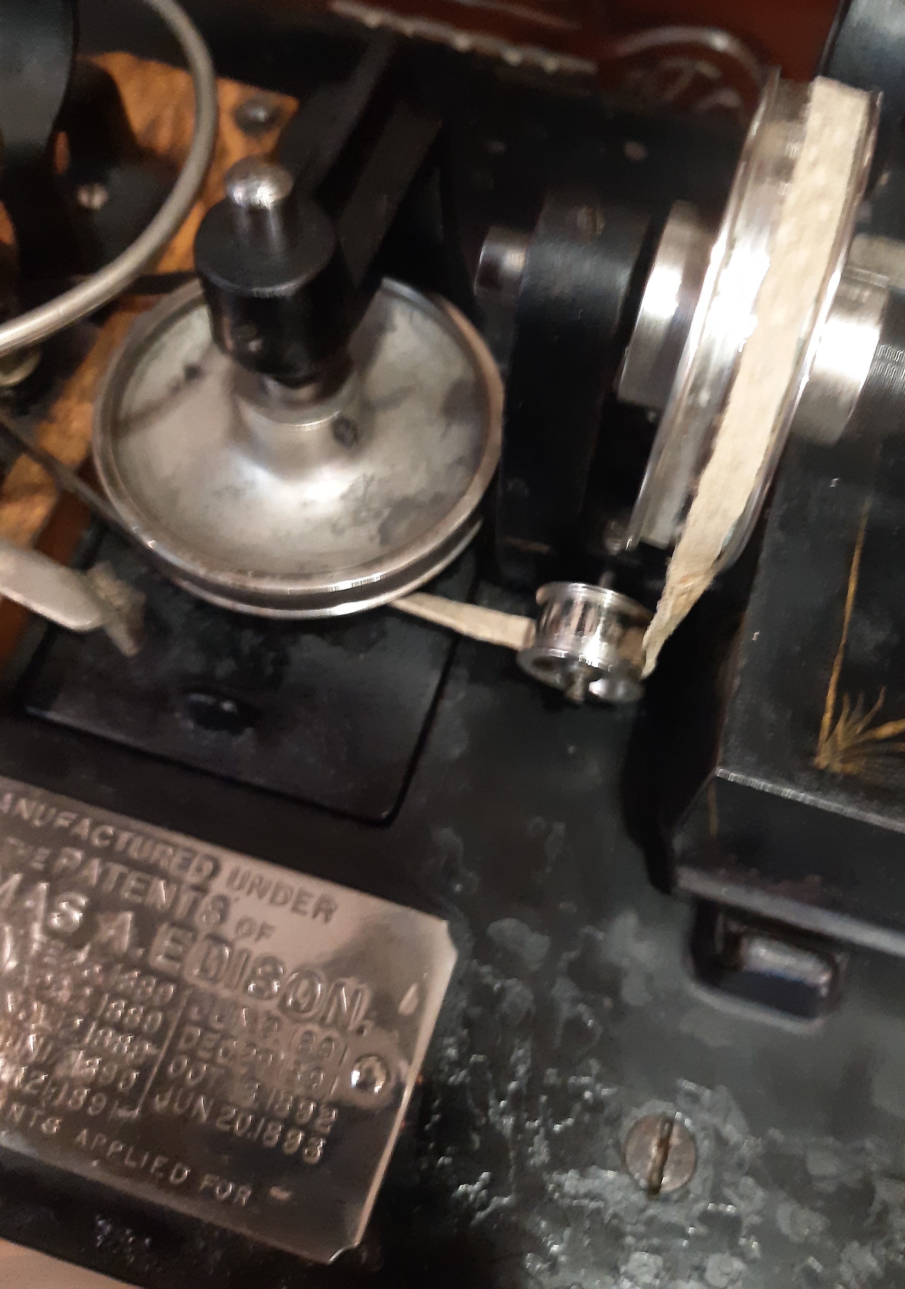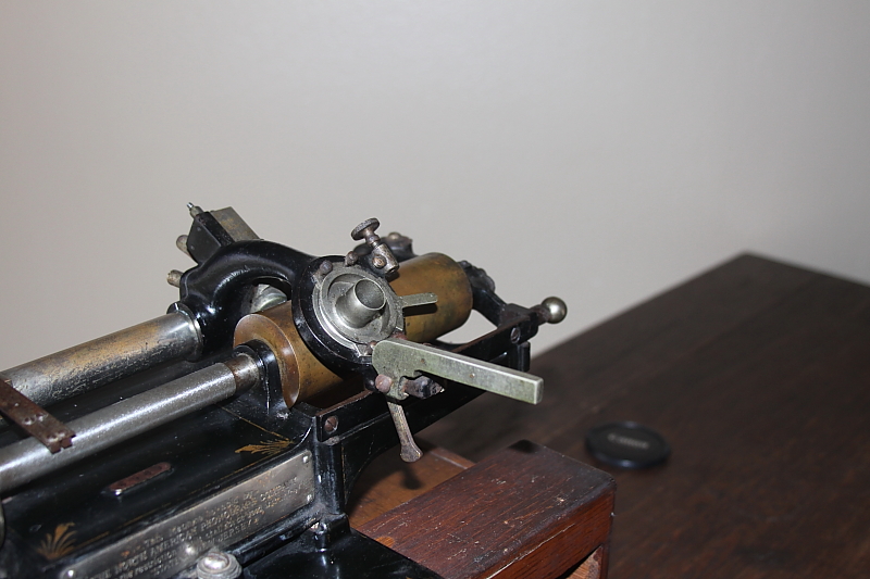 Jerry, the two empty holes at the top of the carriage were meant for a positioning wire (front) and its set screw (rear). This wire and the post seen on the Standard Speaker's tube plate were used to ensure the proper positioning of the cutting jewel with a speaking tube, and the reproducing stylus with a listening tube. Notches in the ferrules of the speaking and listening tubes prevented accidentally mixing the devices. These vestigial features are sometimes found on later machines due to the recycling of Edison Class M upper works.