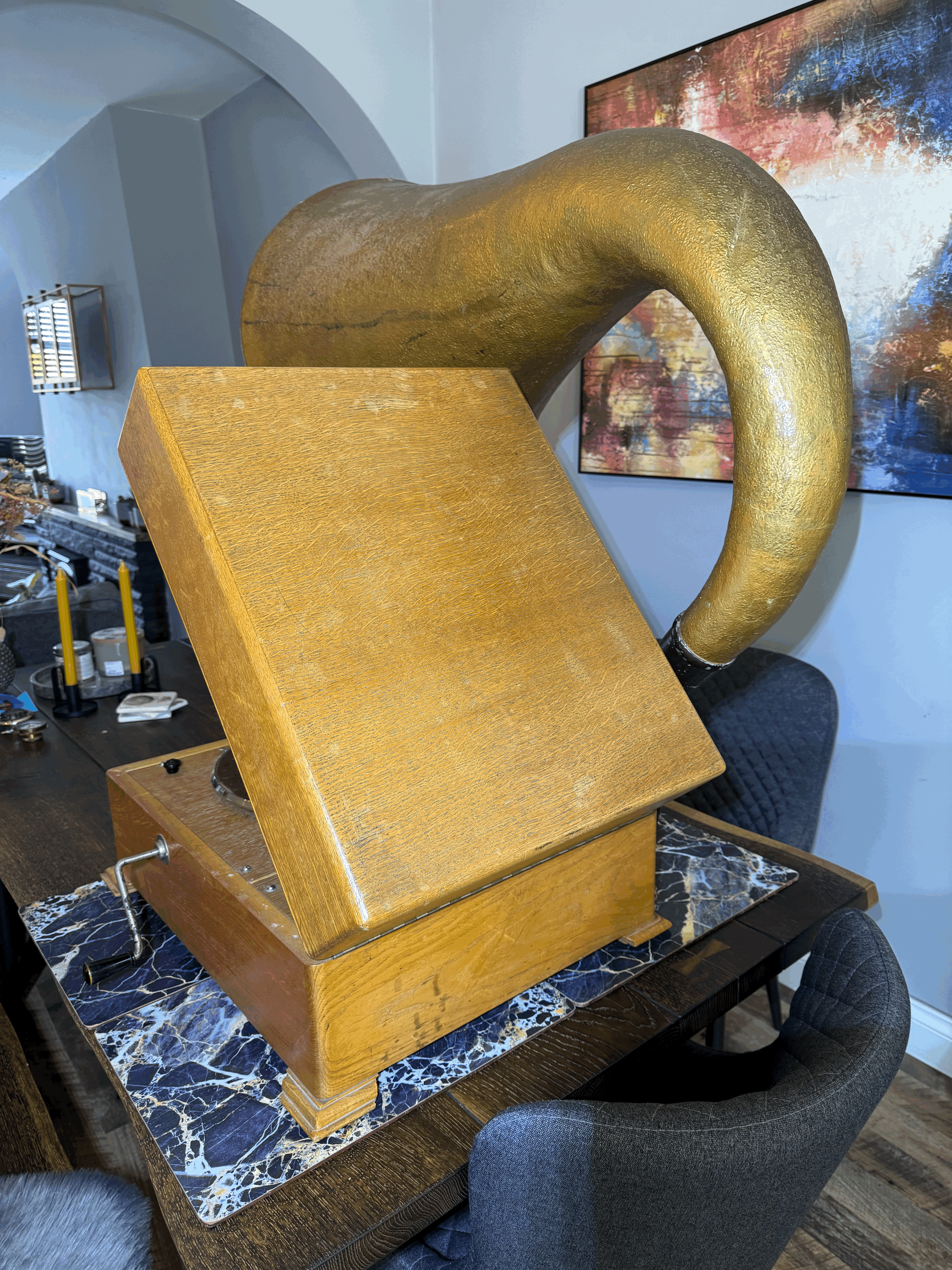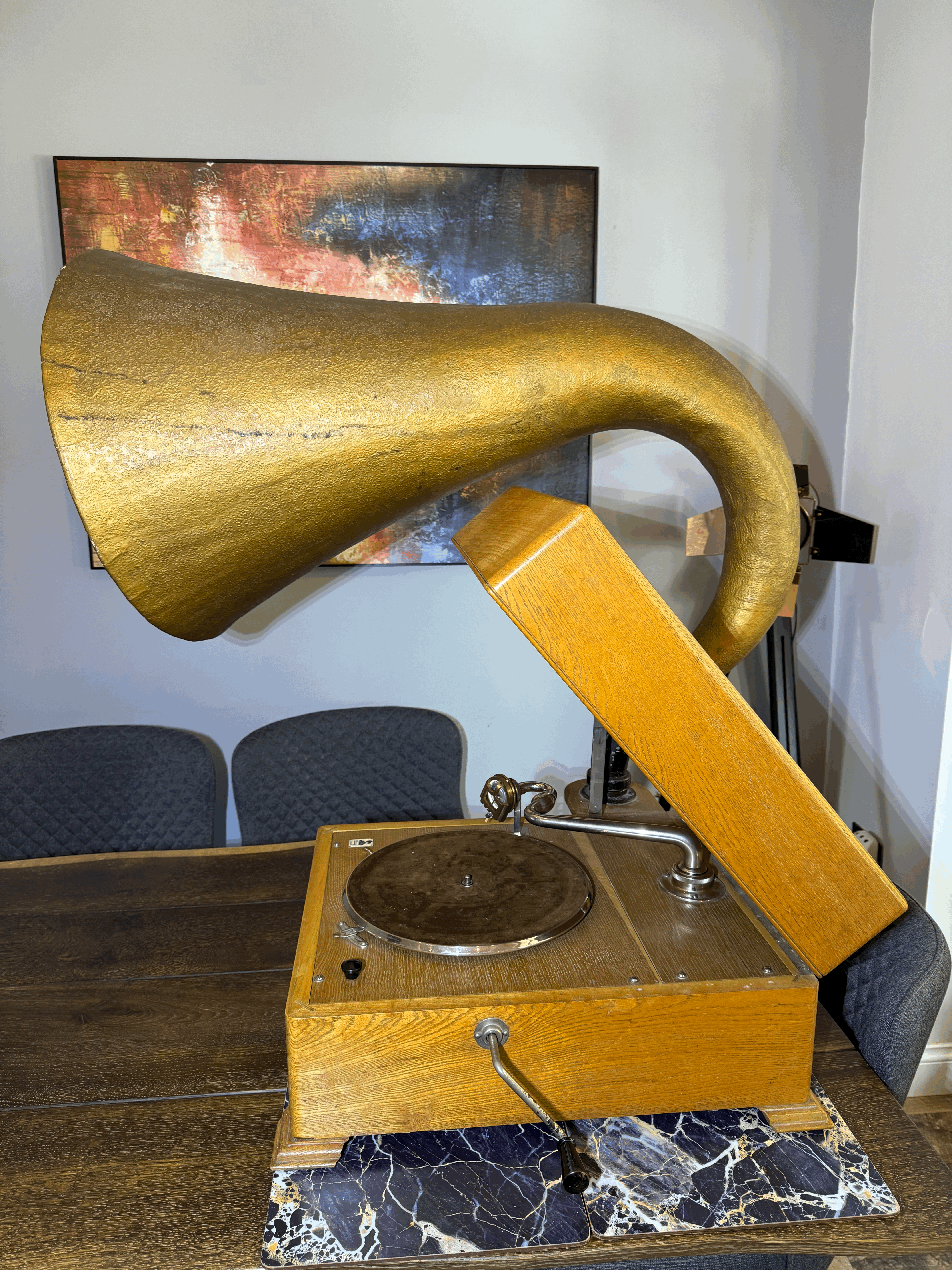 I'm not versed in these machines, but in my humble opinion, it caught my eye. It looks too me as one of the most beautiful I've seen among these monsters... Perhaps it looks like it carries its enormous horn with pride, not drooping at all, and in this discrete colour which to my taste goes well with that of the cabinet. I considered bidding, but the costs of transport and the possible super taxes to pay in imported goods, VAT, etc made me cringe... I've recently bought two big hmv springs and 5000 steel needles, and I had to pay 33% (90€) extra for vat and import taxes...!