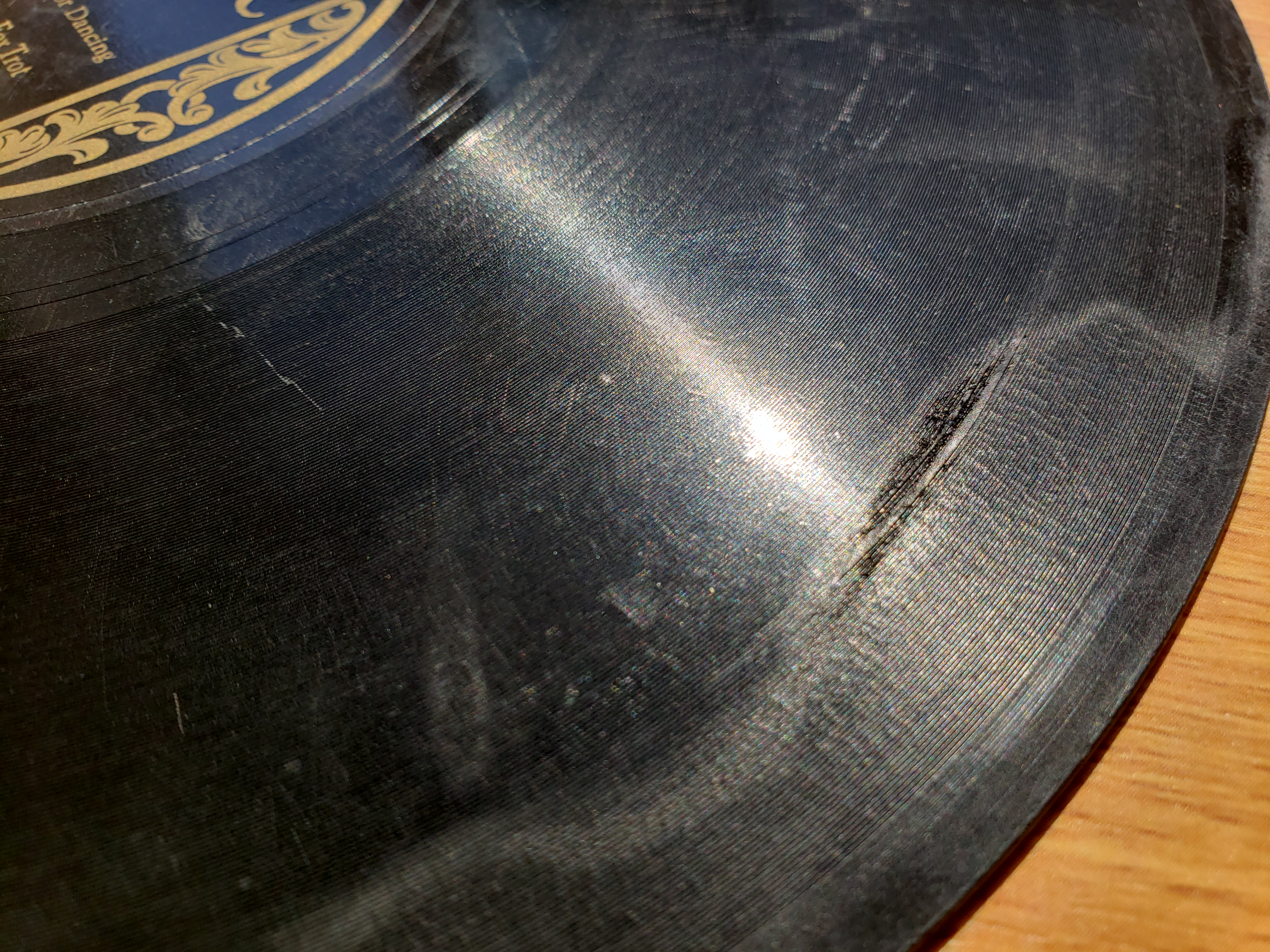 Fortunately, the record played just fine (it was also in pretty good playing shape, with very quiet surfaces and really no groove graying). Well, it did, for the first two dozen plays. Eventually, a spot on the heat damaged area (see images) got carved out by the needle (I was playing it on my Victrola, so I'm not entirely surprised), and now there is a 4-second skip about 0:45 into the song on the B-side (my favorite side, too!). It appears that with each play, it gets a little bit more damaged on that spot than beforehand.
