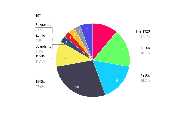 The main collection is ⅔ Jazz/ early Swing to ⅓ classical/ opera. Sub collections include Pathé splatters, Royal Blue Columbias, American Parlophone/ Odeon issues, Gennett "GE" and New Electrobeams, QRS, Gem (Crown) issues, 12" popular series 1923-35, Victor Batwing blue and red label symphonic sets, Columbia Flag symphonic sets, and Columbia Flag electrics.