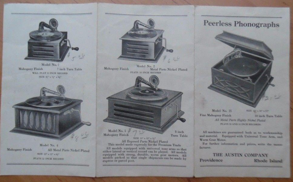 Manufactured by The Austin Company of Providence, Rhode Island, it was marketed a Peerless phonograph.