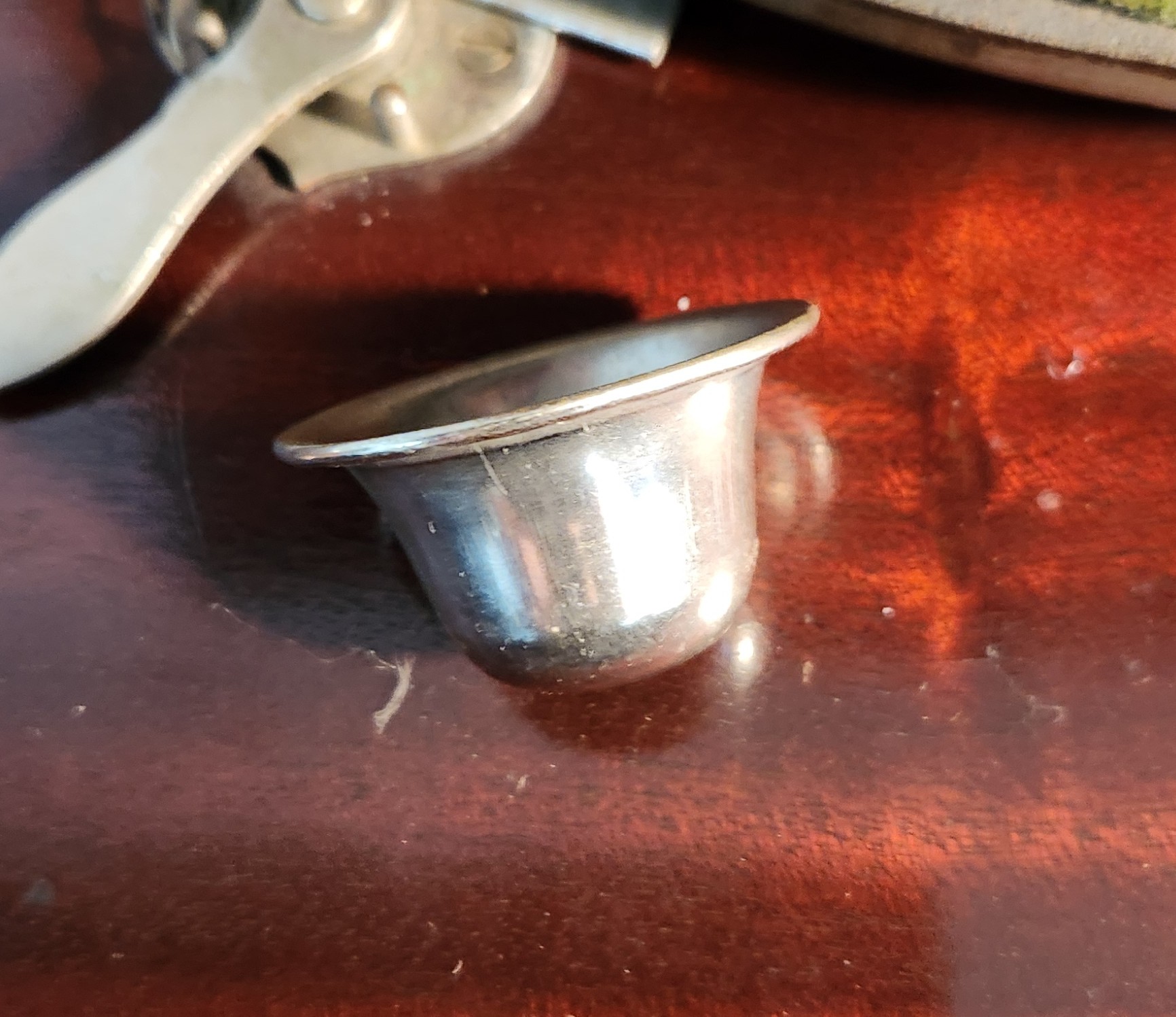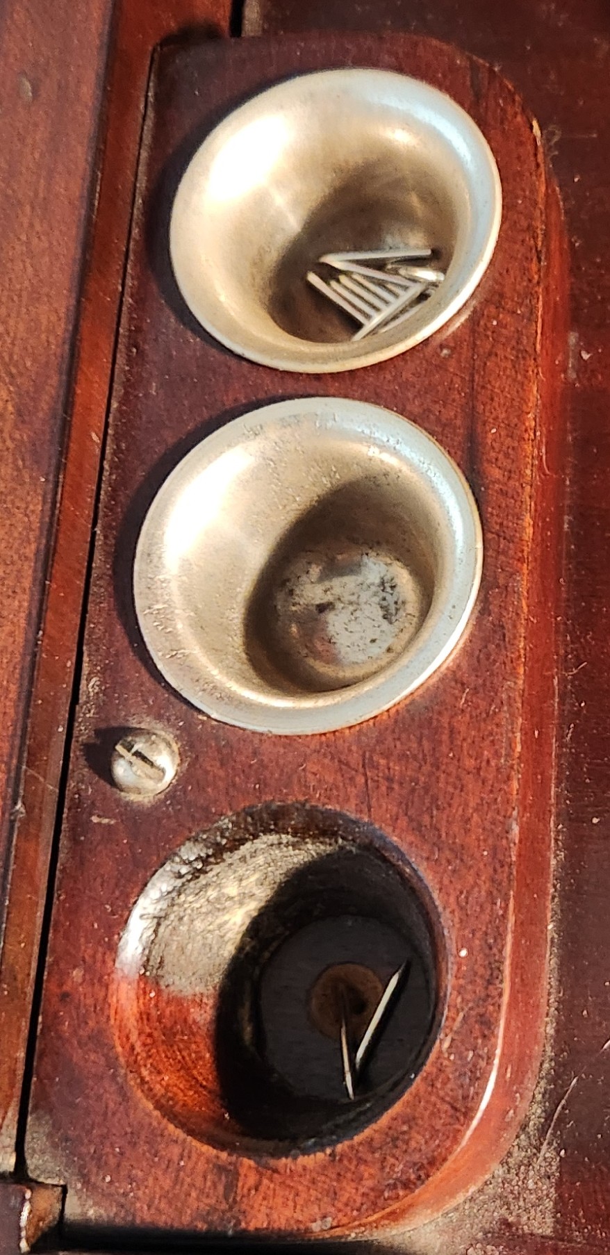 See pictures. Nickle plated, prefer the partly covered one for used needles. The hole is 1 ¼", but is more shallow and tapered that some I've seen.